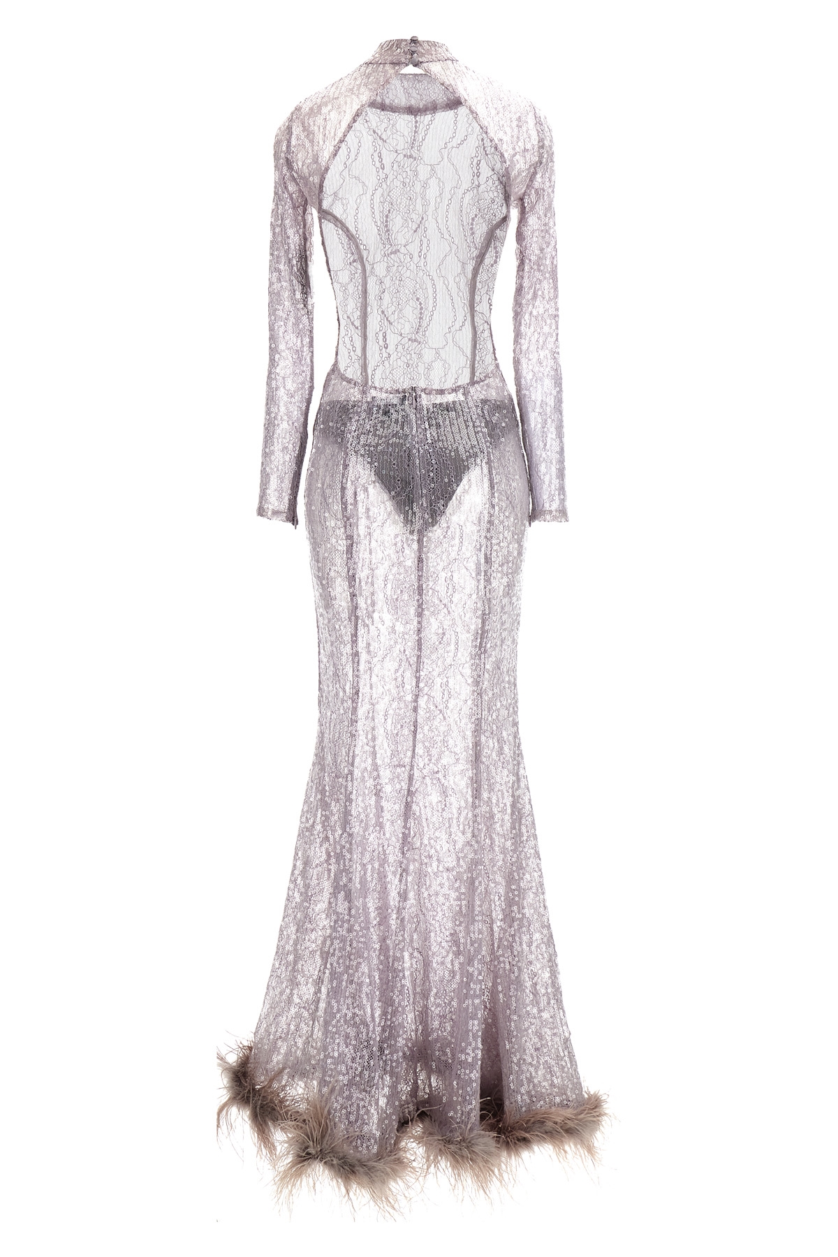 Long 'Lenora' dress in transparent fabric with all-over embroidery and sequins, neck fastening and back zip, bare back, long sleeves, and feather application on the hem.
