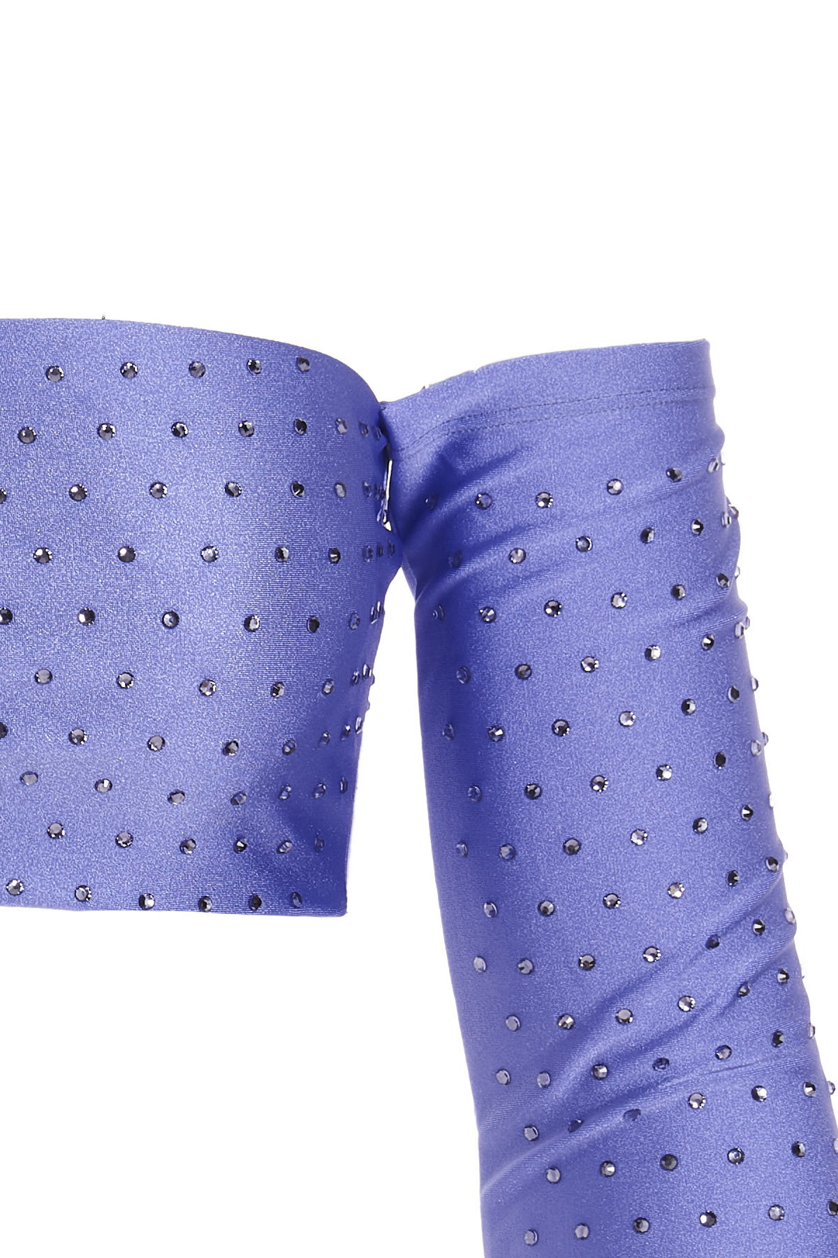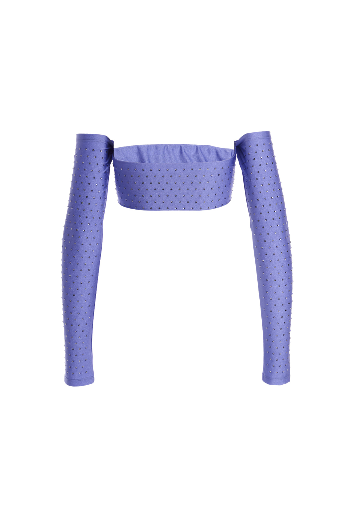 Off-the-shoulder, cropped top in stretch shiny lycra with crystal embellishment, long sleeves.s.
