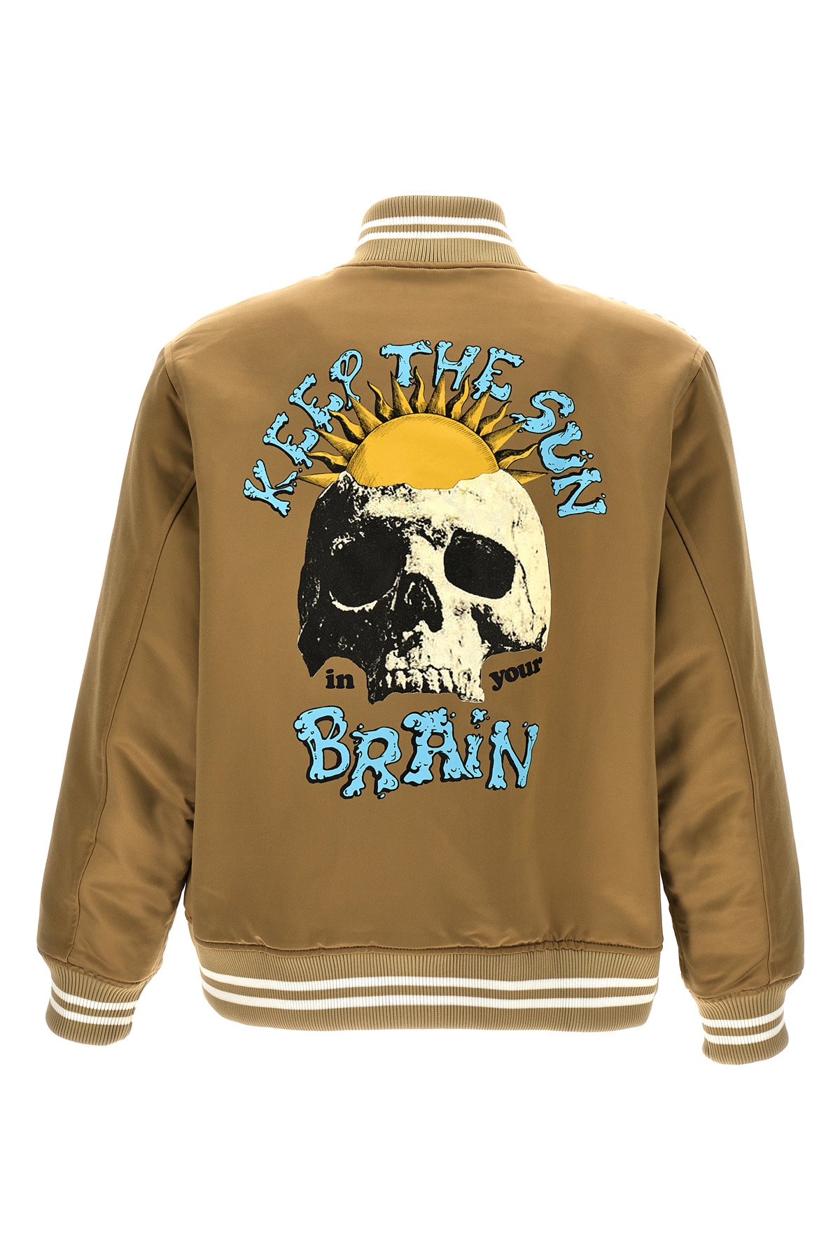 'Keep The Sun In Your Brain' satin bomber jacket with front logo and back print, button closure, pockets, long sleeves with knitted cuffs.