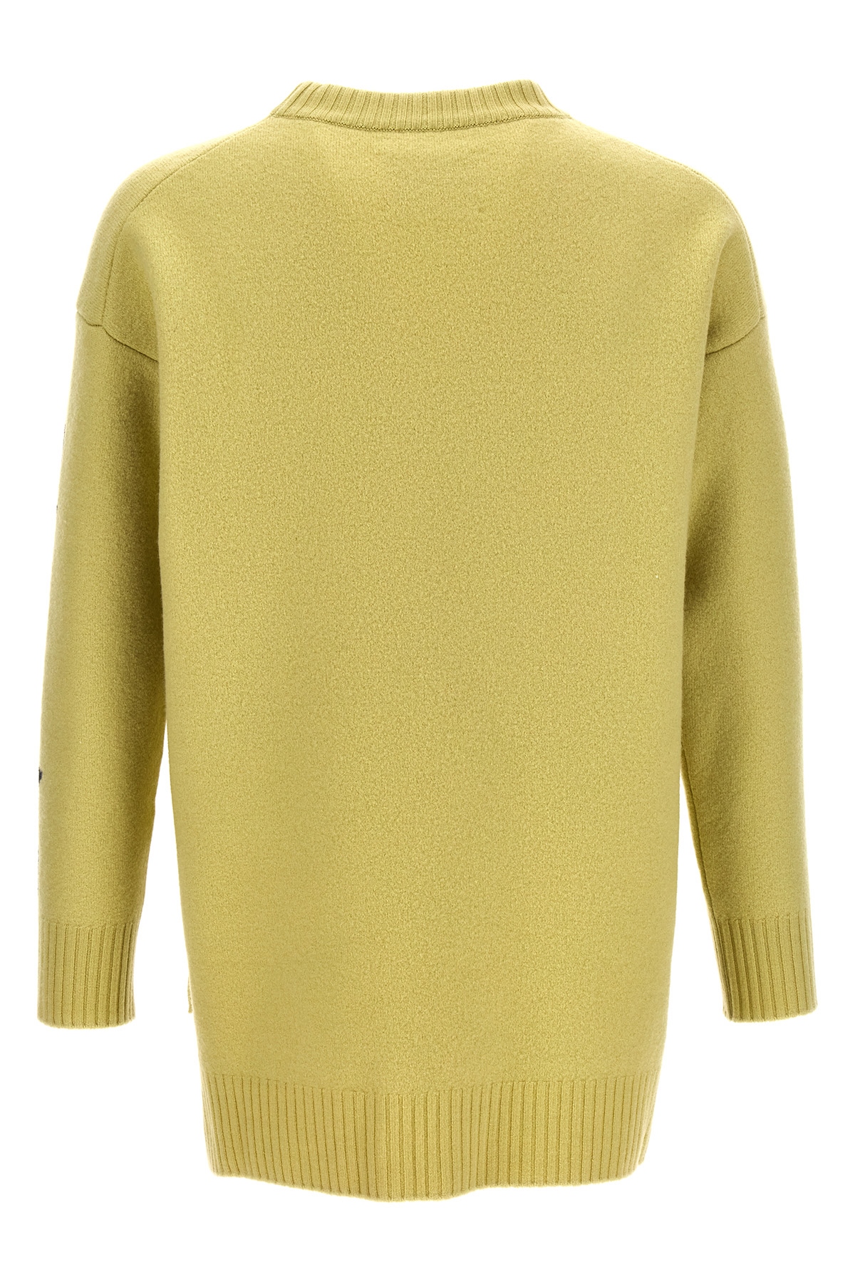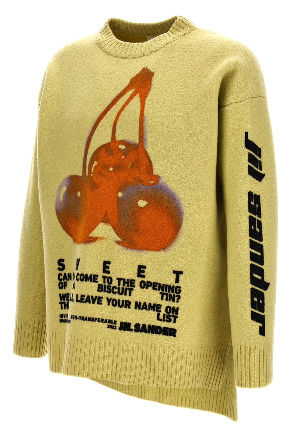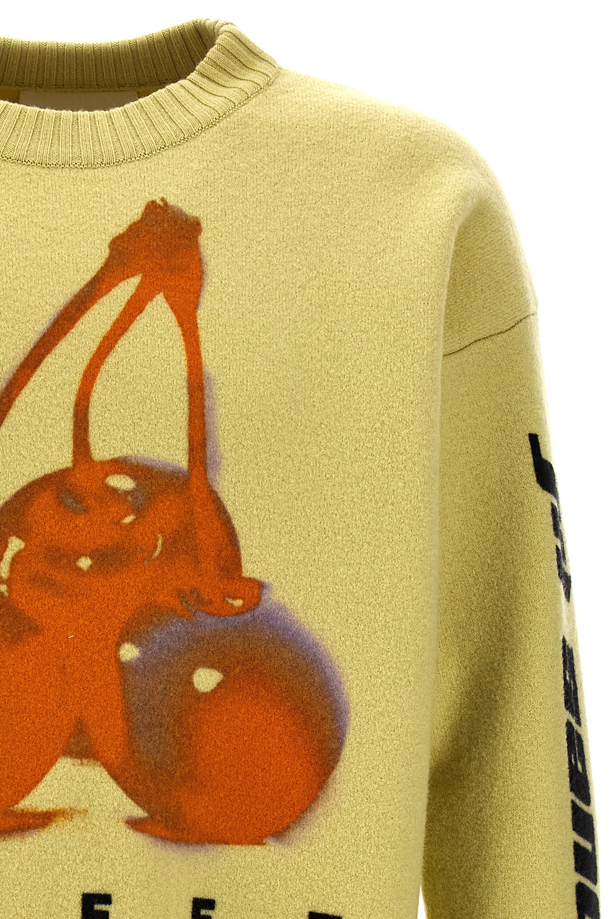 Wool sweater with 'Fashion Show Invitation' print, crewneck, long cuffed sleeves, side splits.