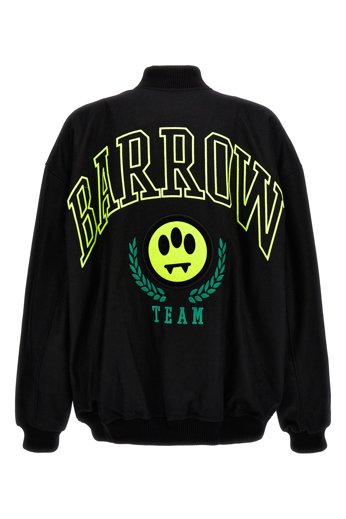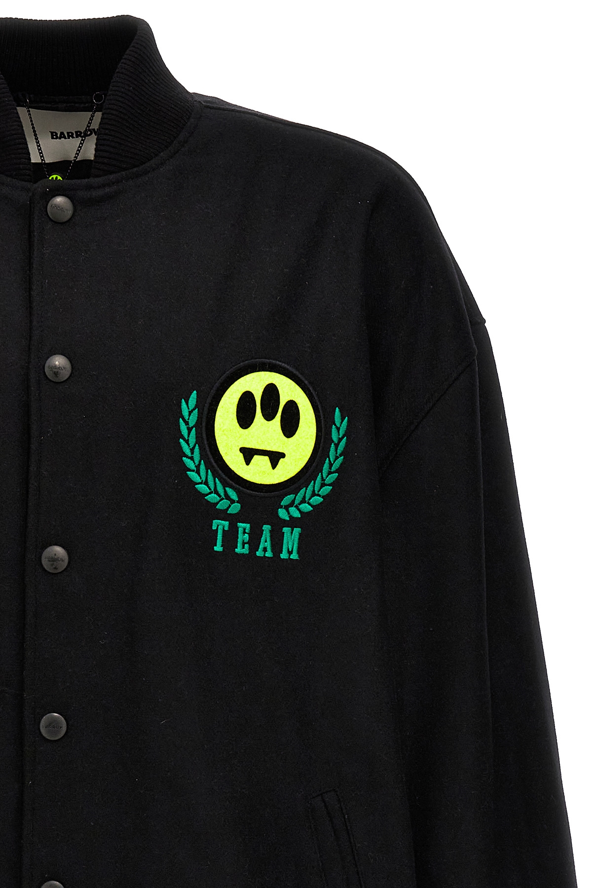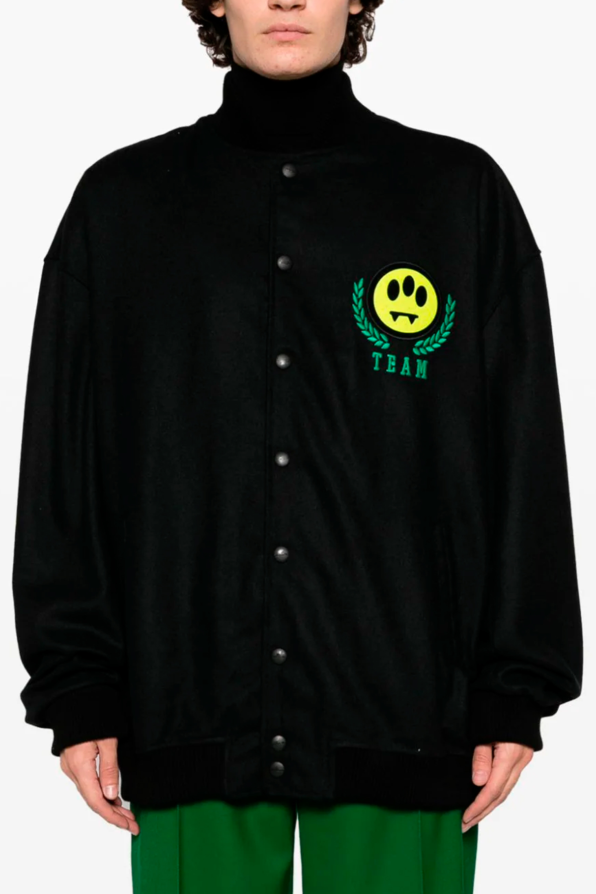 Wool blend bomber jacket with embroidered logo on the front and back, pockets, long cuffed sleeves, and button closure.
