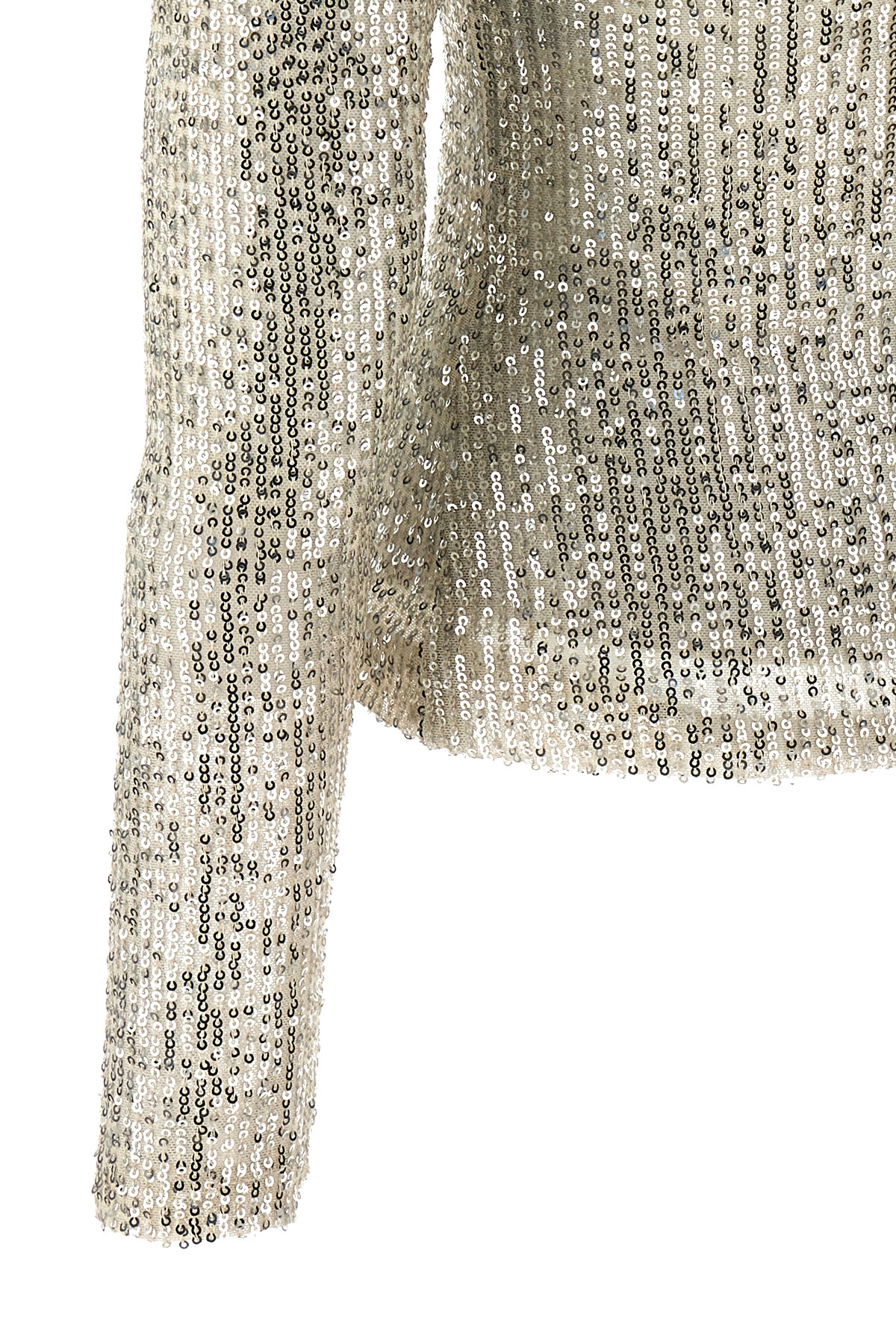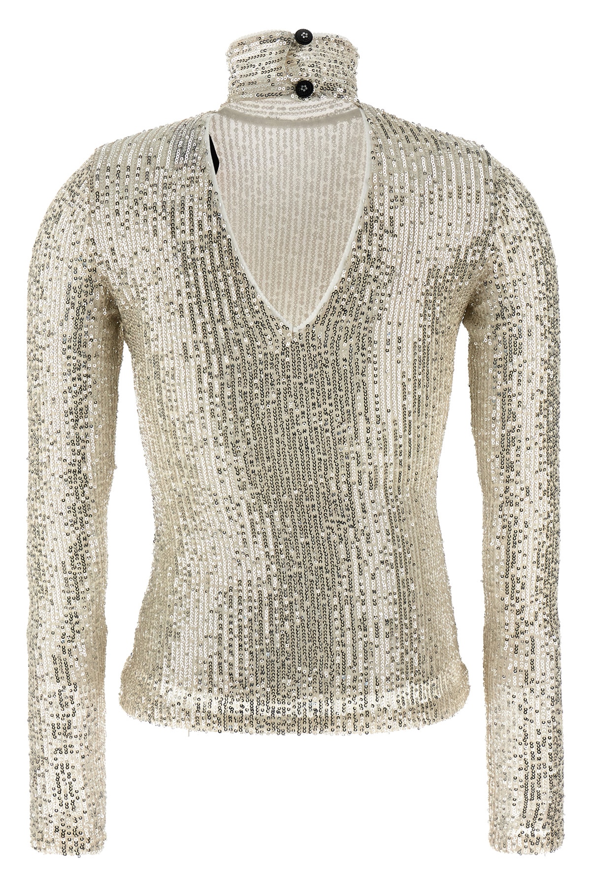 'Assisi' top with all-over sequins, high neck, long sleeves, cut out detail at the back.