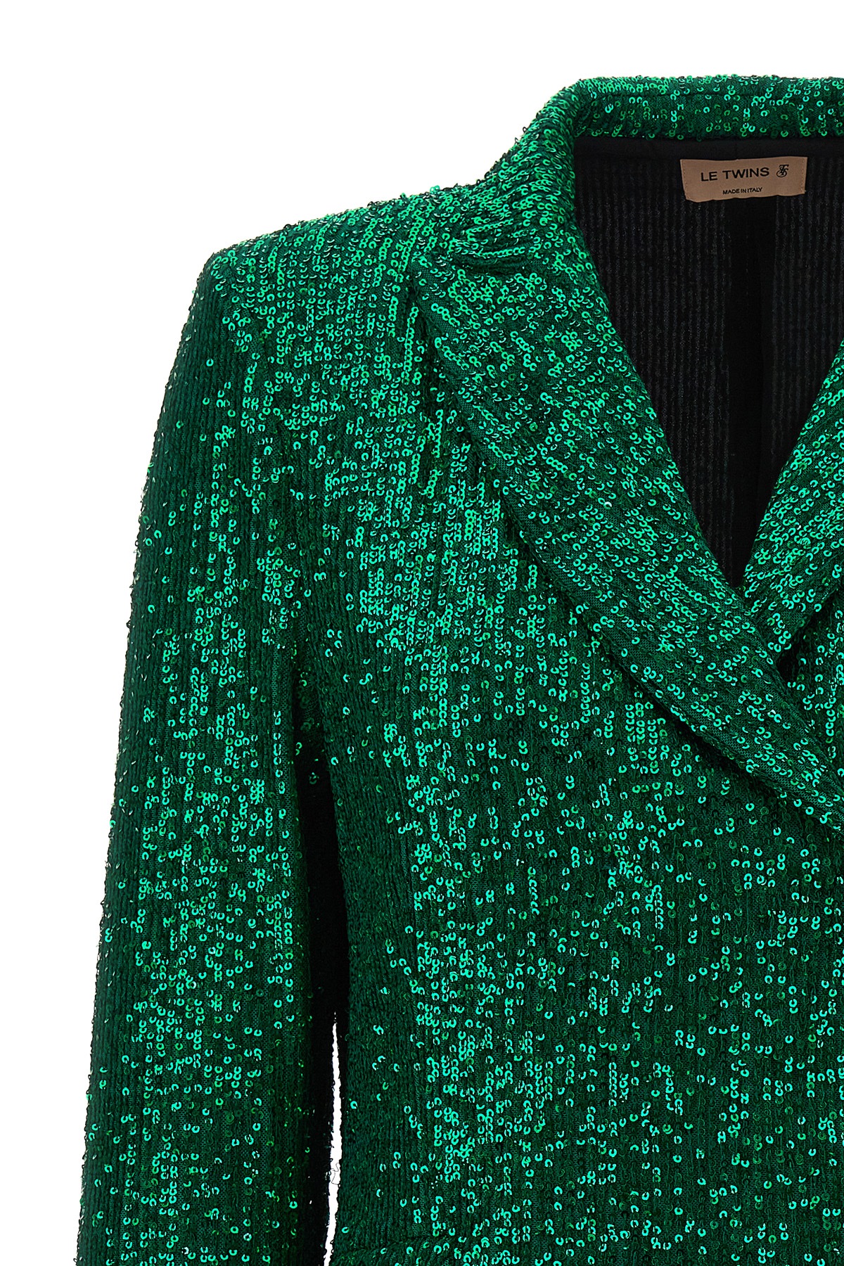 'Como' double-breasted blazer with all-over sequins, button closure, pockets, and long sleeves.