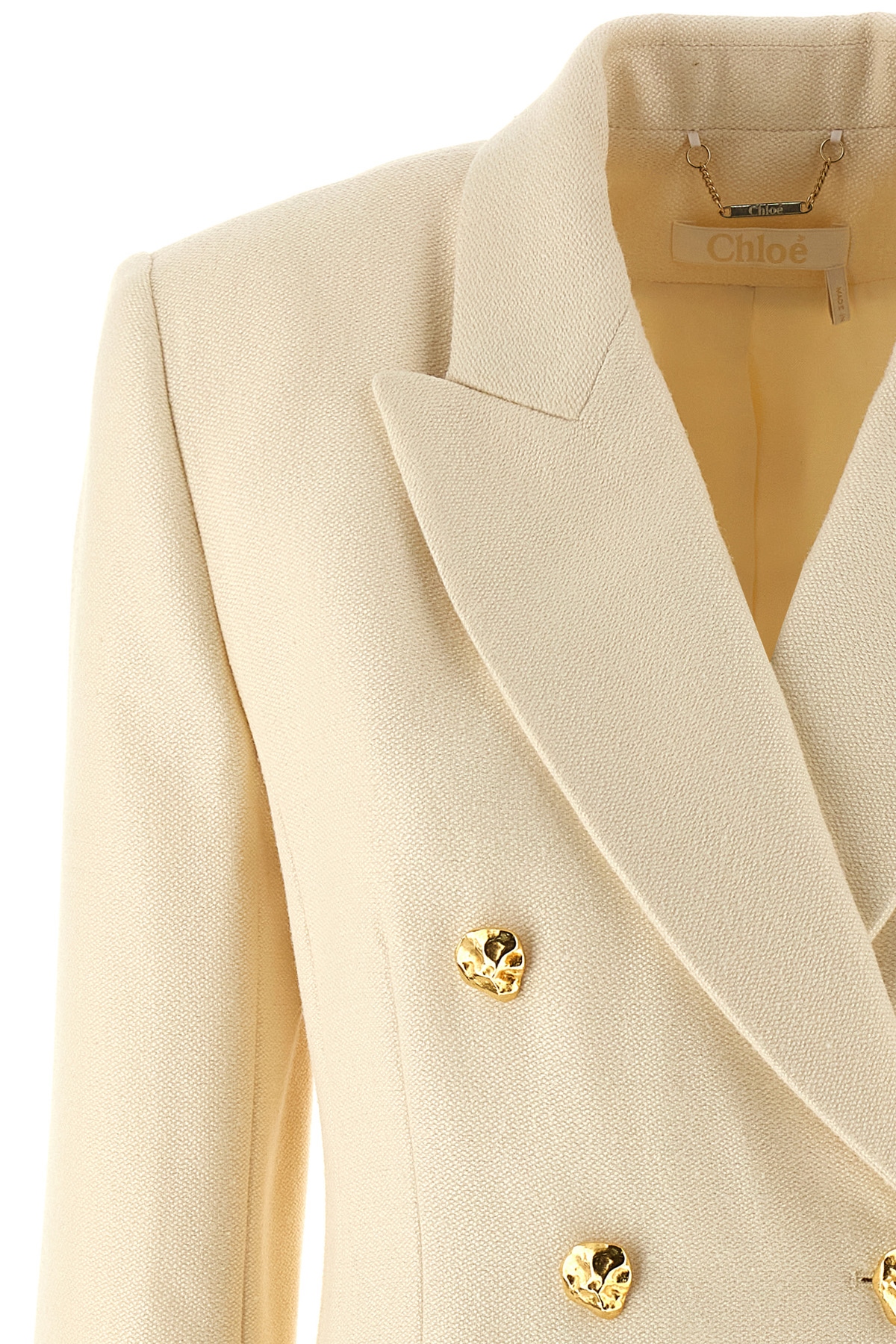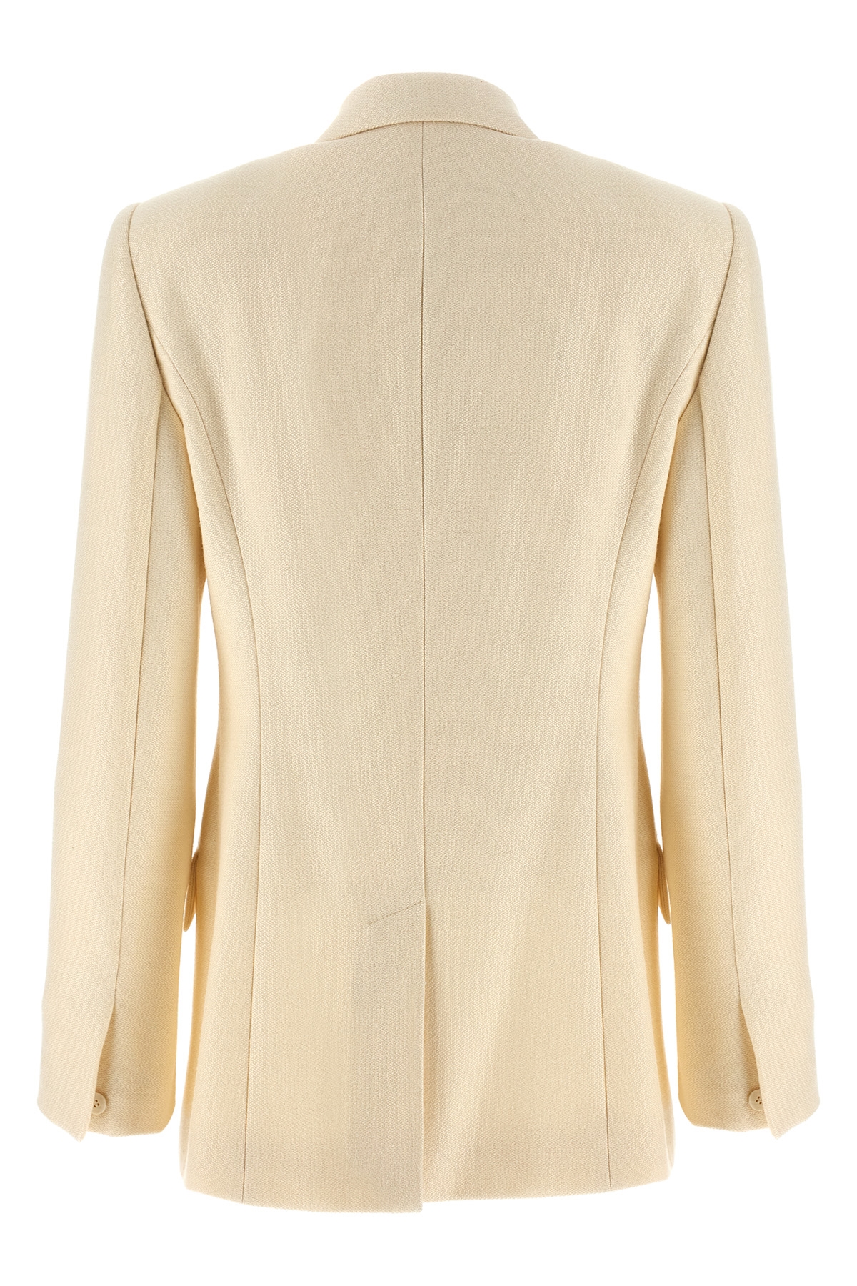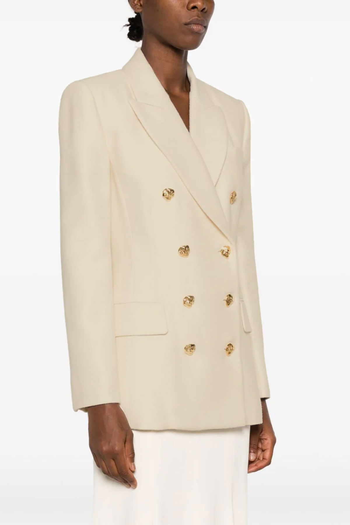 Double-breasted blazer in wool and silk blend with shaped metal buttons, flap pockets, and peak lapels.