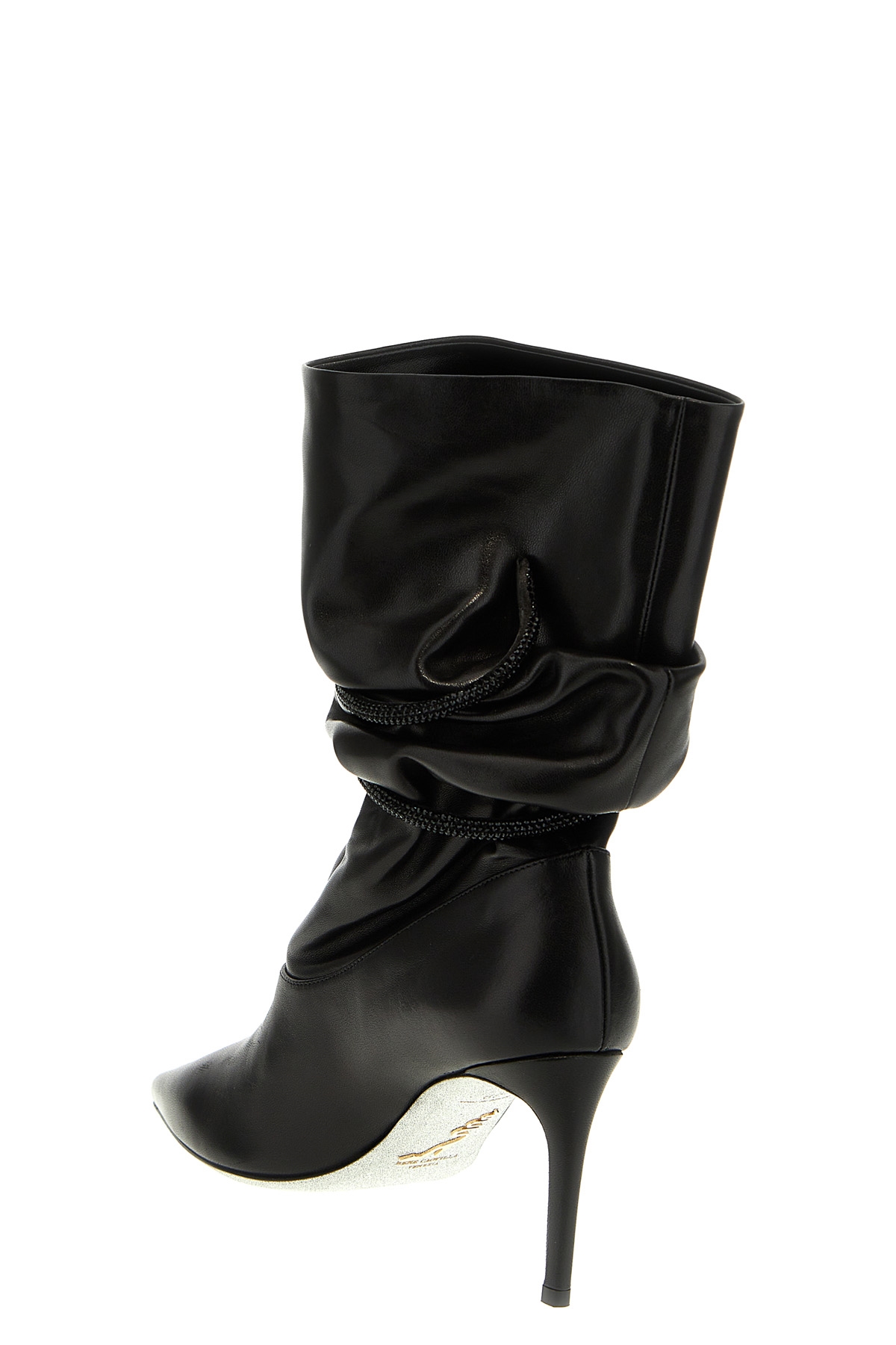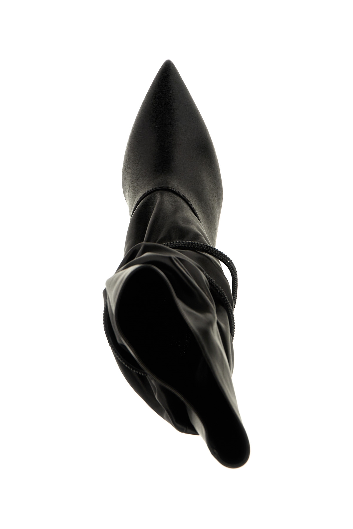 Nappa ankle boots with rhinestone applique, pointed model, stiletto heel.