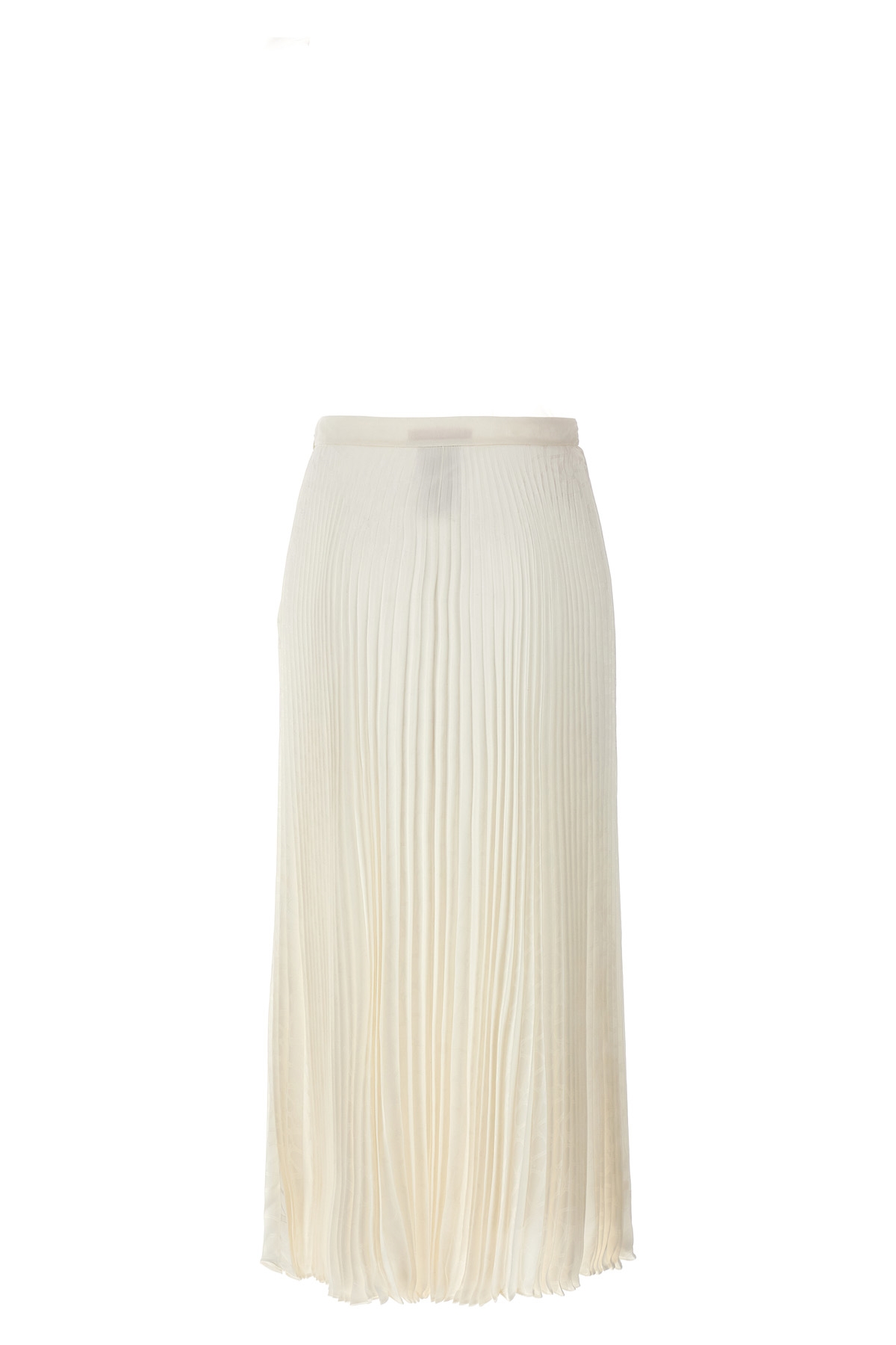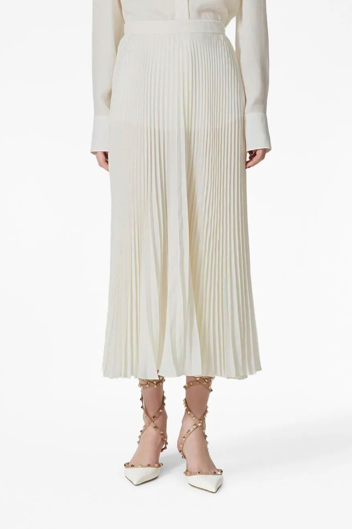 'VLOGO' pleated midi skirt in silk with all-over logo.