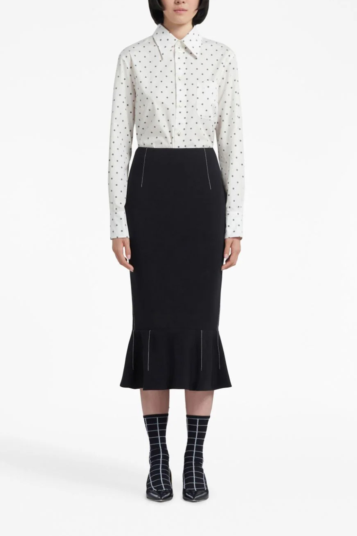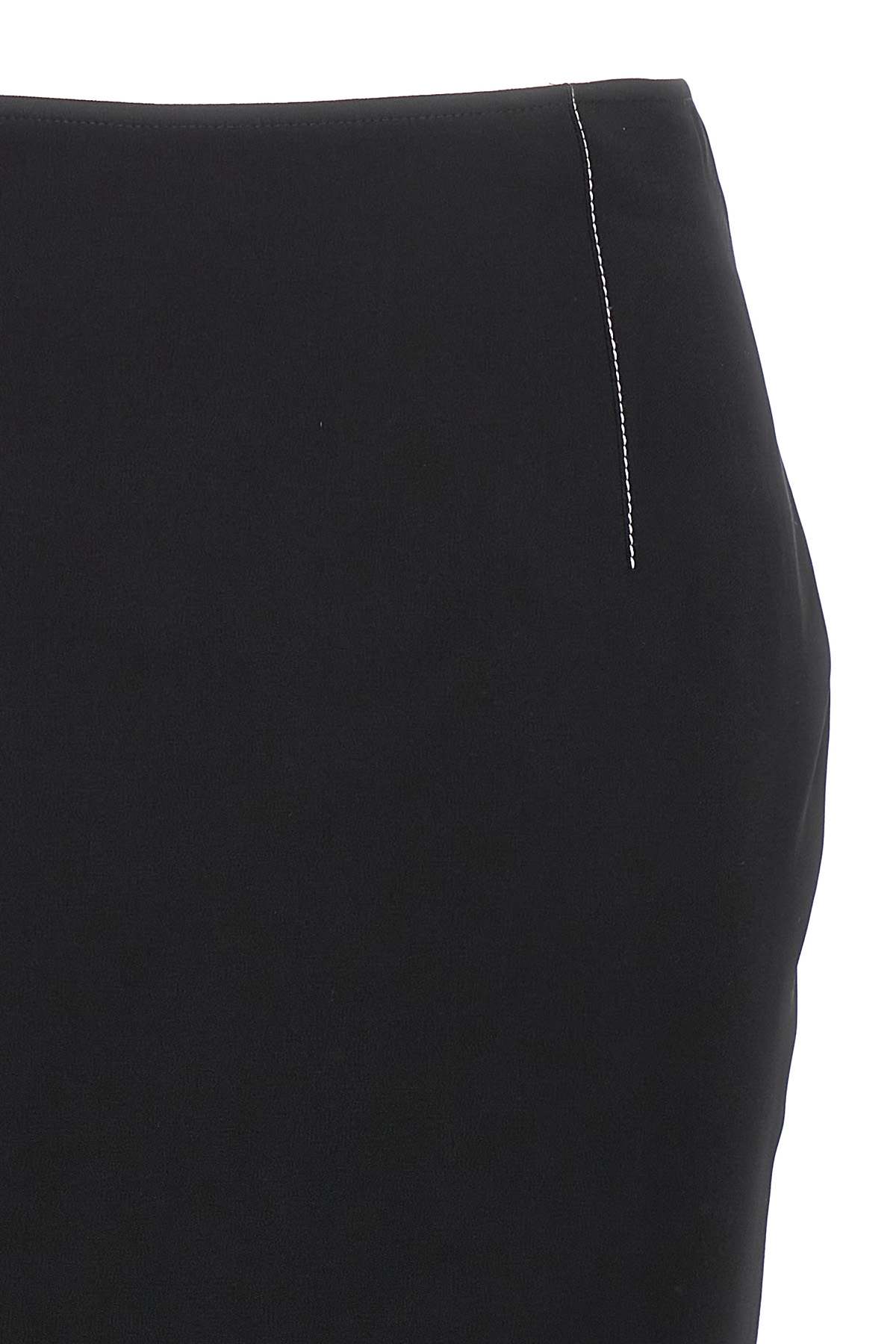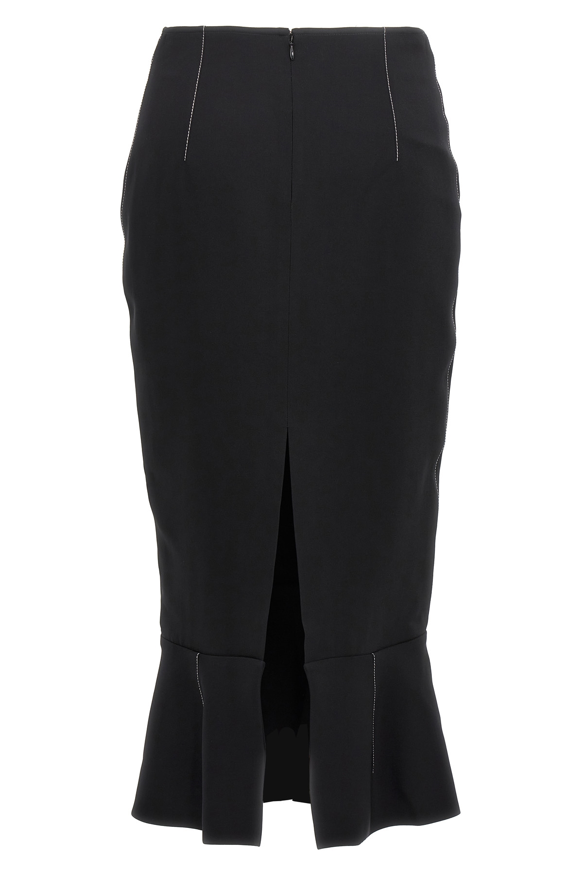 Stretch viscose sheath skirt, back zip closure, contrast stitching, back split.