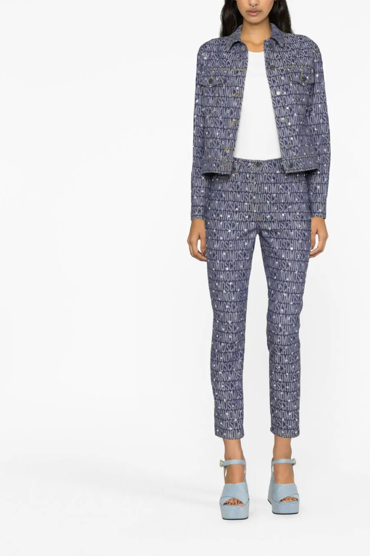 Cotton denim blend jacket with all-over 'Logo' pattern, rhinestone applique, button closure, pockets, long sleeves with cuffs.