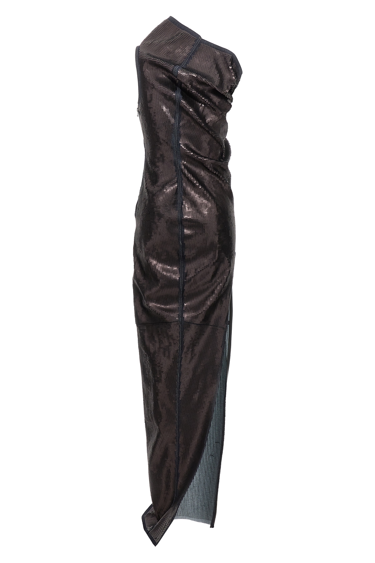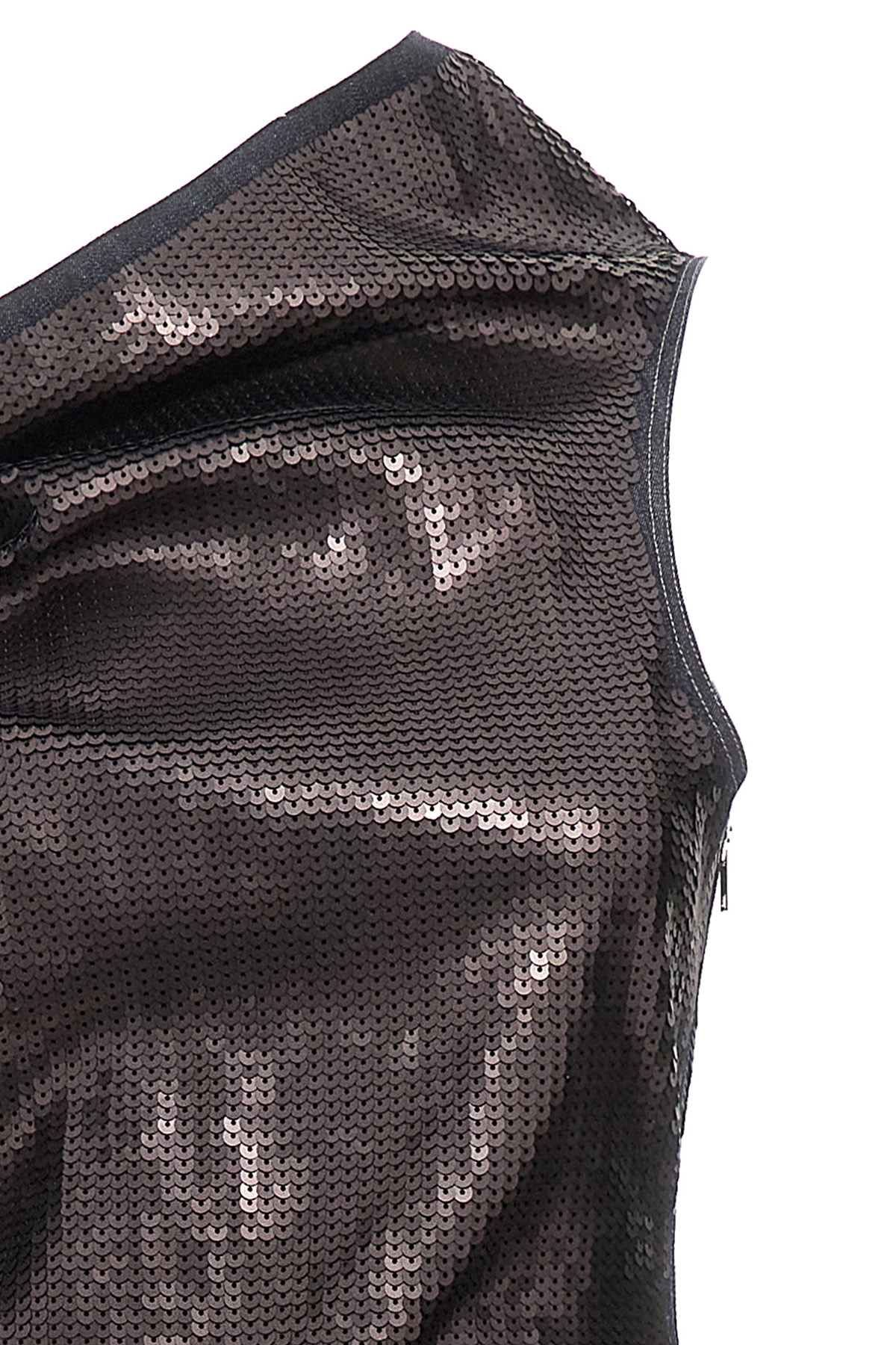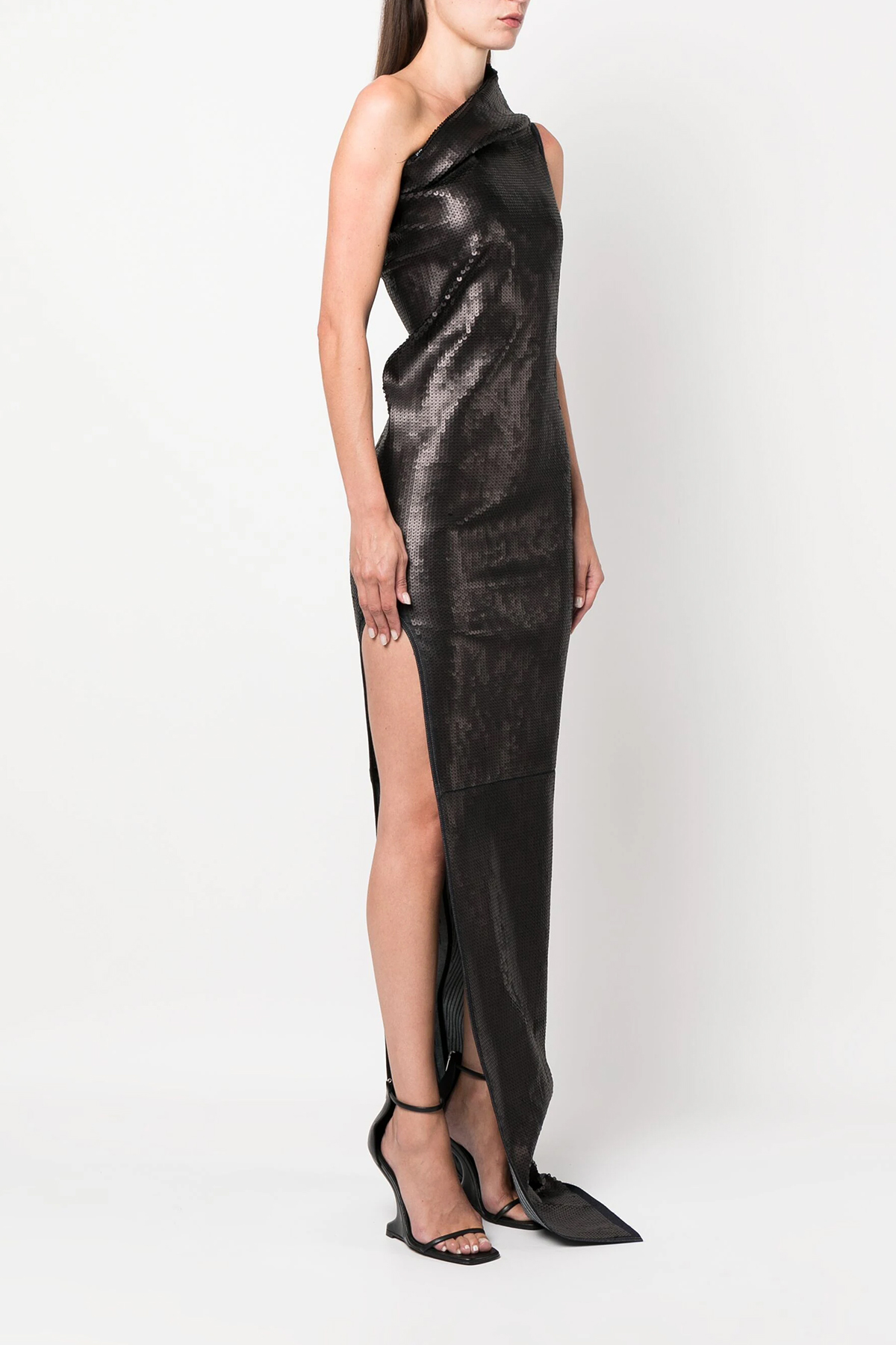 Long 'Athena' denim dress entirely covered in sequins, one-shoulder model with deep split.