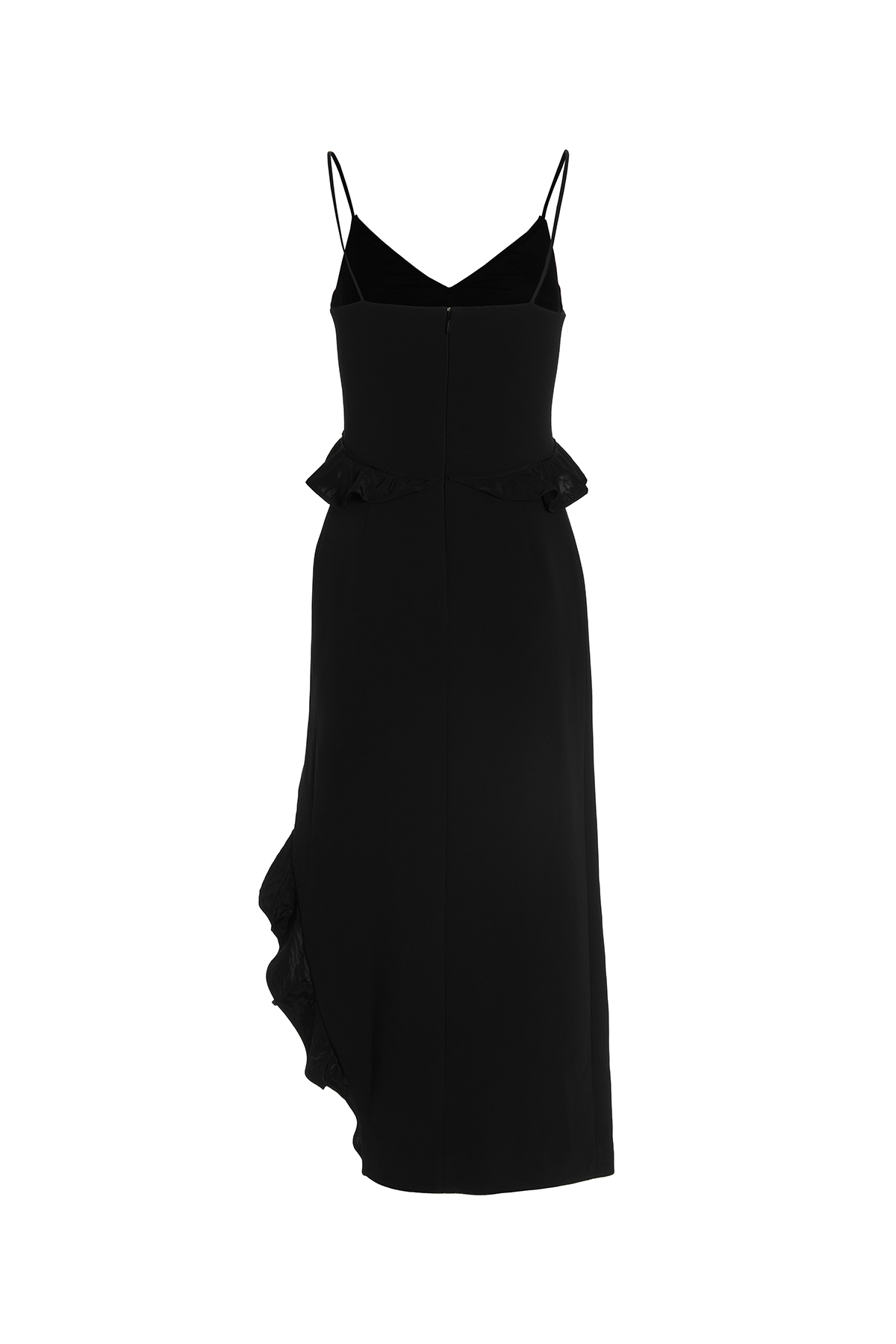 Crossbody & Open Leg Ruffle Detail' viscose blend dress with V-neck, ll-over ruffle detail, wide front split, thin straps and a back zip closure.