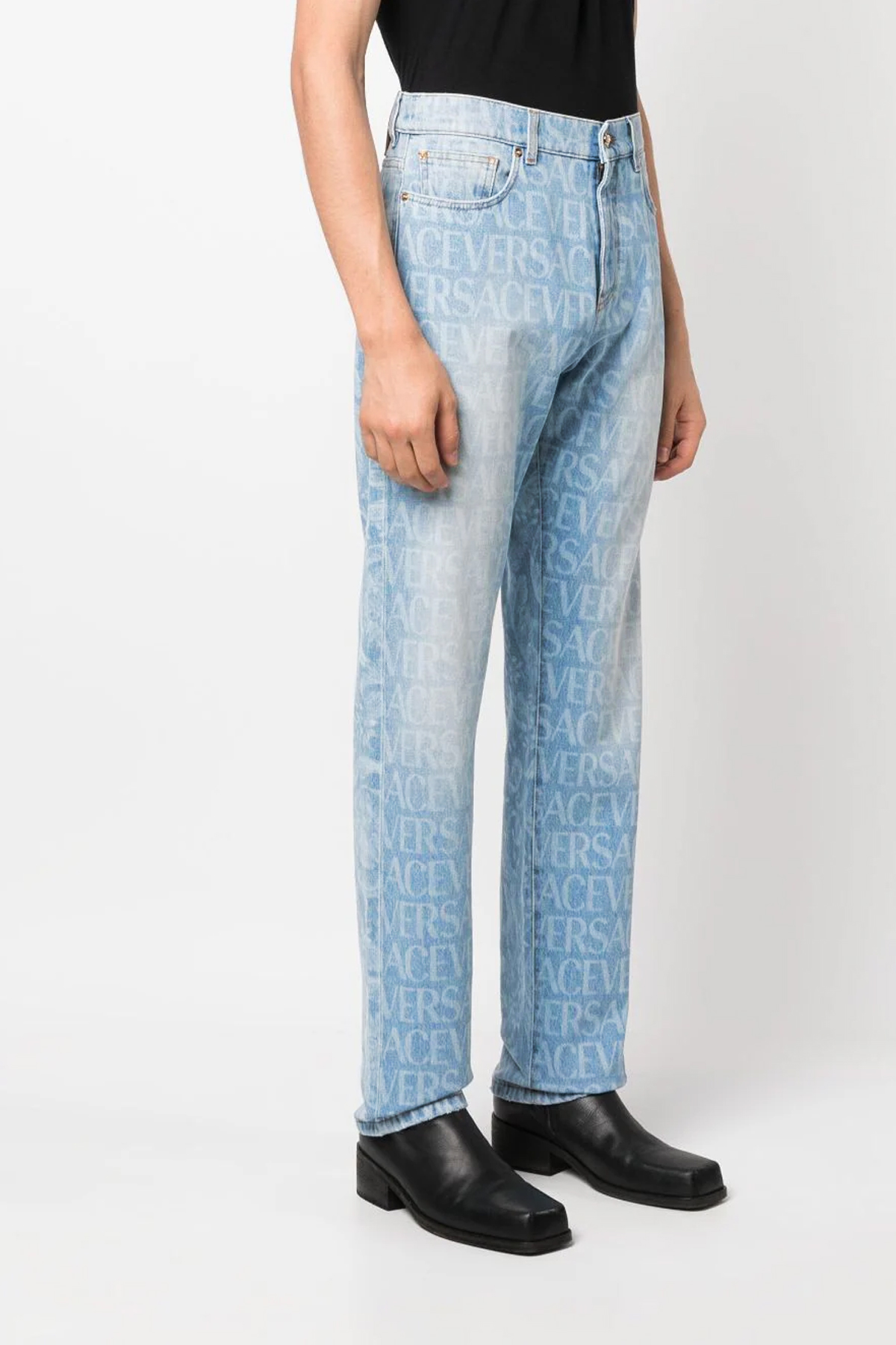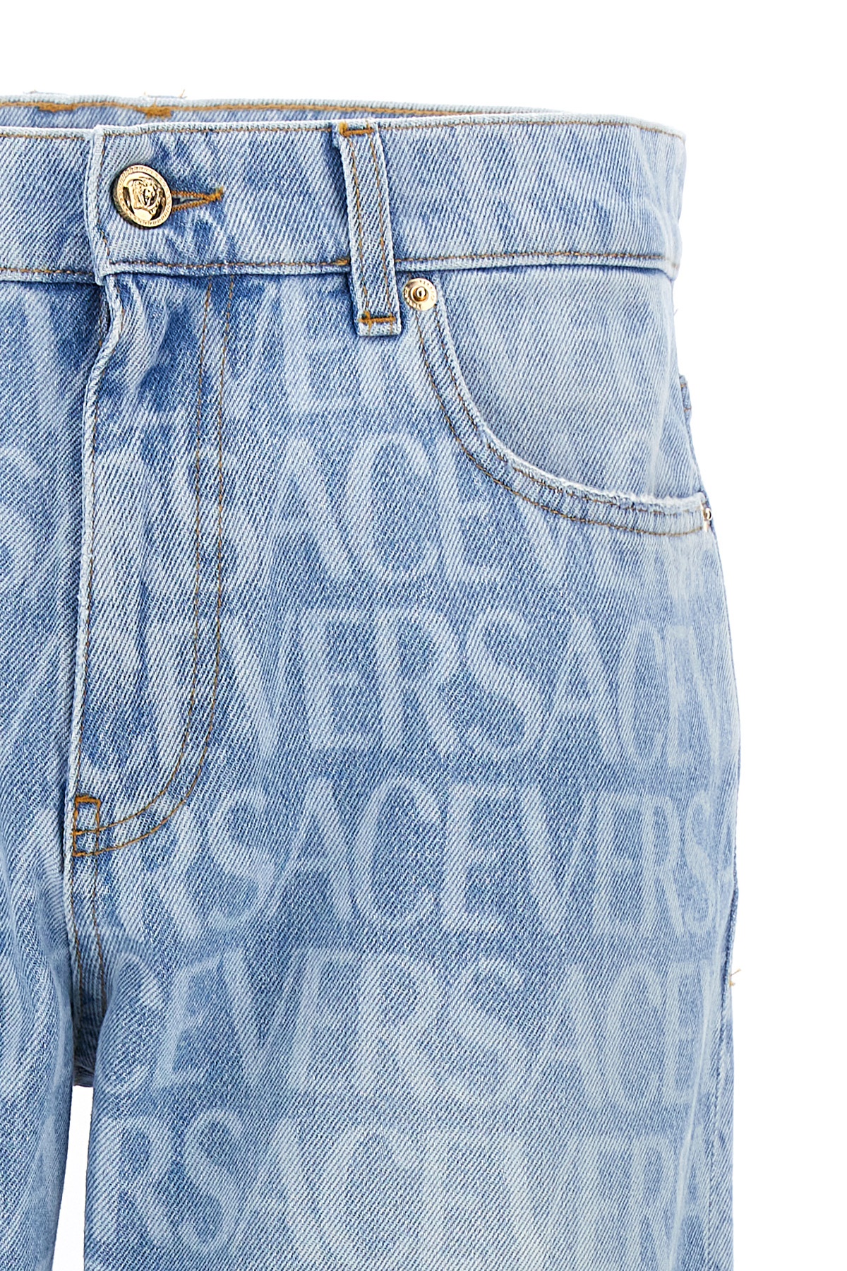 Cotton denim jeans with 'Versace Allover' pattern on the front and a 'Barocco Silhouette' pattern at the back, zip and button closure, five pockets and used-effect details.