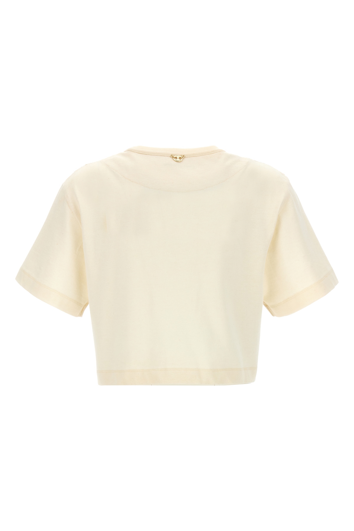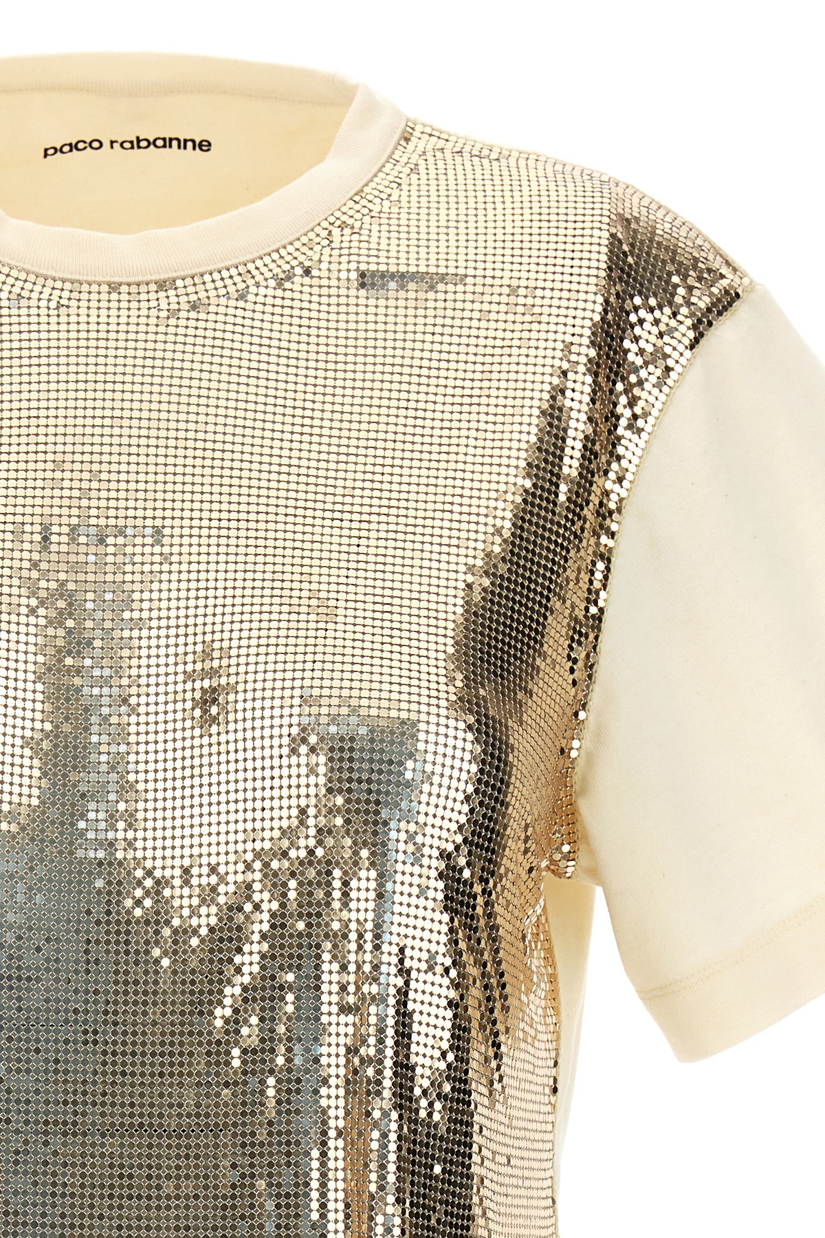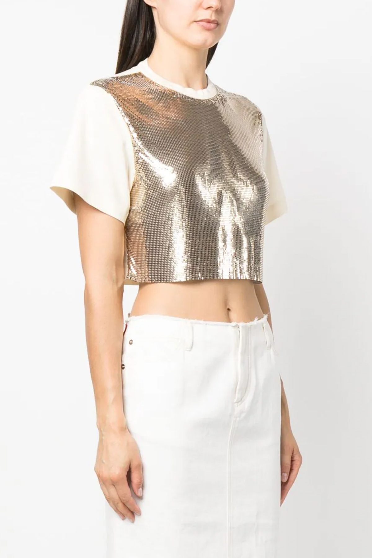 Cotton top with metal sequins on the front, cropped, crewneck.
