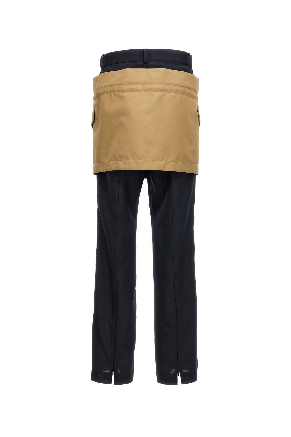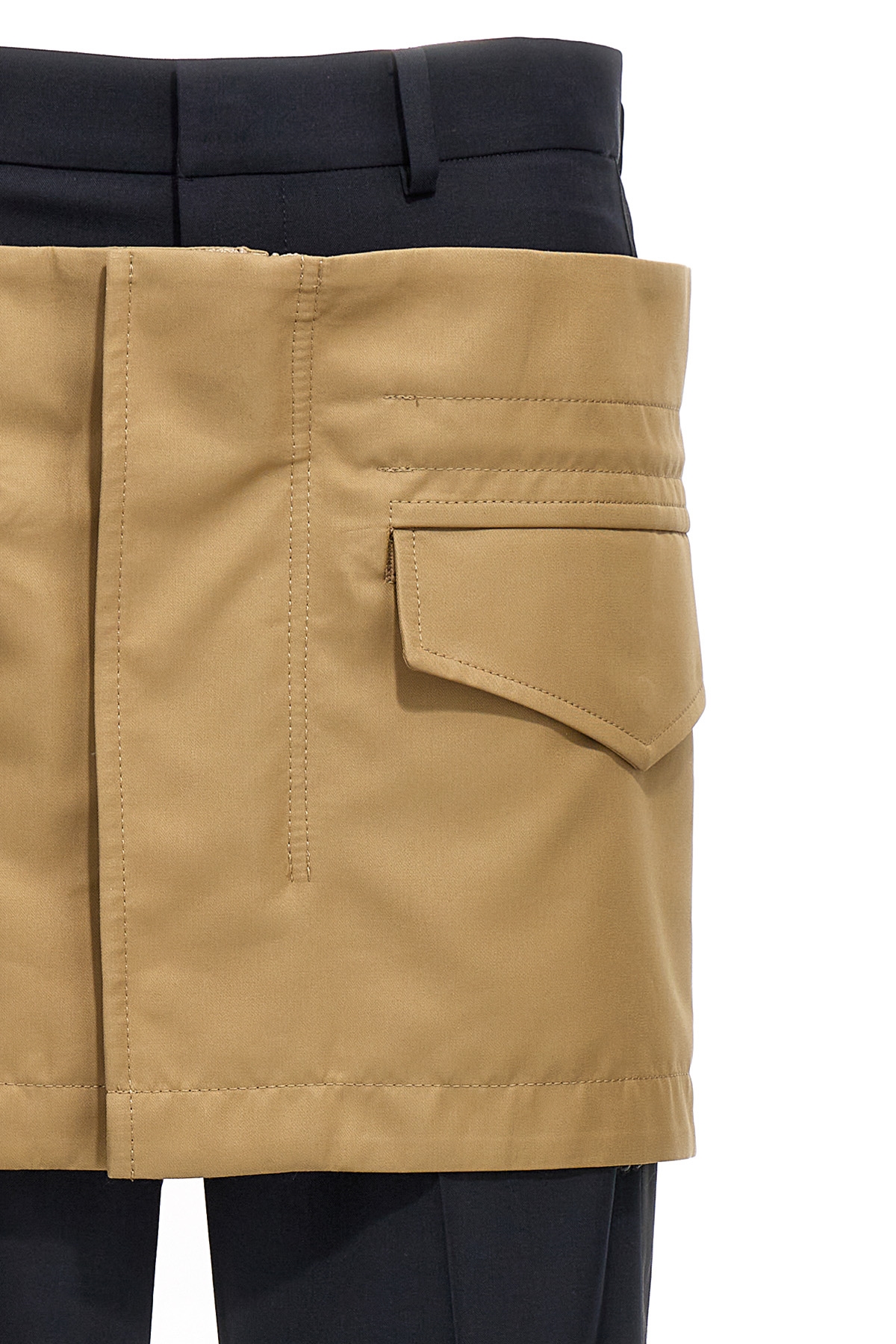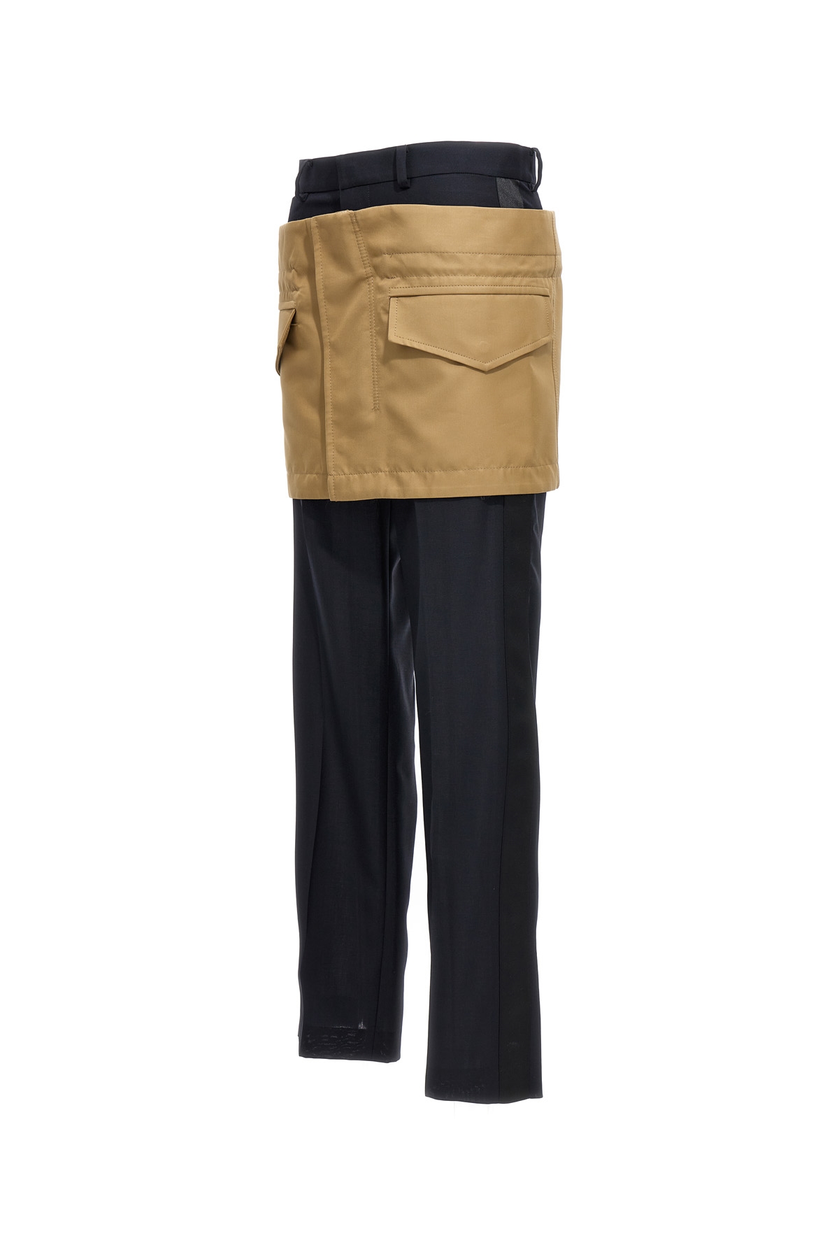 Wool blend pants with zip and hook closure, contrast satin side bands, contrast miniskirt insert with pockets and a button closure.