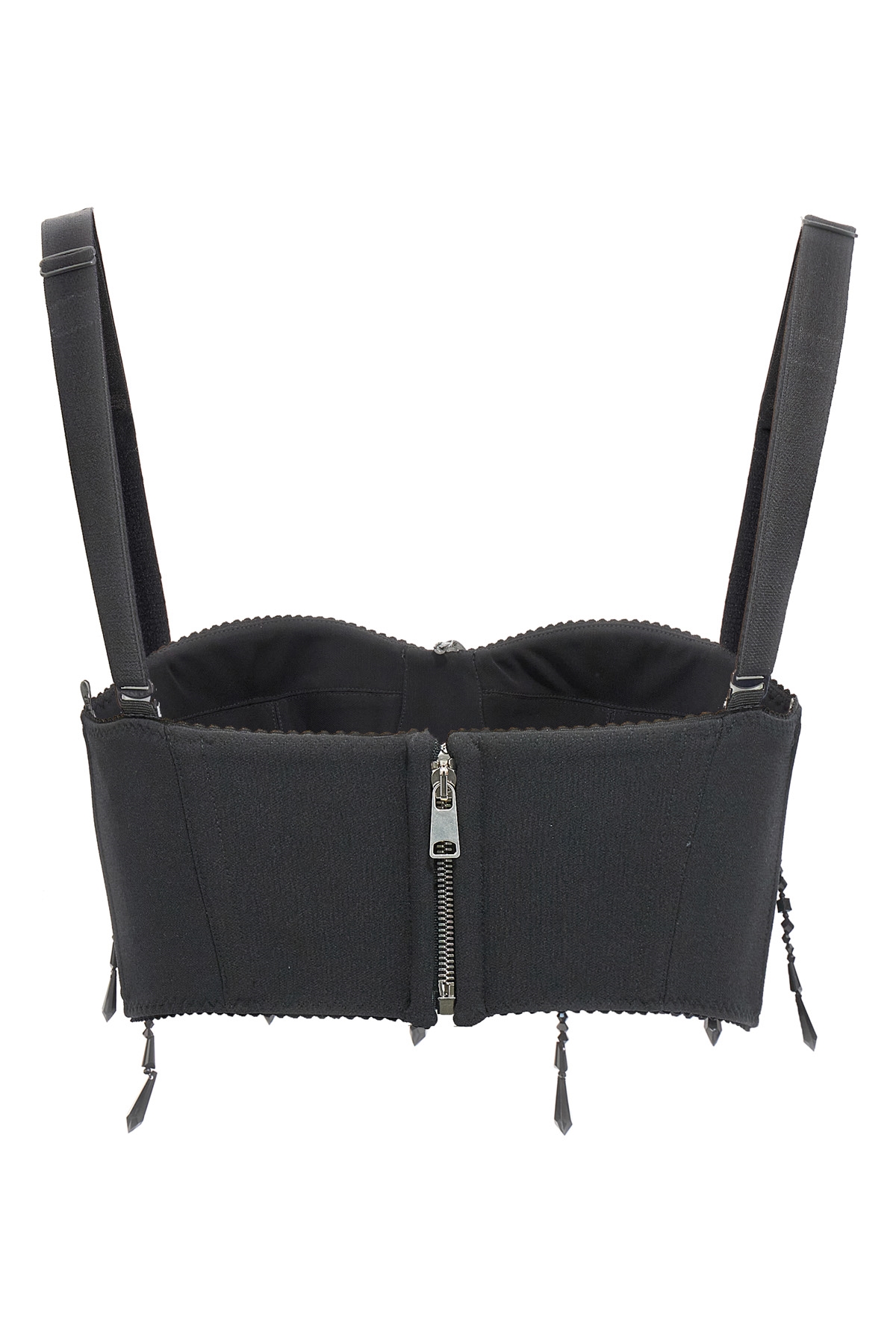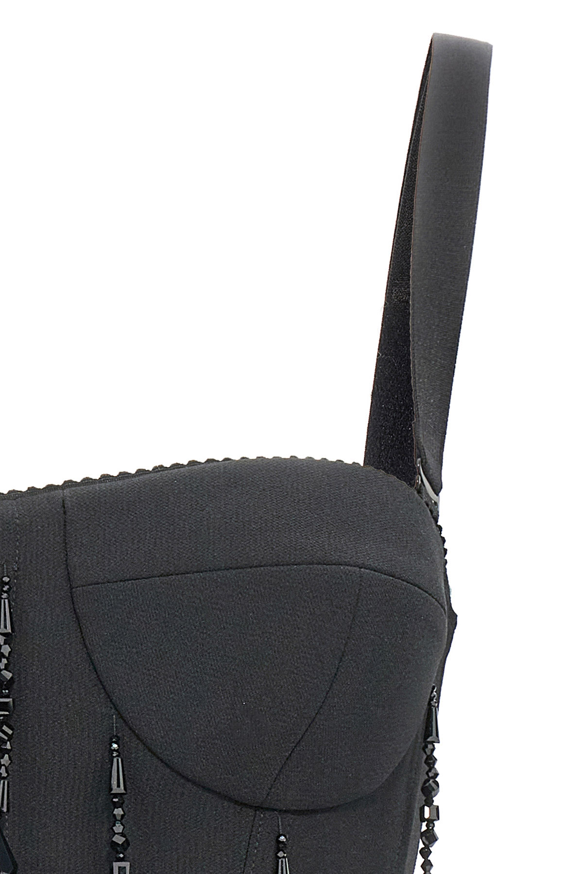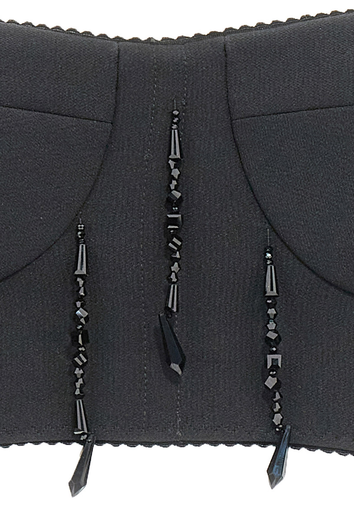 Top bustier modello cropped con applicazione perline pendenti, spalline elastiche e regolabili.