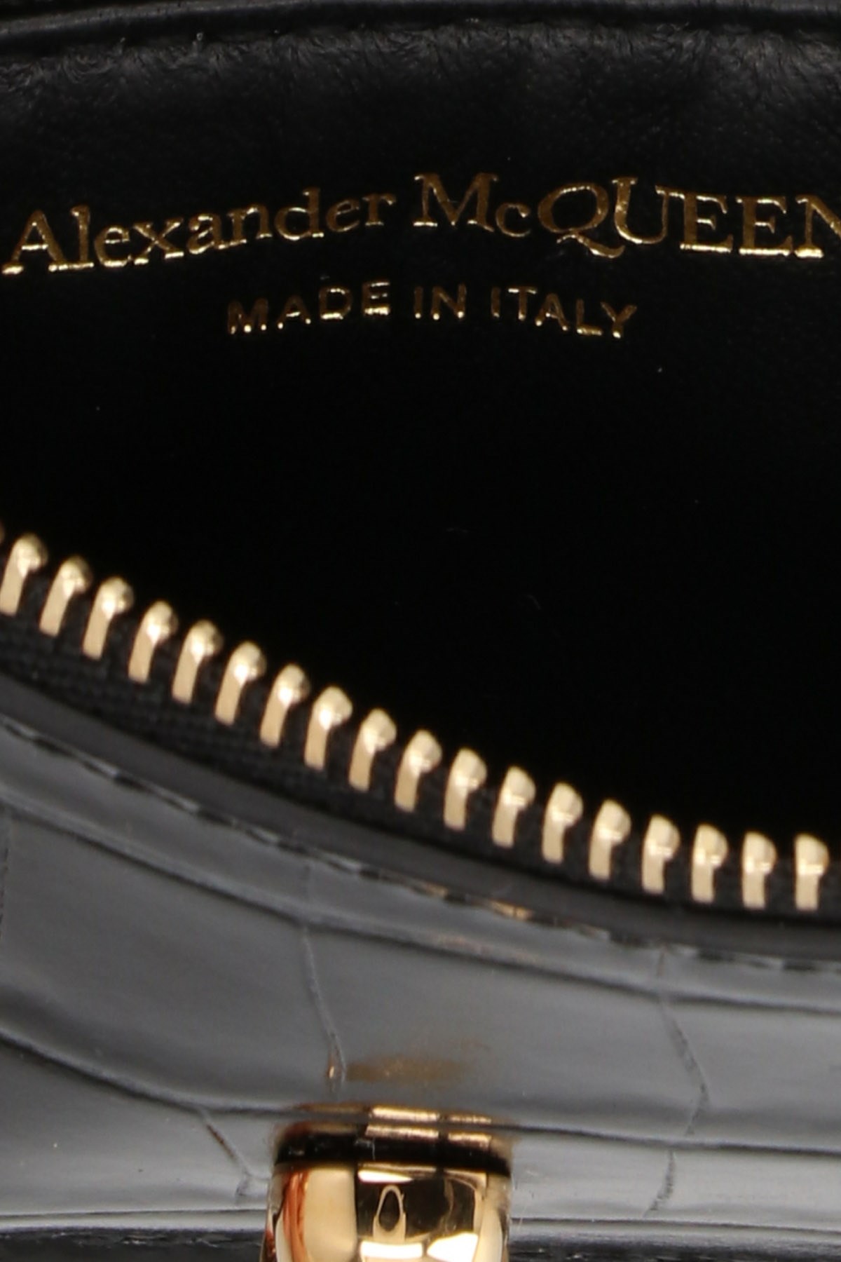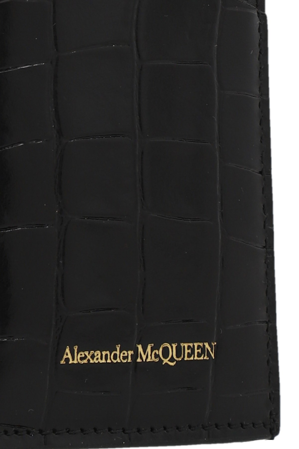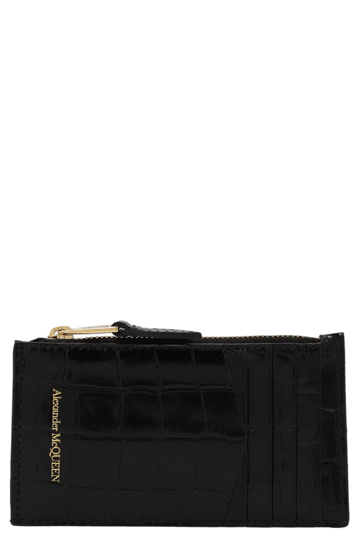 Shiny black crocodile-effect calf leather card holder with gold 'Skull' and five cracking credit cards, brass details with gold finish and an embossed logo.