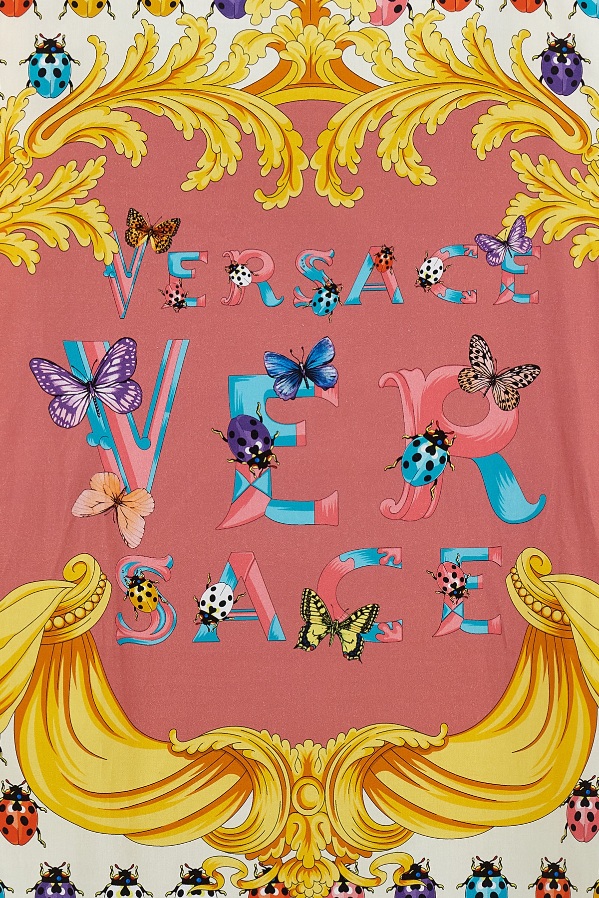 La Vacanza in cotton terry cloth capsule bathrobe with butterflies, harriers and Baroque elements and a tone-on-tone Versace All over pattern on the belt to be knott at the waist.