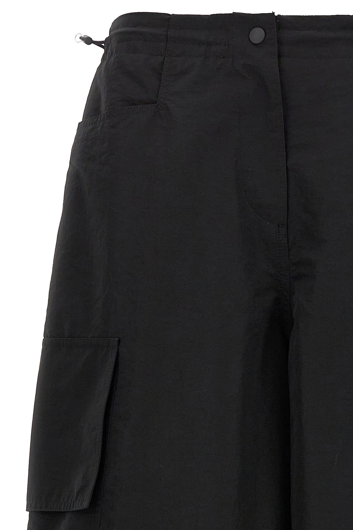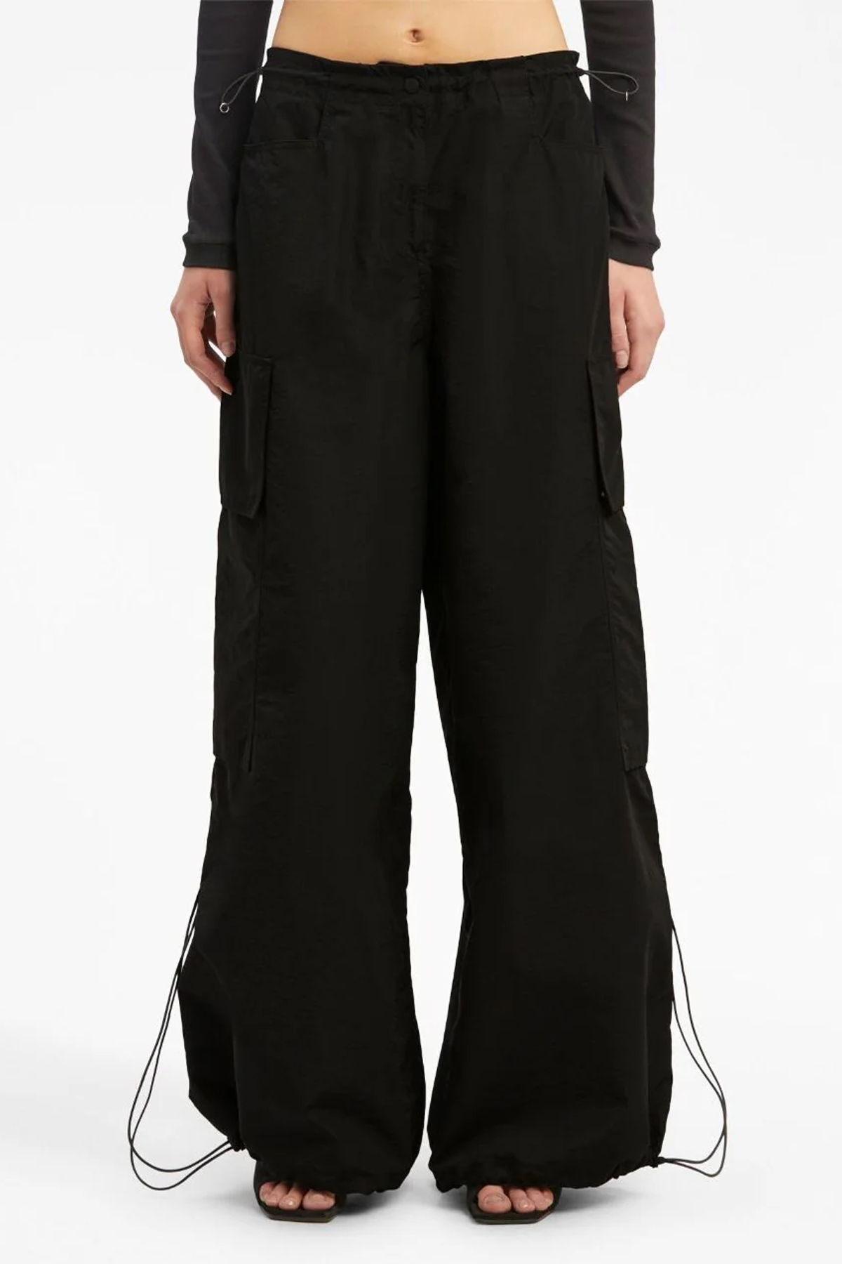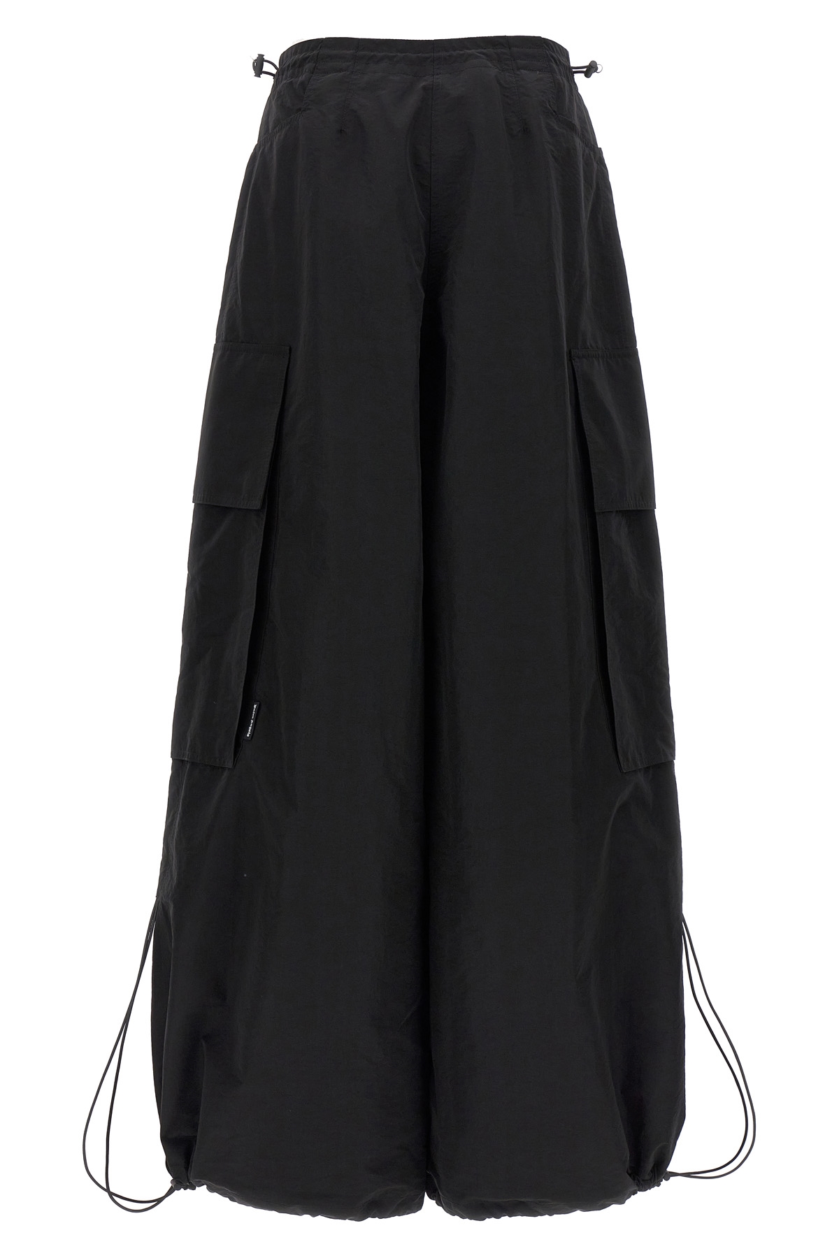Parachute pants in nylon with zipper and button closure, adjustable elastic drawstring at the waist, pockets, and adjustable elastic cuffs with drawstring.