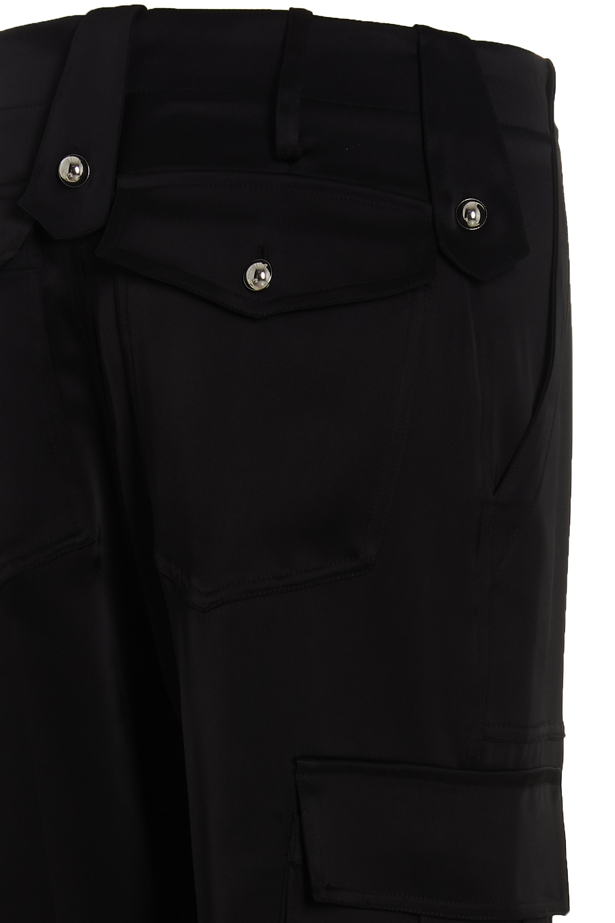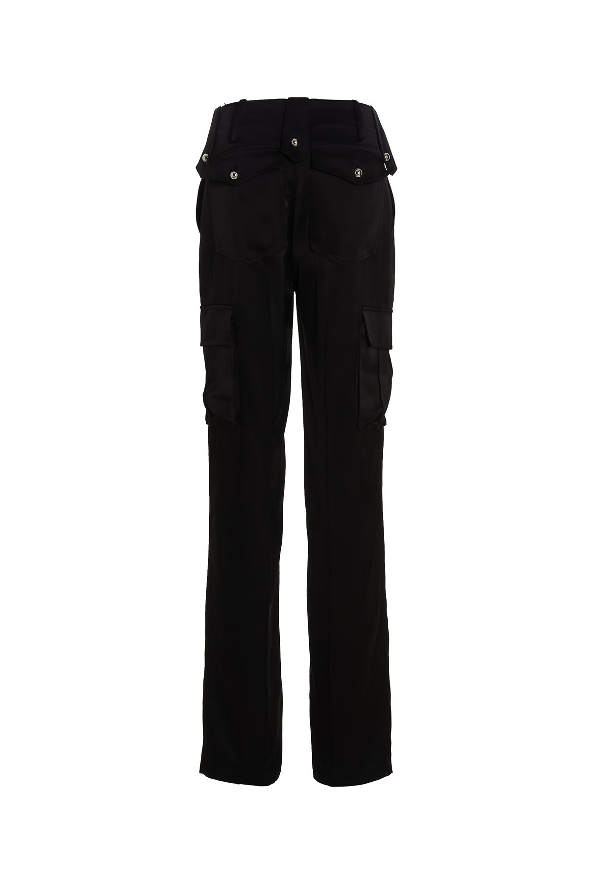 Satin cargo pants with zip and button closure, multi pockets and a central pleat leg.