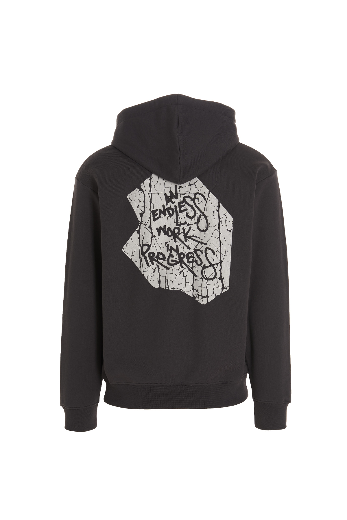 'Progress' cotton hoodie with print at the front and back, kangaroo pocket, long cuffed sleeves.