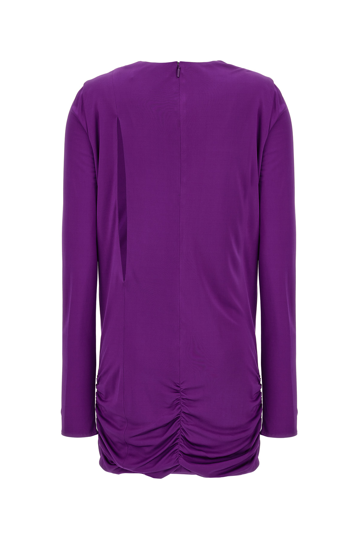 Jersey dress with cut out details at the front and back, long sleeves, round neckline, back zip closure and draping on the sides.