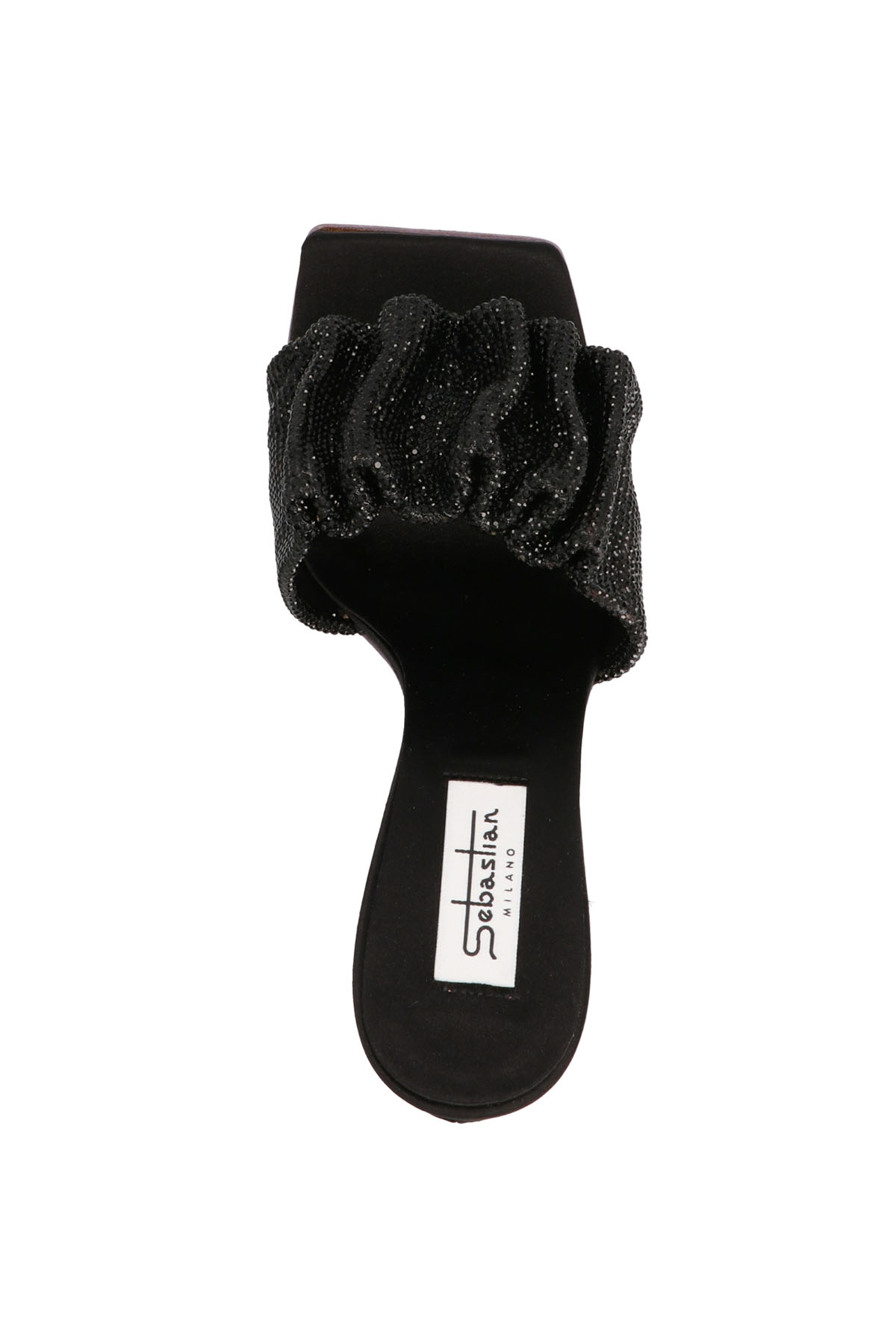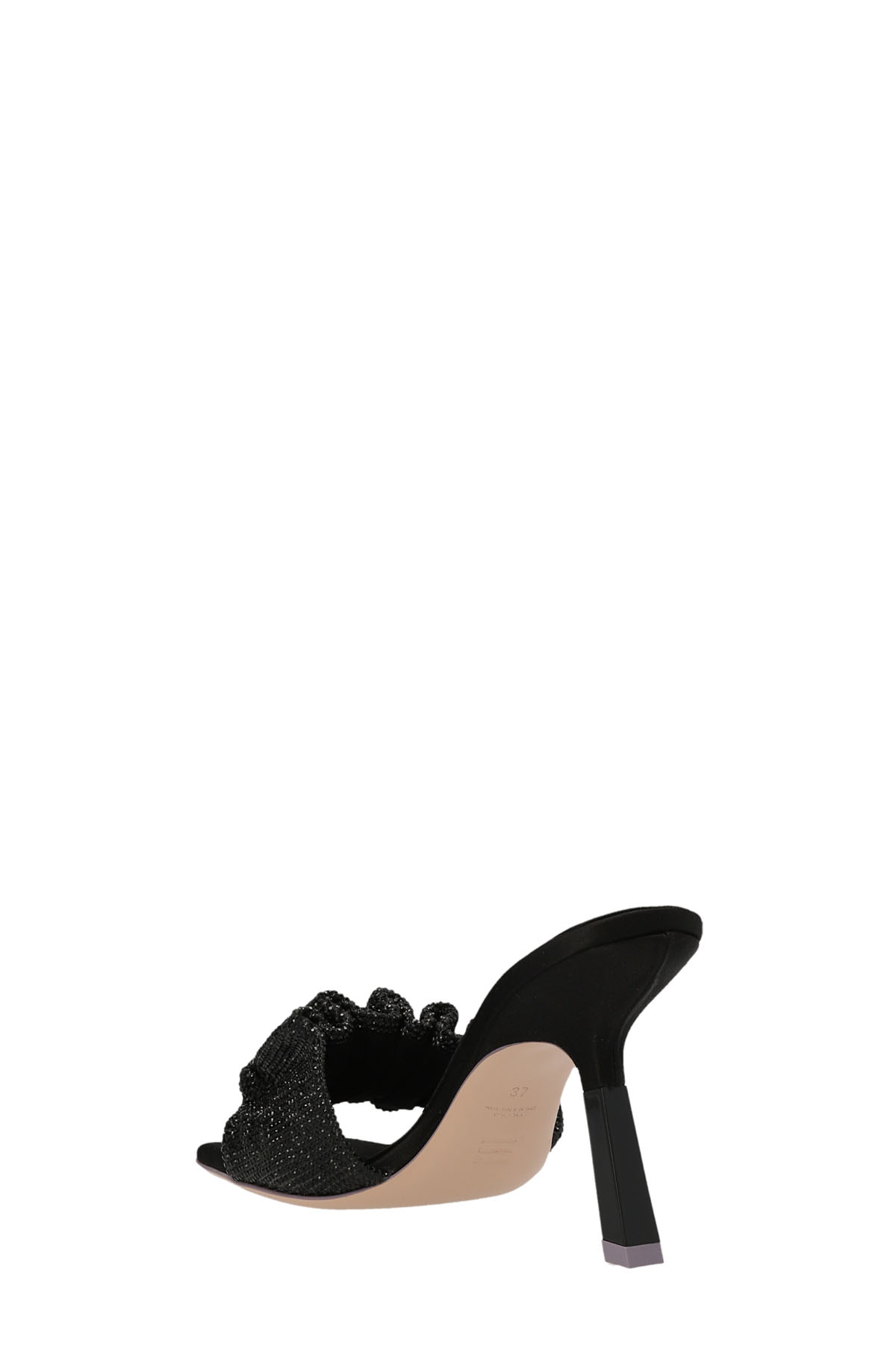 Cher' satin mules with sequin appliques and sculpted heel.