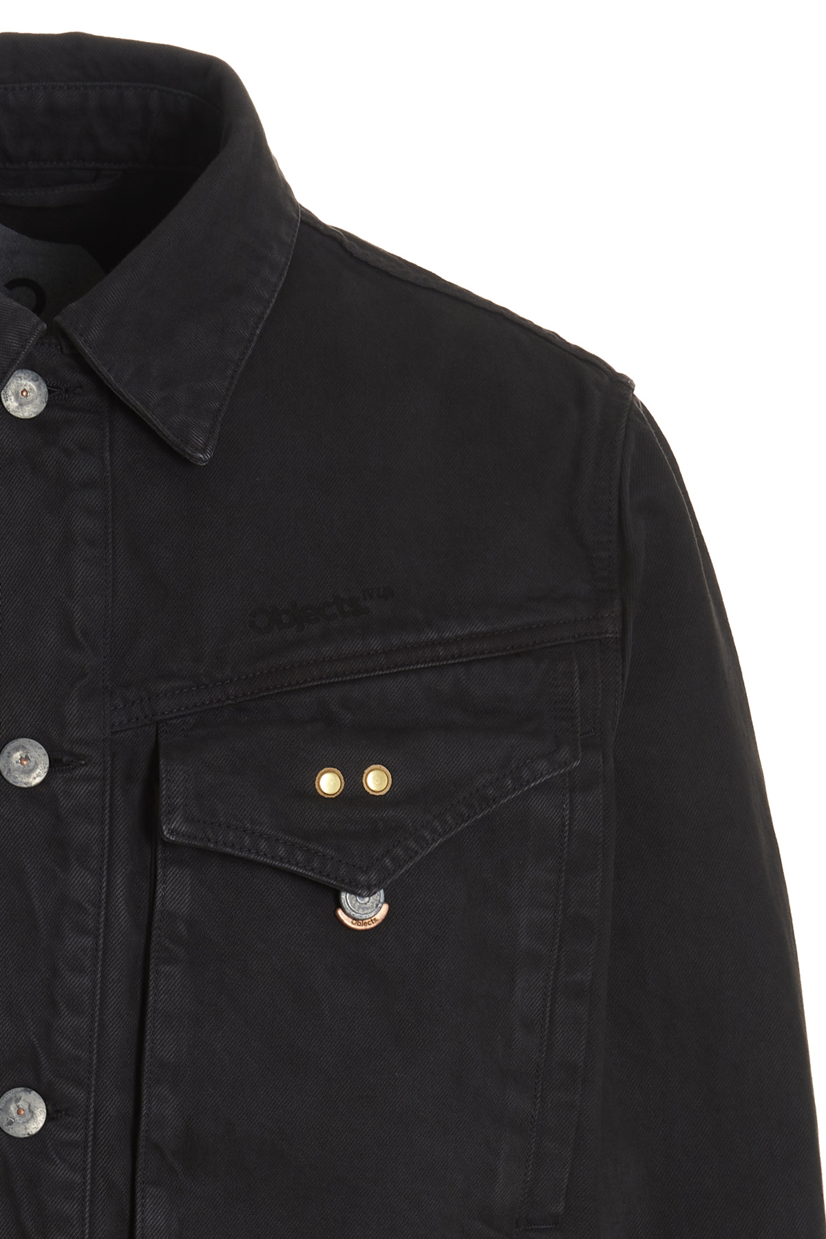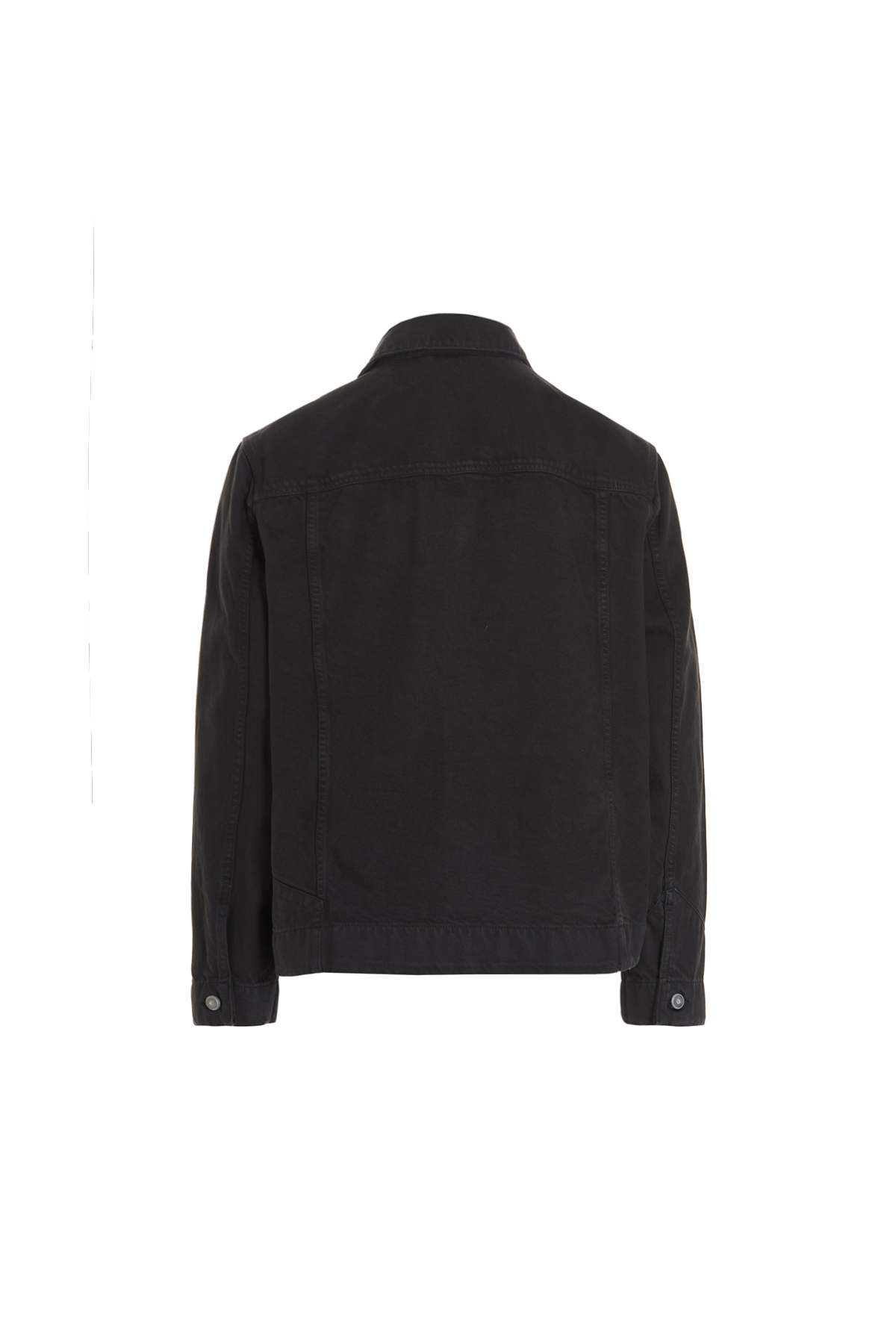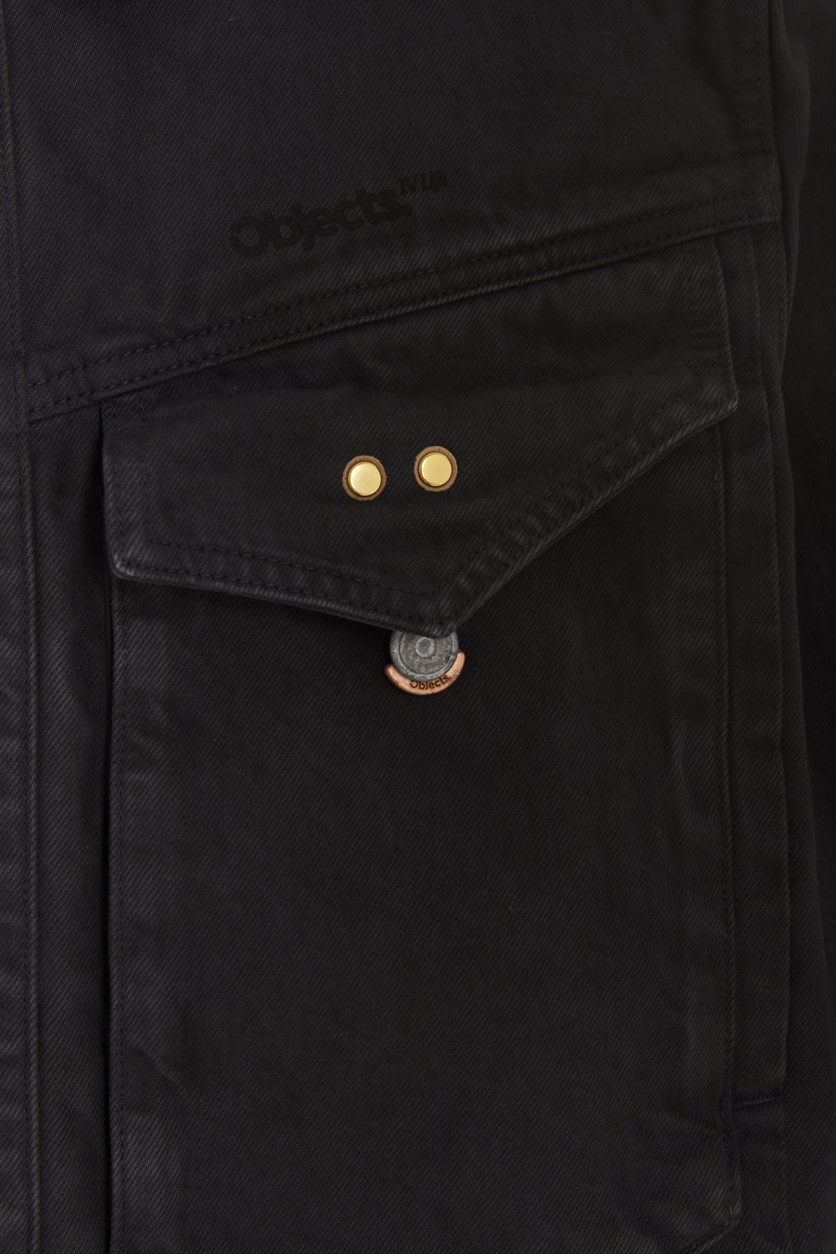 Cotton denim jacket with button closure, maxi hook-and-eye pockets and long cuffed sleeves.
