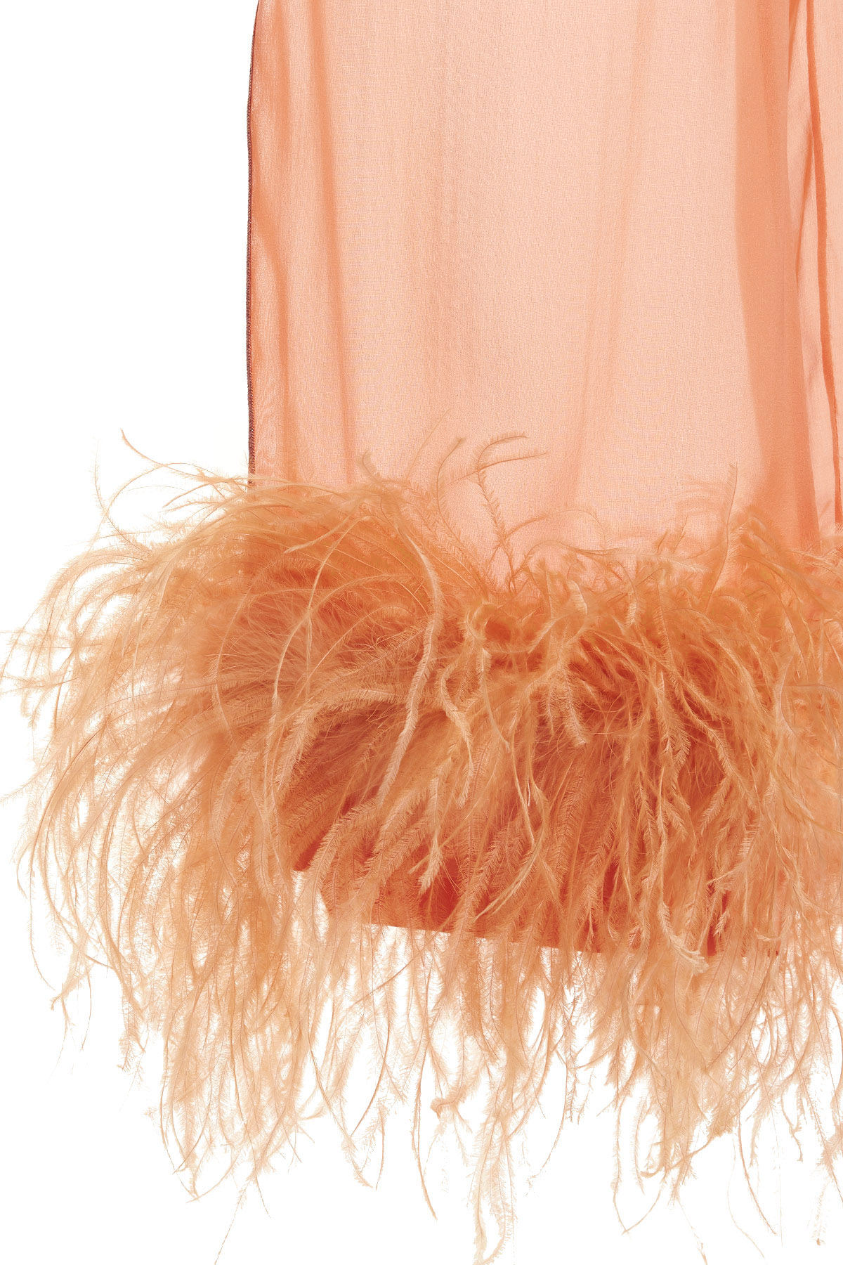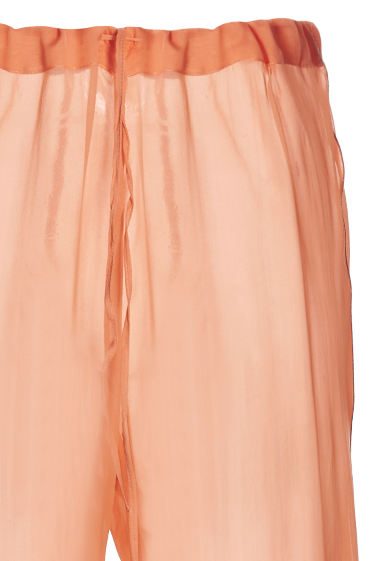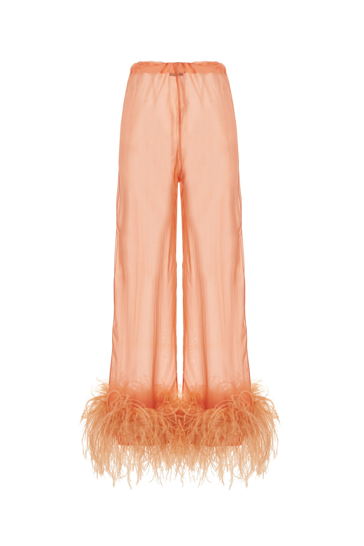 Shimmering silk pants with ostrich feather applique on the leg bottoms and a drawstring at the waist.