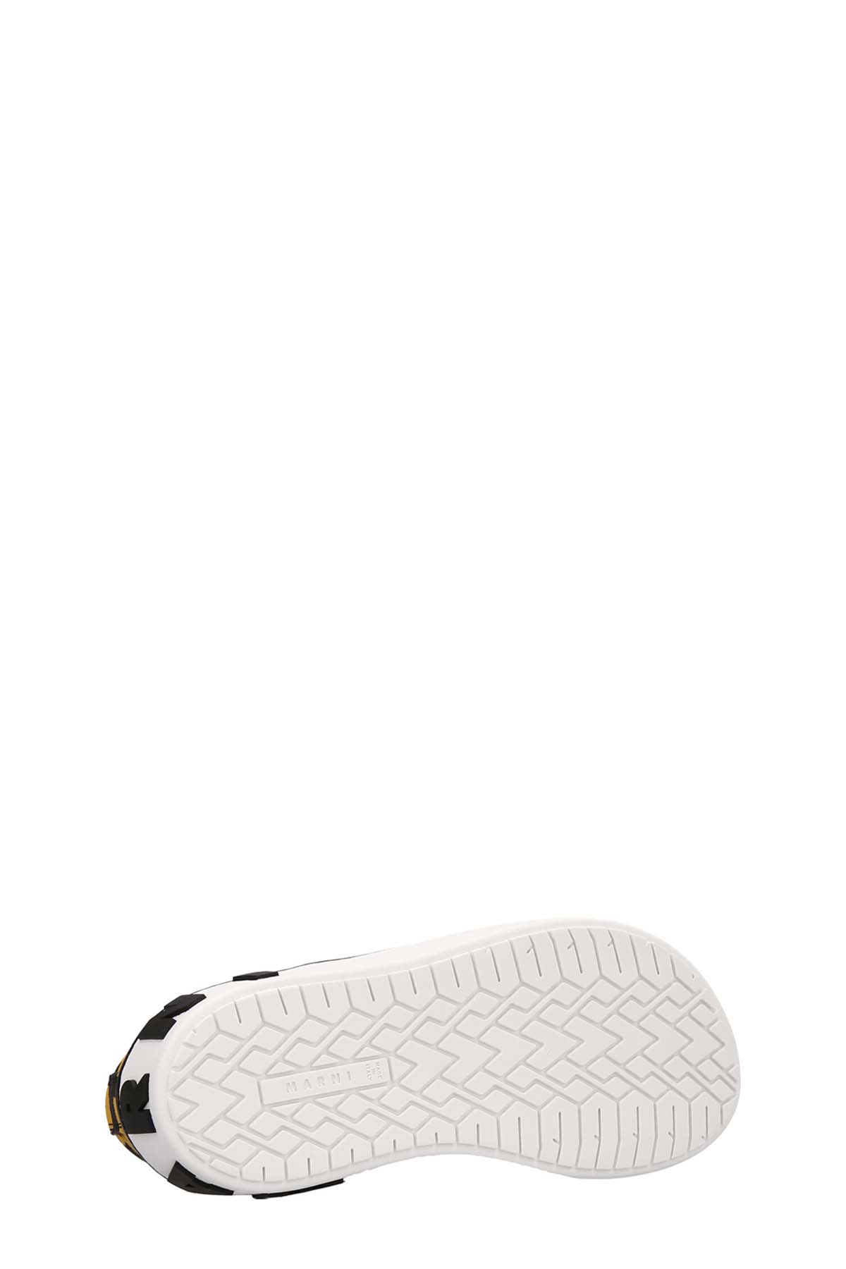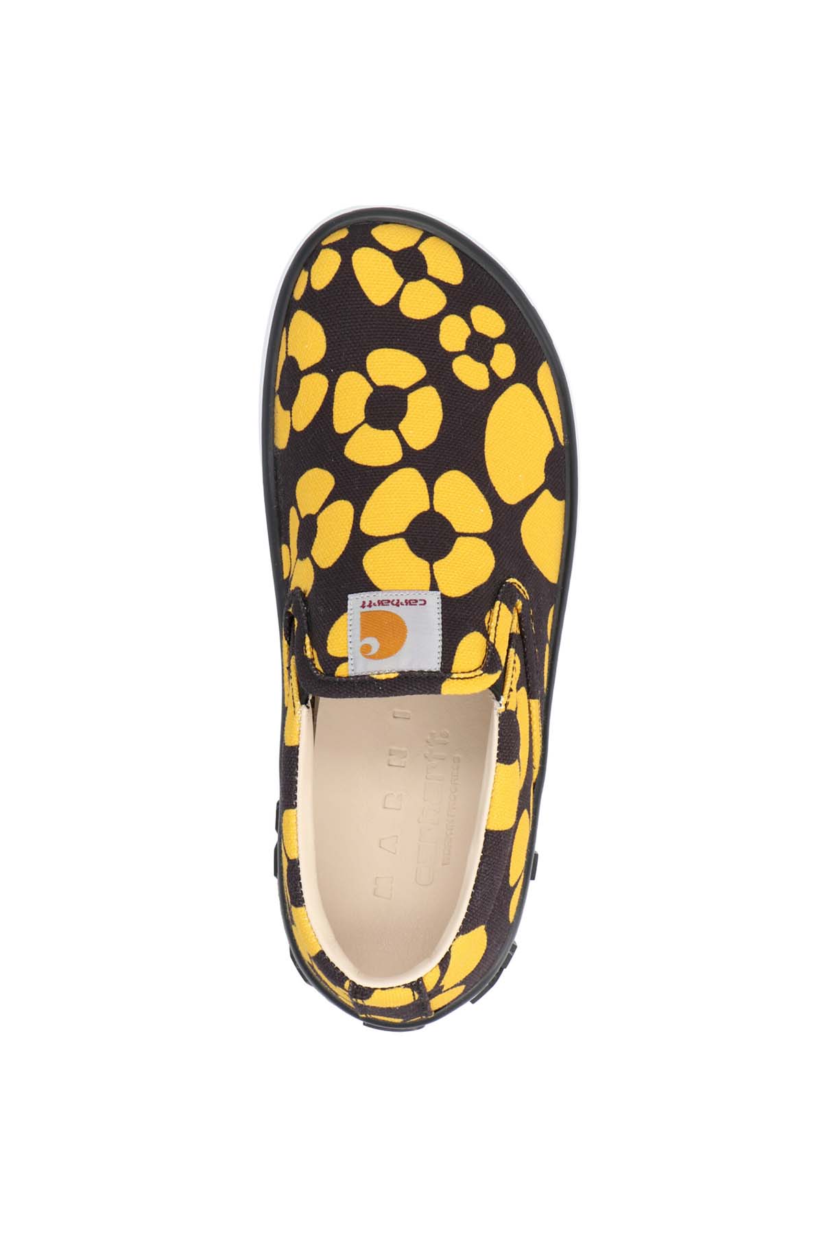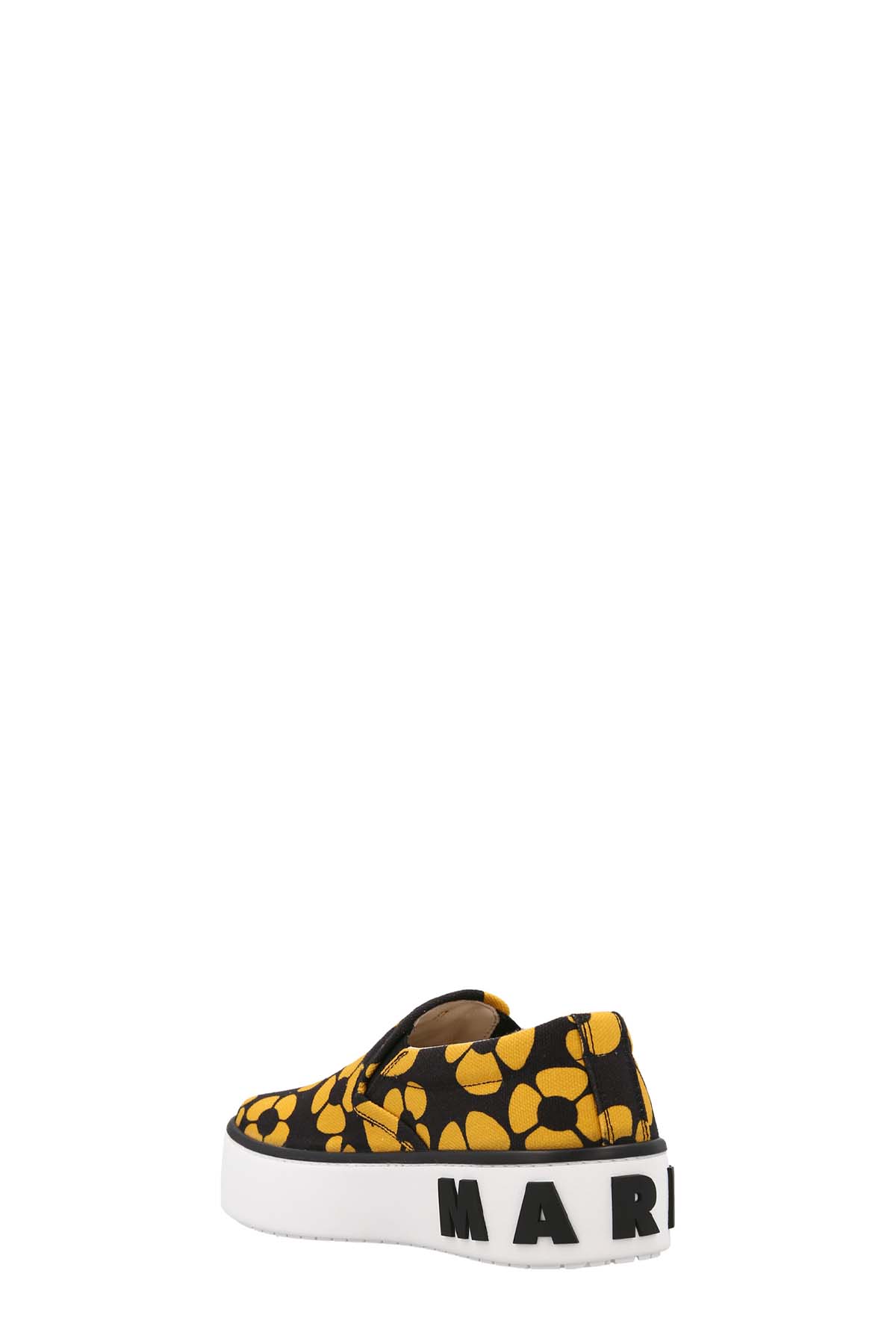Marni x Car extension, with floareal print canvas slip on sneakers, logo patch, a rubber platform sole with maxi logo.