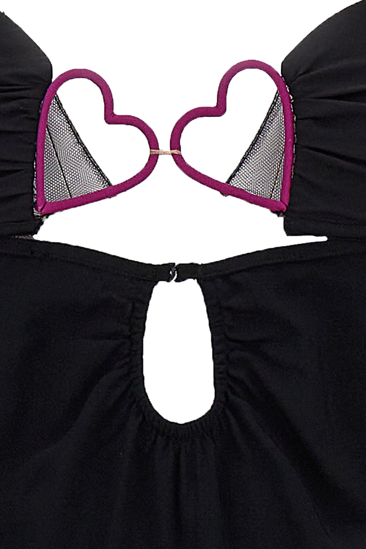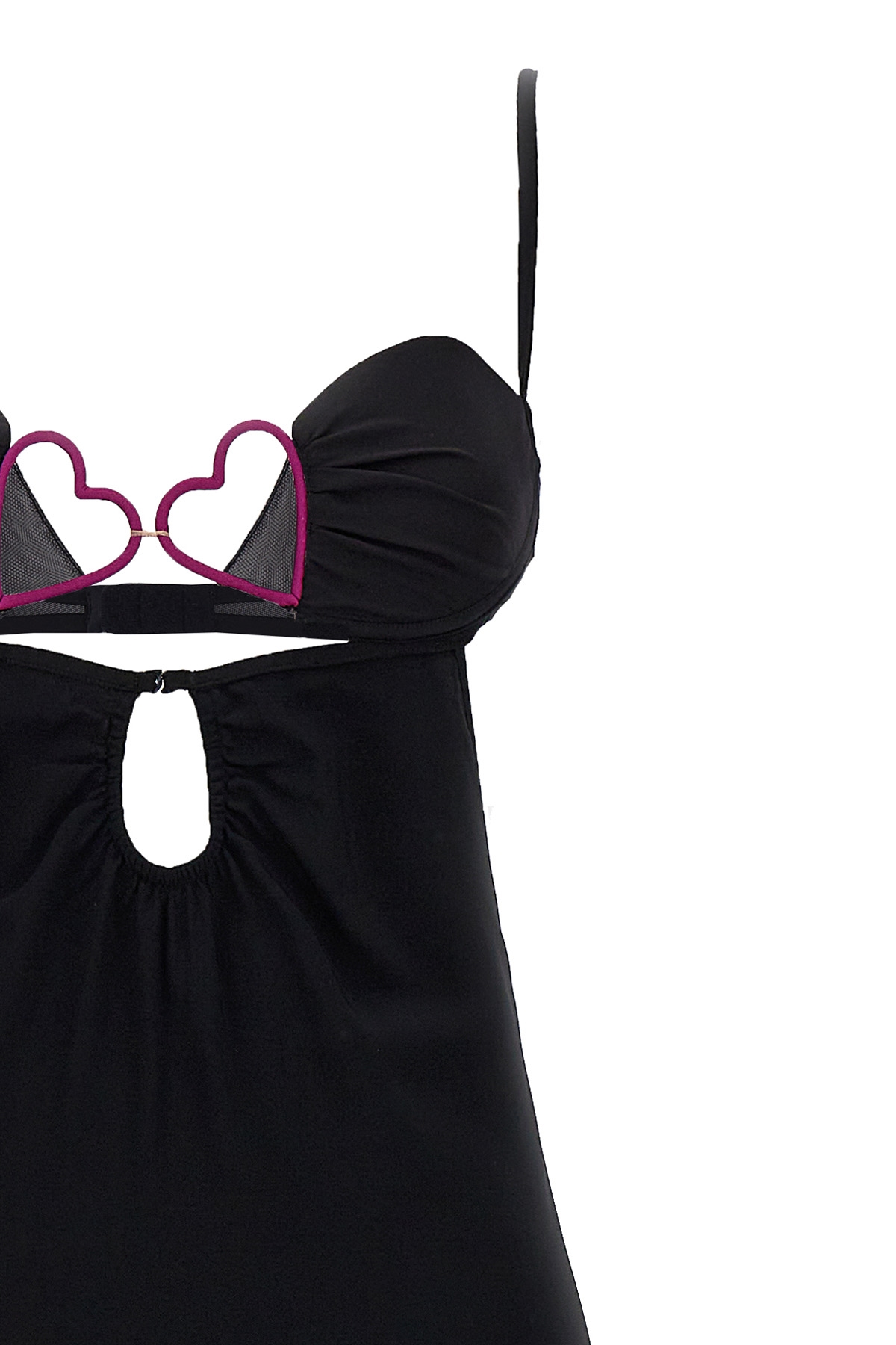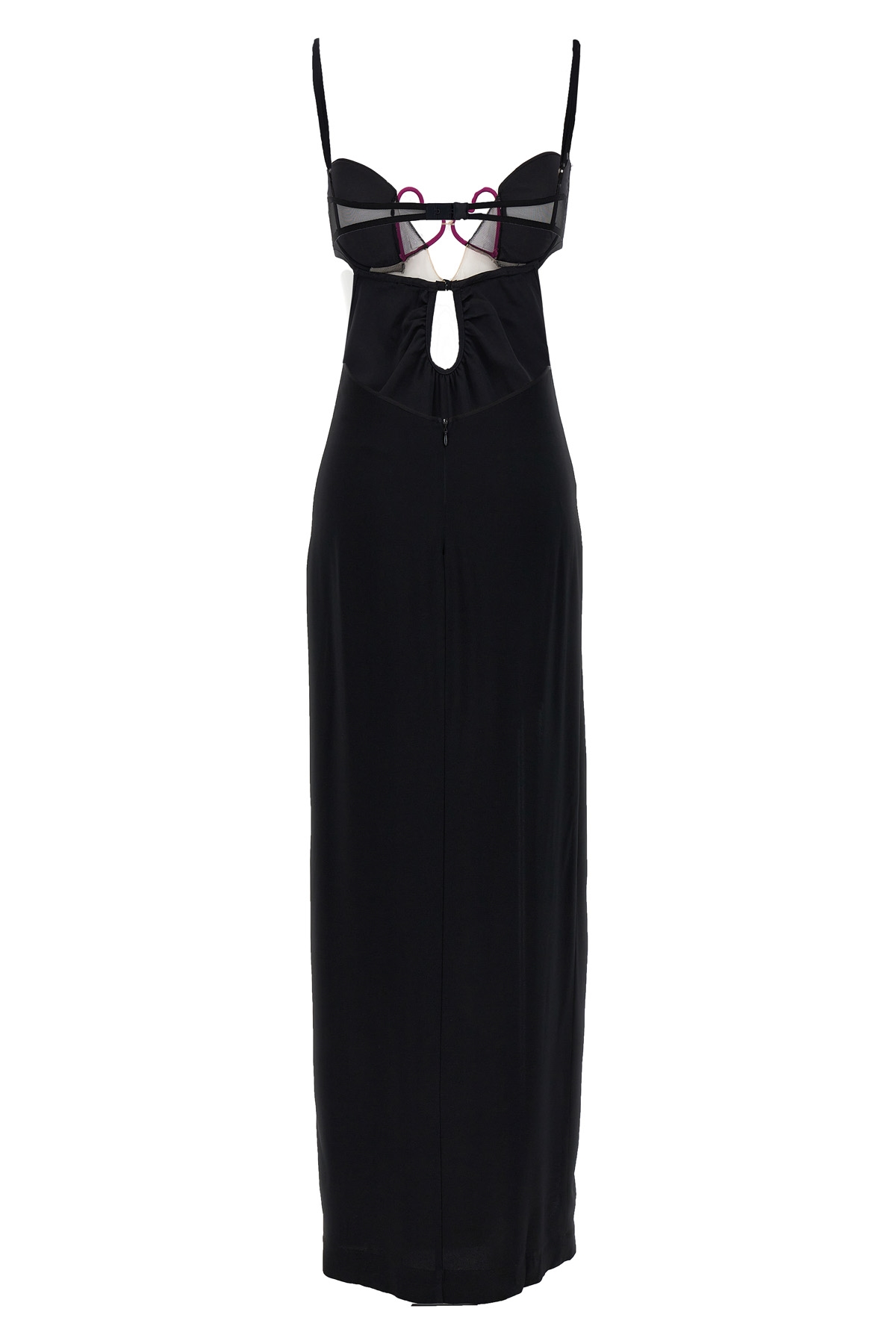 Heart Bra' stretch viscose long dress with cut out details and front hearts, mesh fabric inserts, padded cups, adjustable thin shoulders, a back zip closure and a large front split.