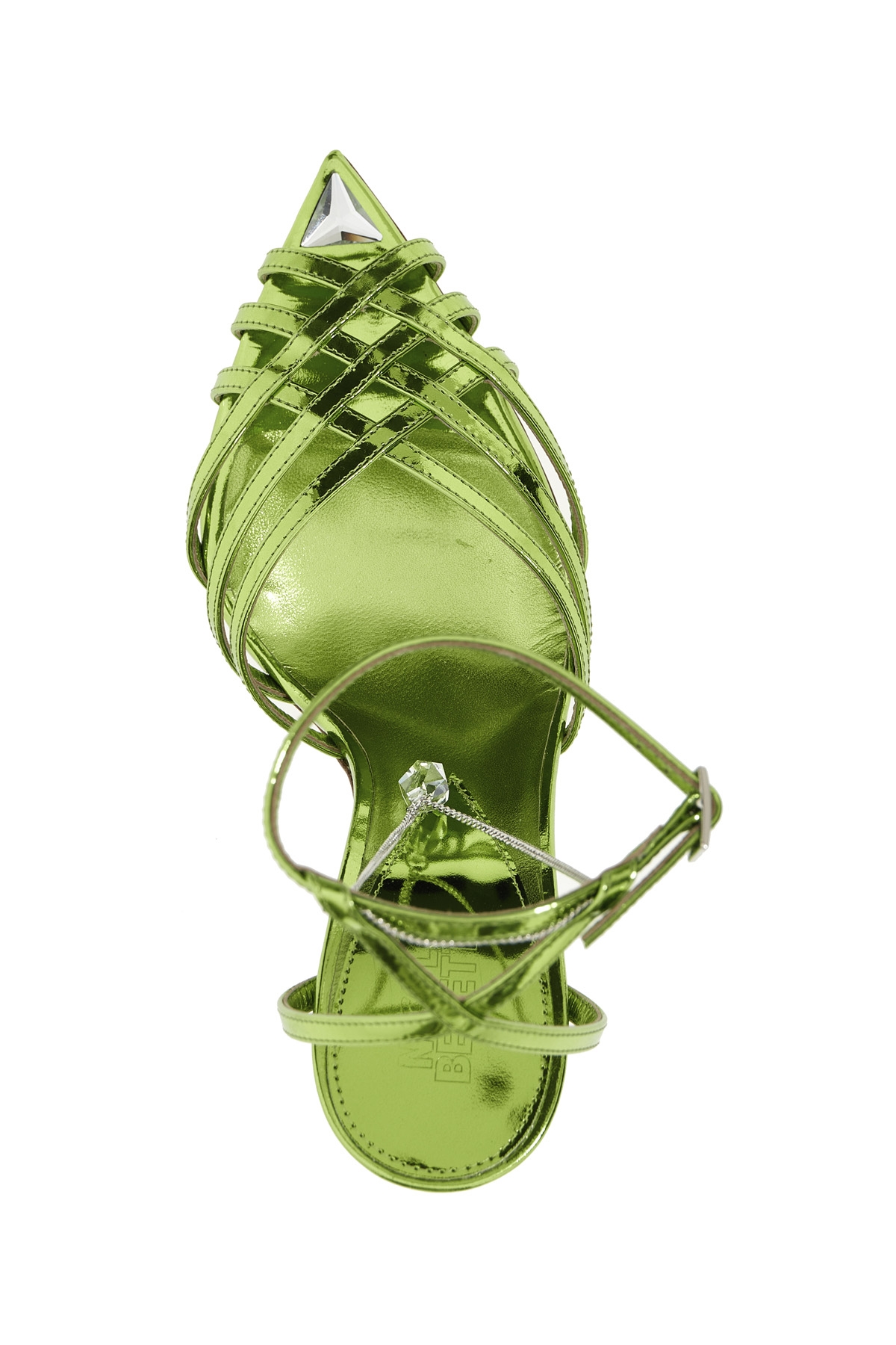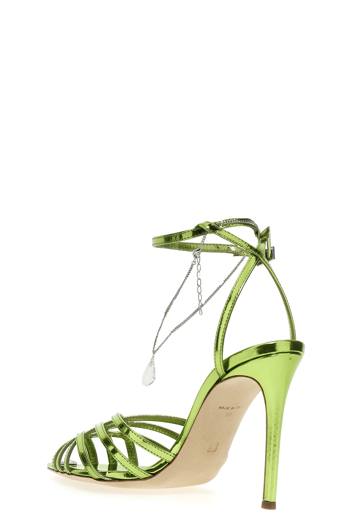Levy' laminated leather sandals with pointed toe with crystal applique, front thin straps, ankle strap with metal chain detail and a crystal pendant.