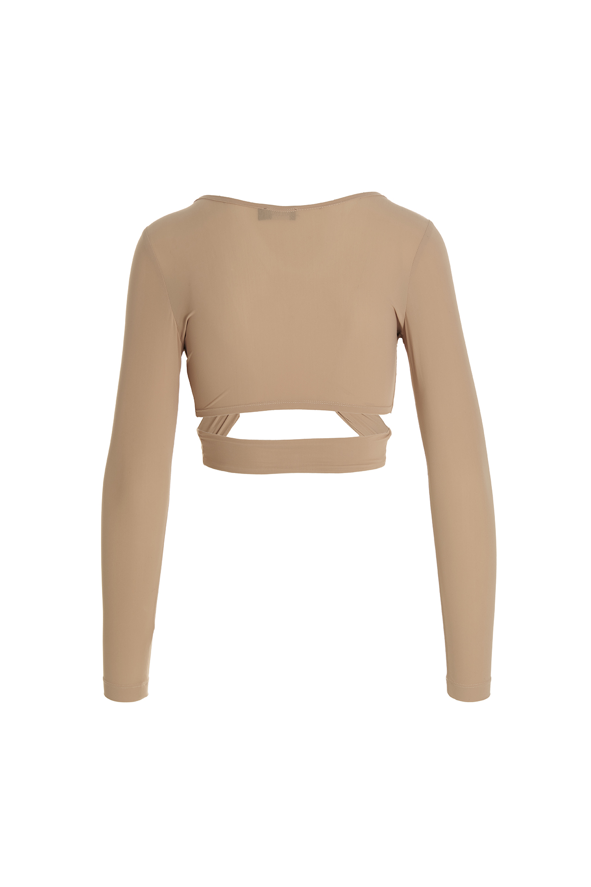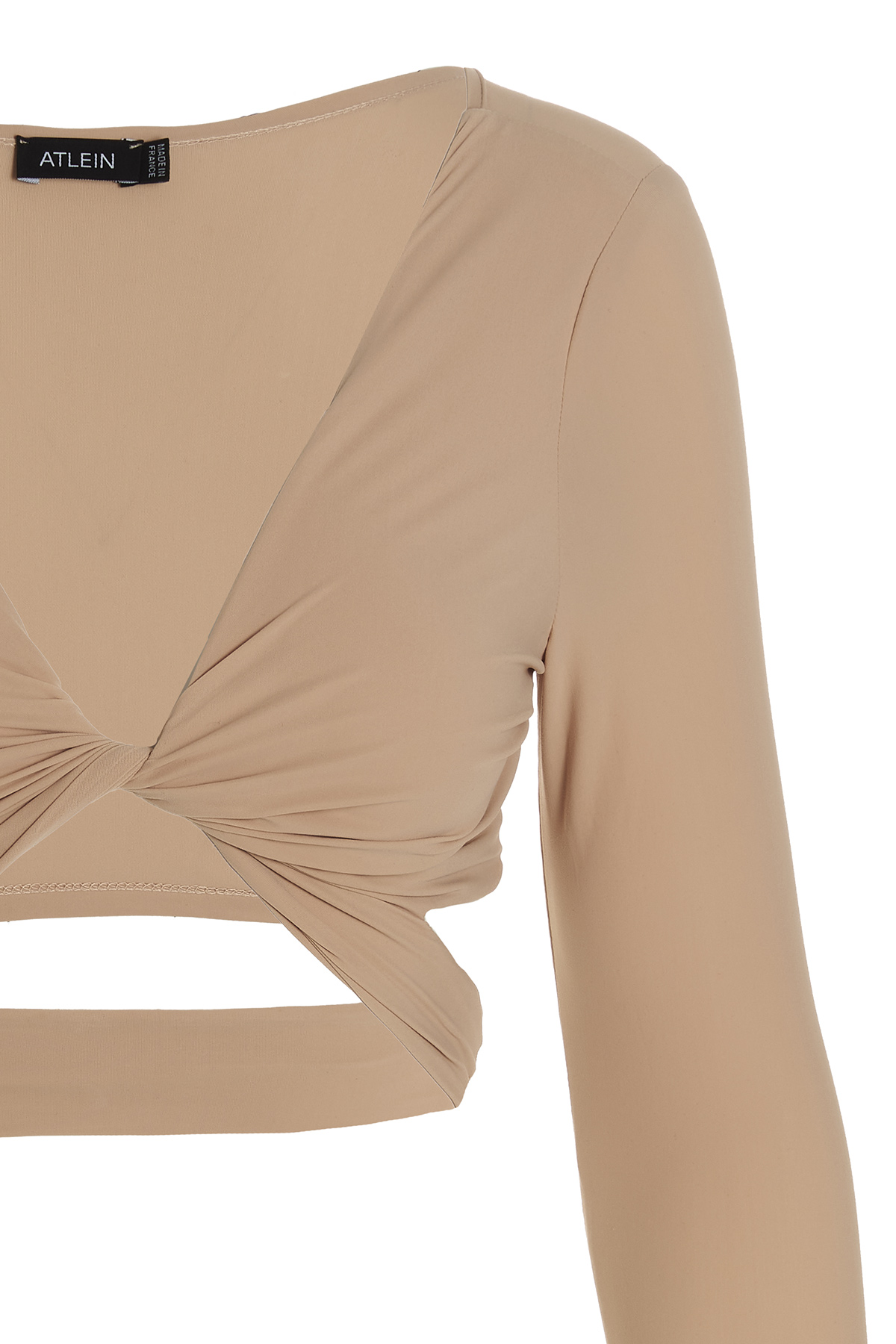 Stretch jersey cropped top with front crossover detail, wide neckline and long sleeves.