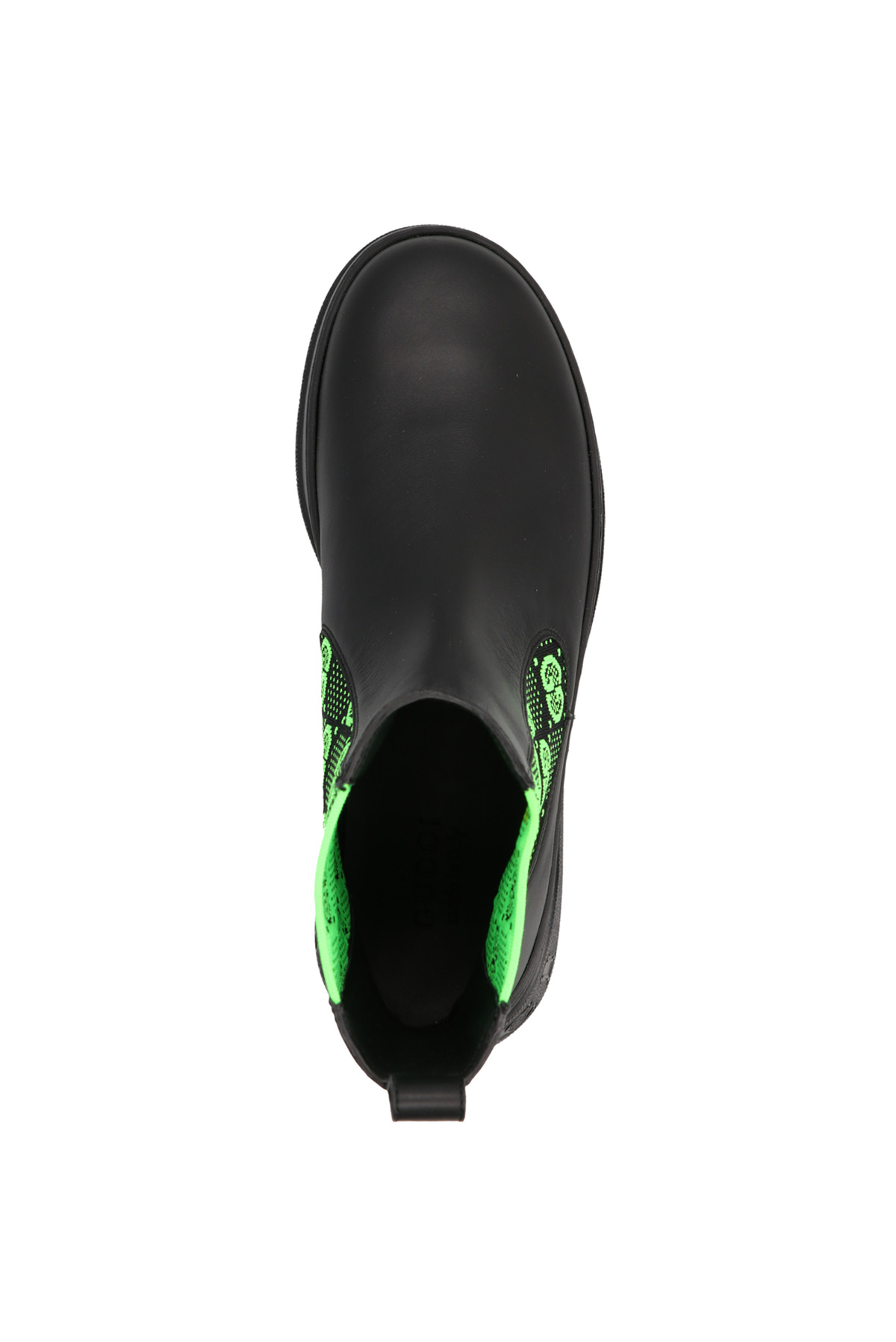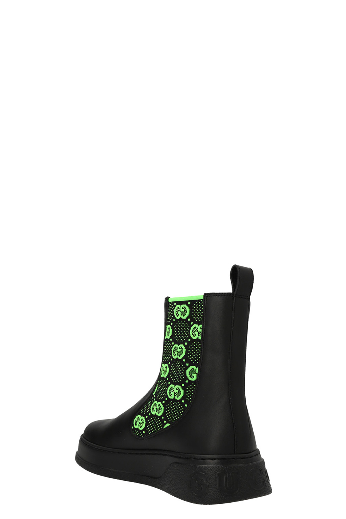 Black leather ankle boots, a green 'GG' stretch jersey insert, a leather loop on the back, logo detail on the heel, and a rubber sole.