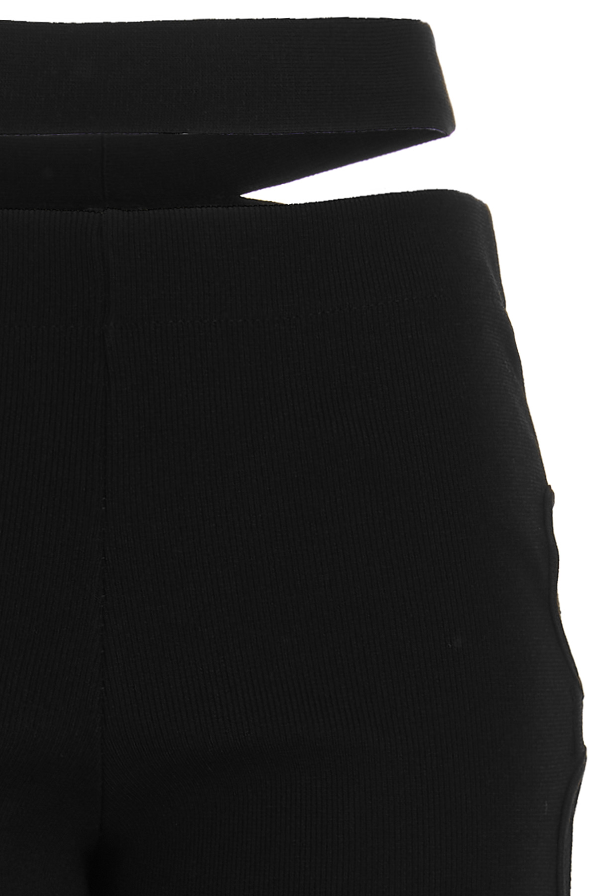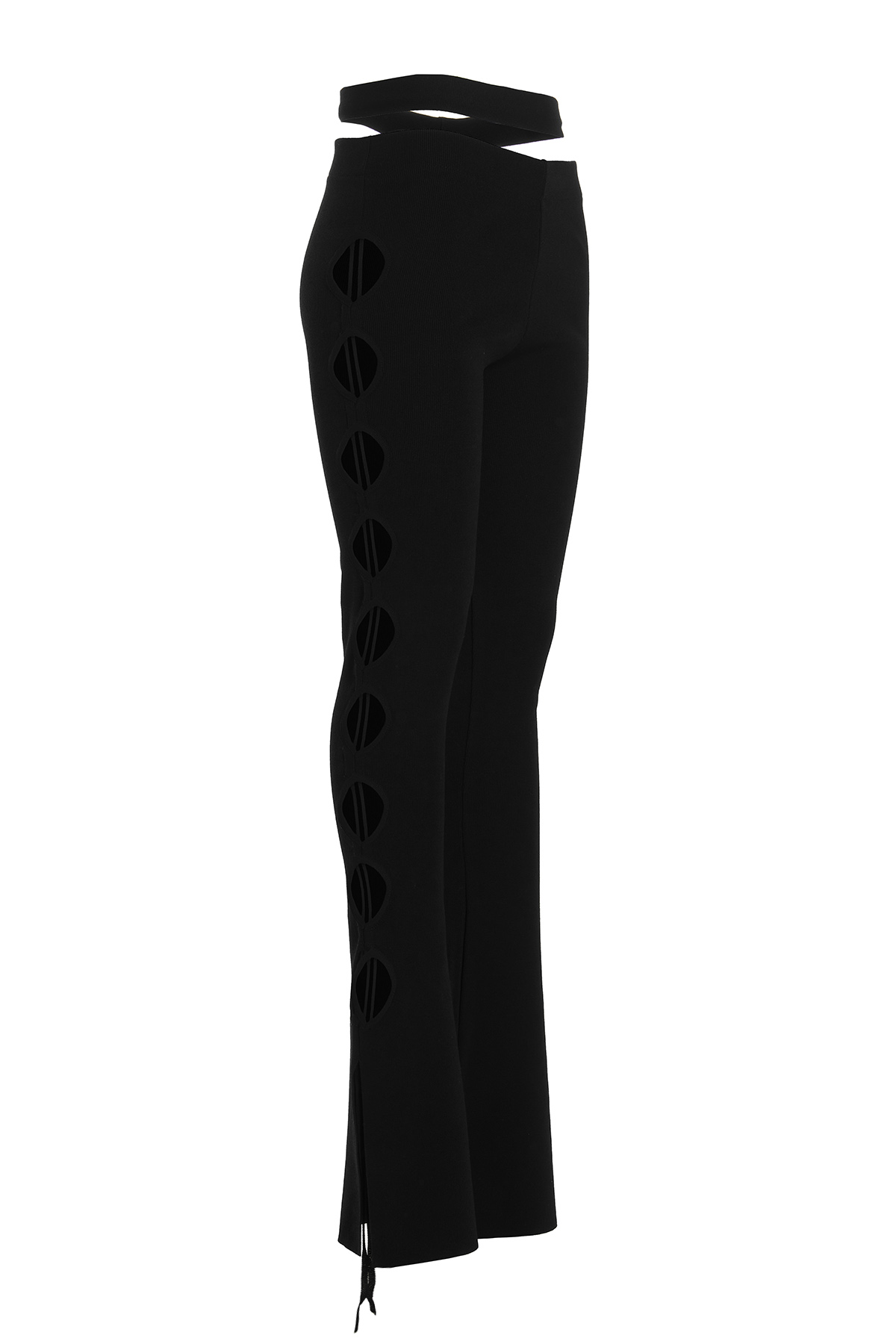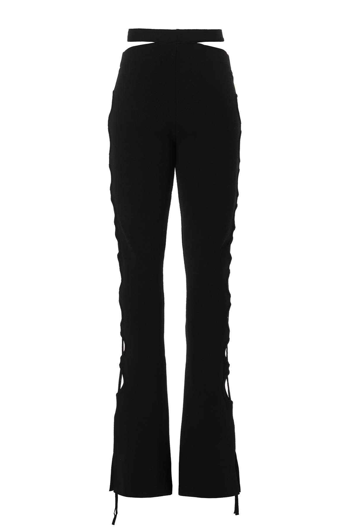 Stretch knit pants with cut out detailing, side ties on the legs, an elastic waistband, and a flared leg.