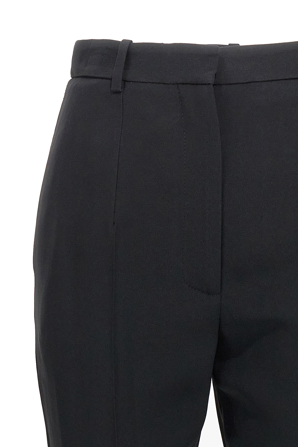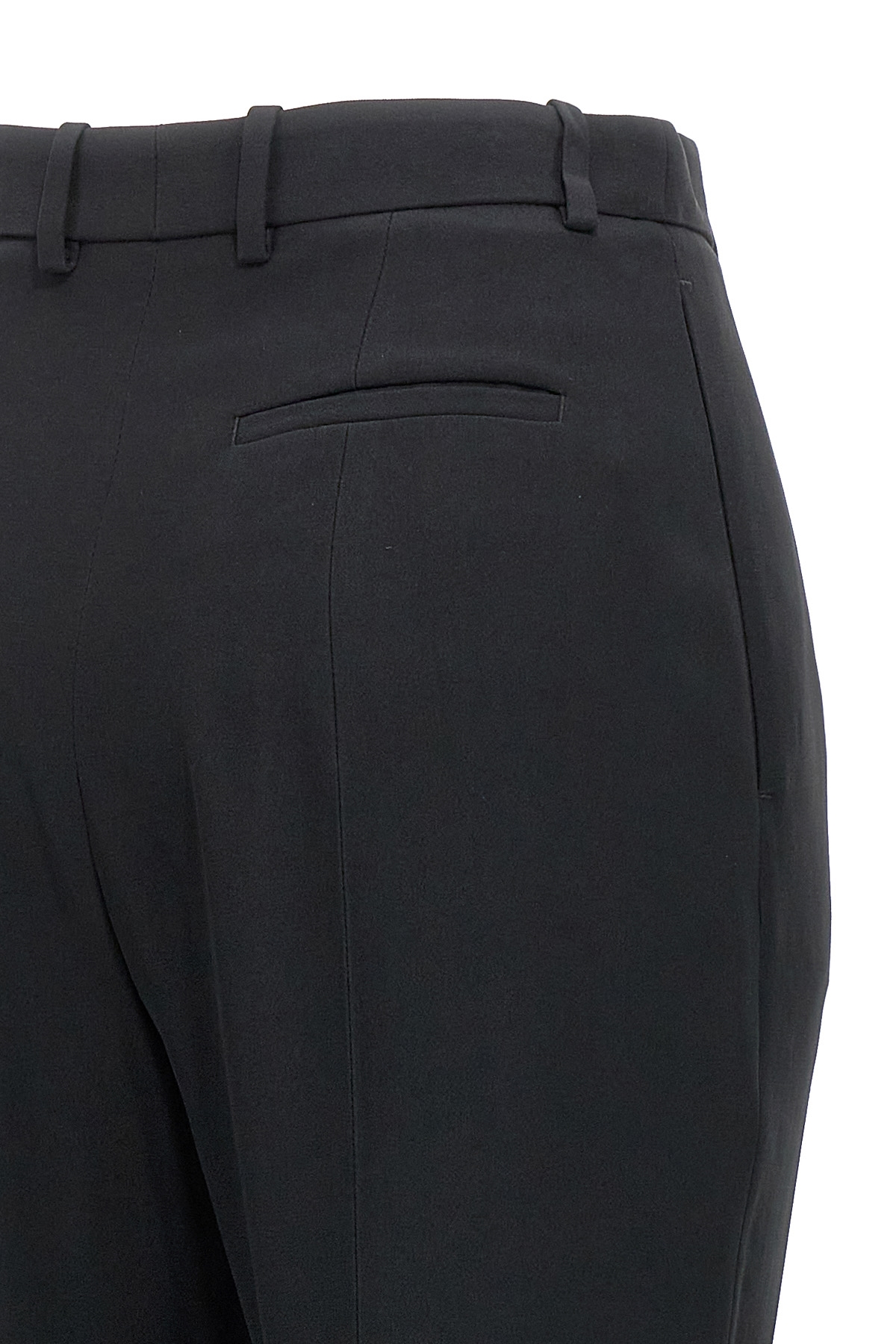 Thin crepe viscose blend high waist pants, with two side pockets and a welt pocket at the back, a concealed zip and hook closure.