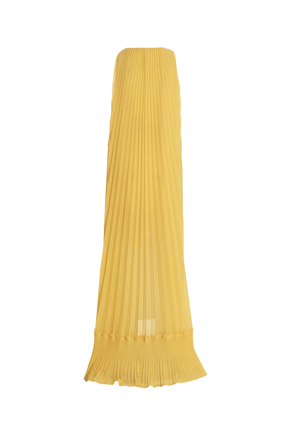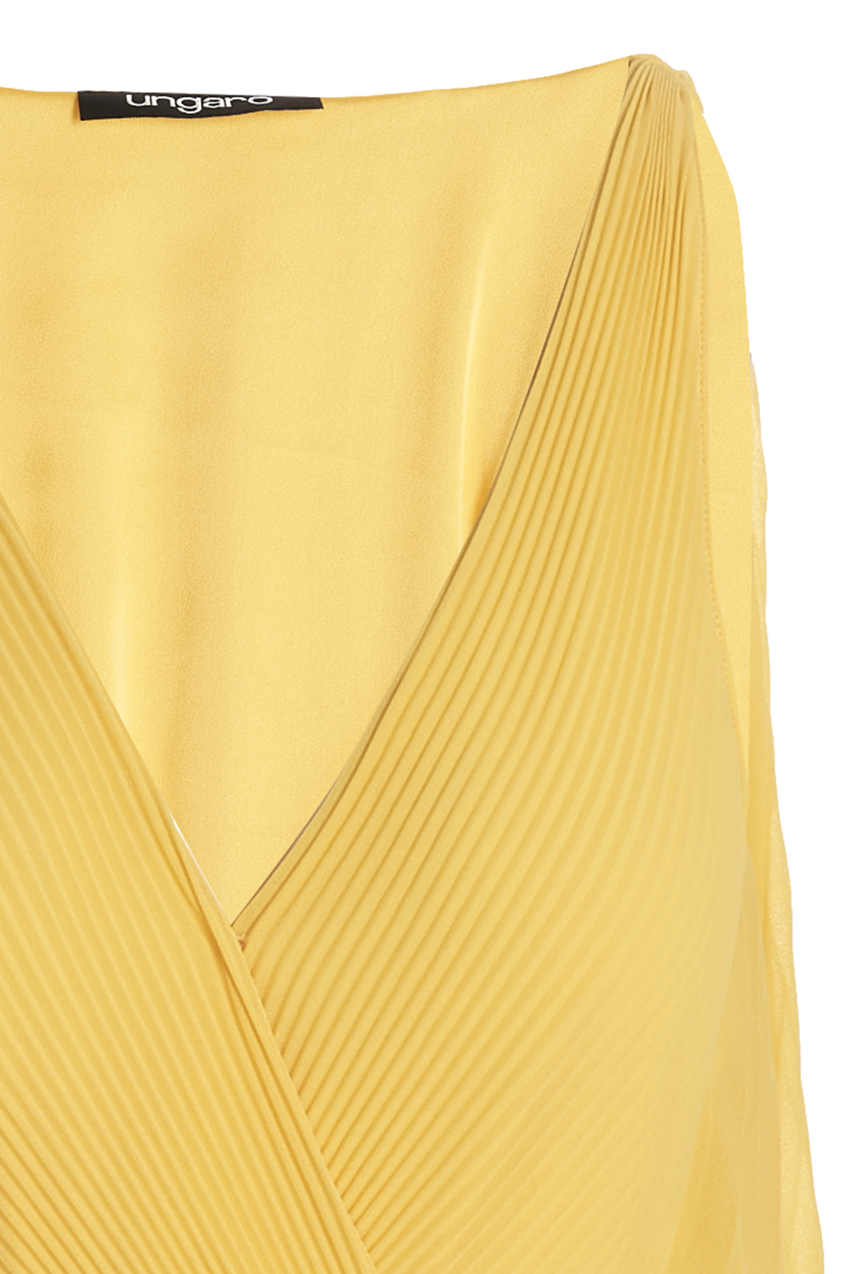 Sheridan' pleated chiffon crepe dress with V-neck, belt at the waist and an asymmetric hem with rupches.