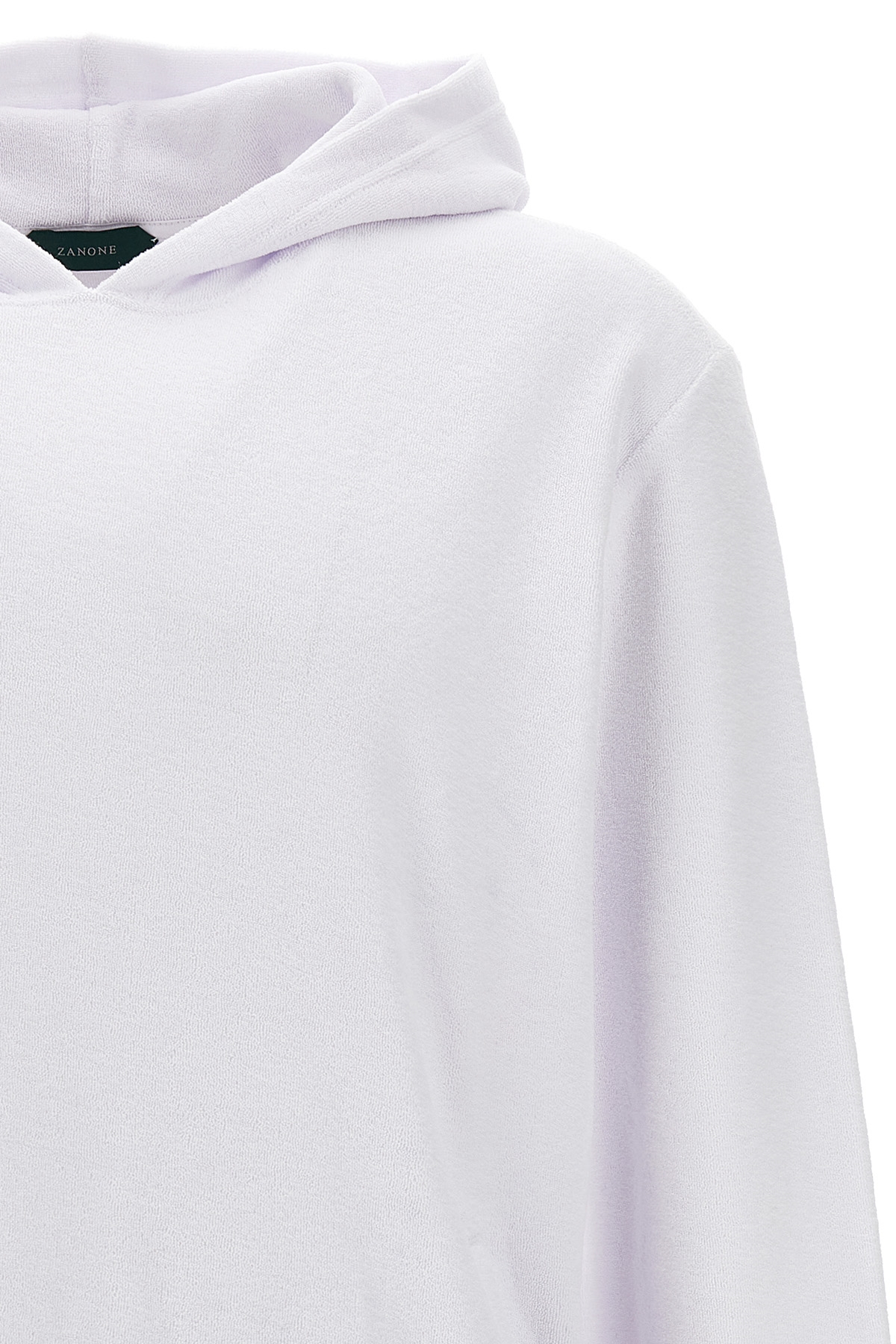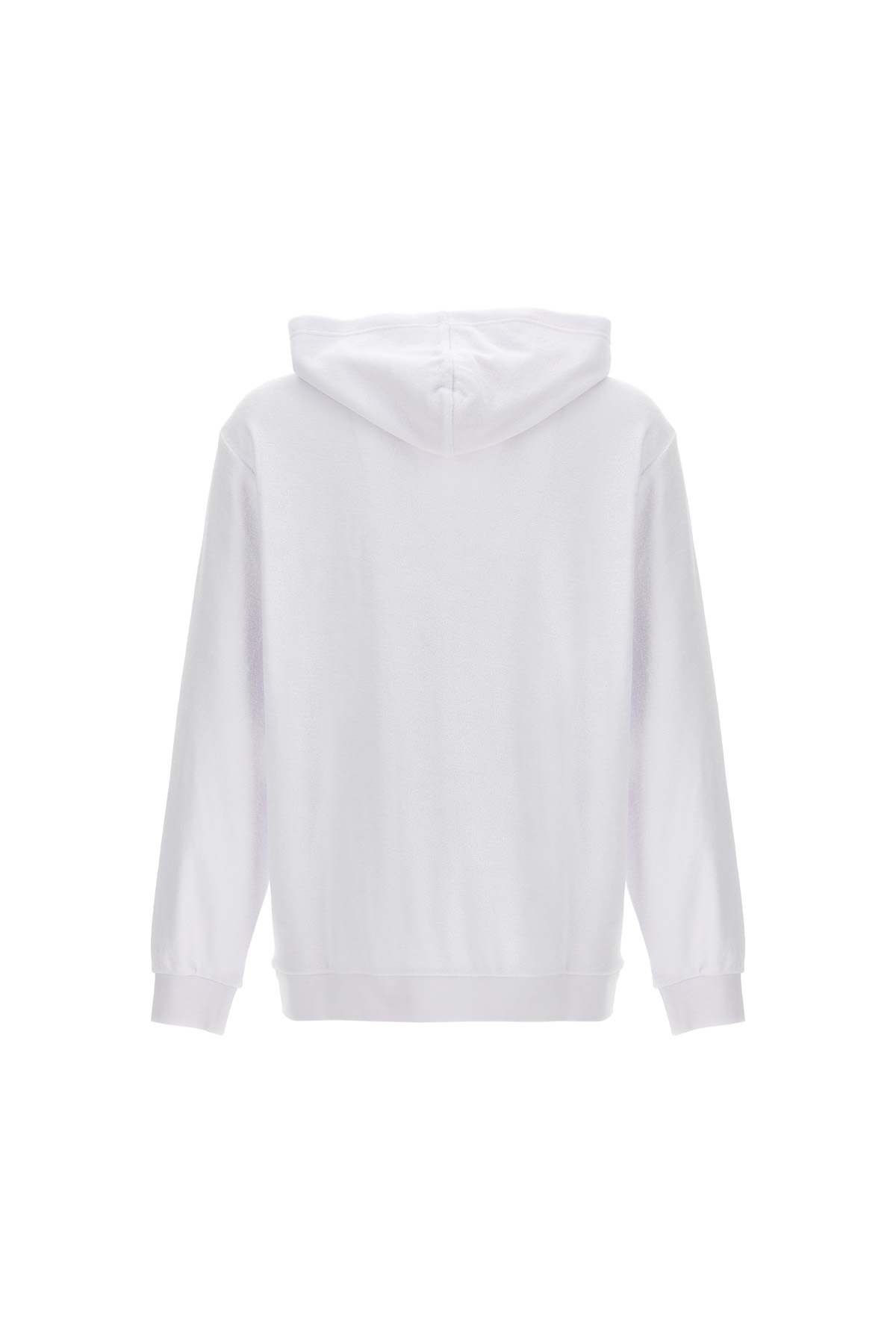 Cotton terry cloth hoodie with long cuffed sleeves, a front kangaroo pocket.