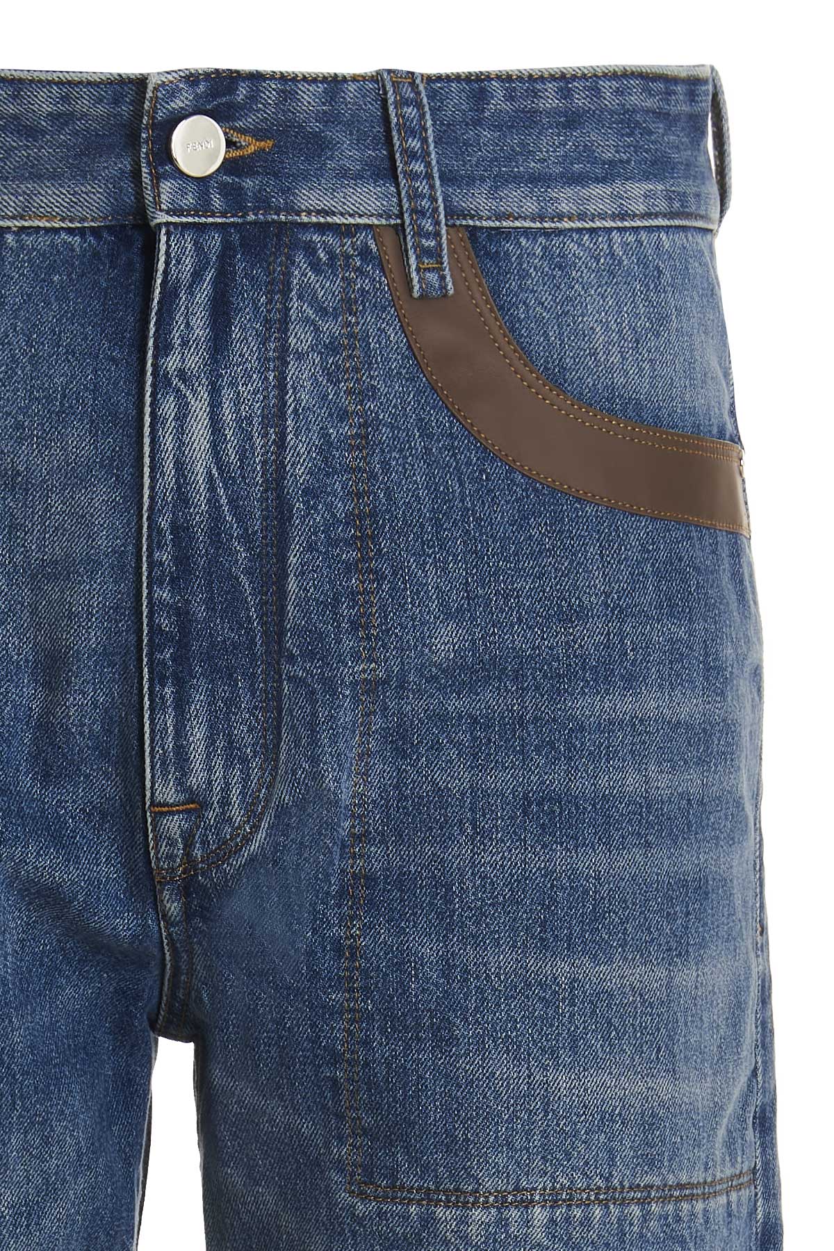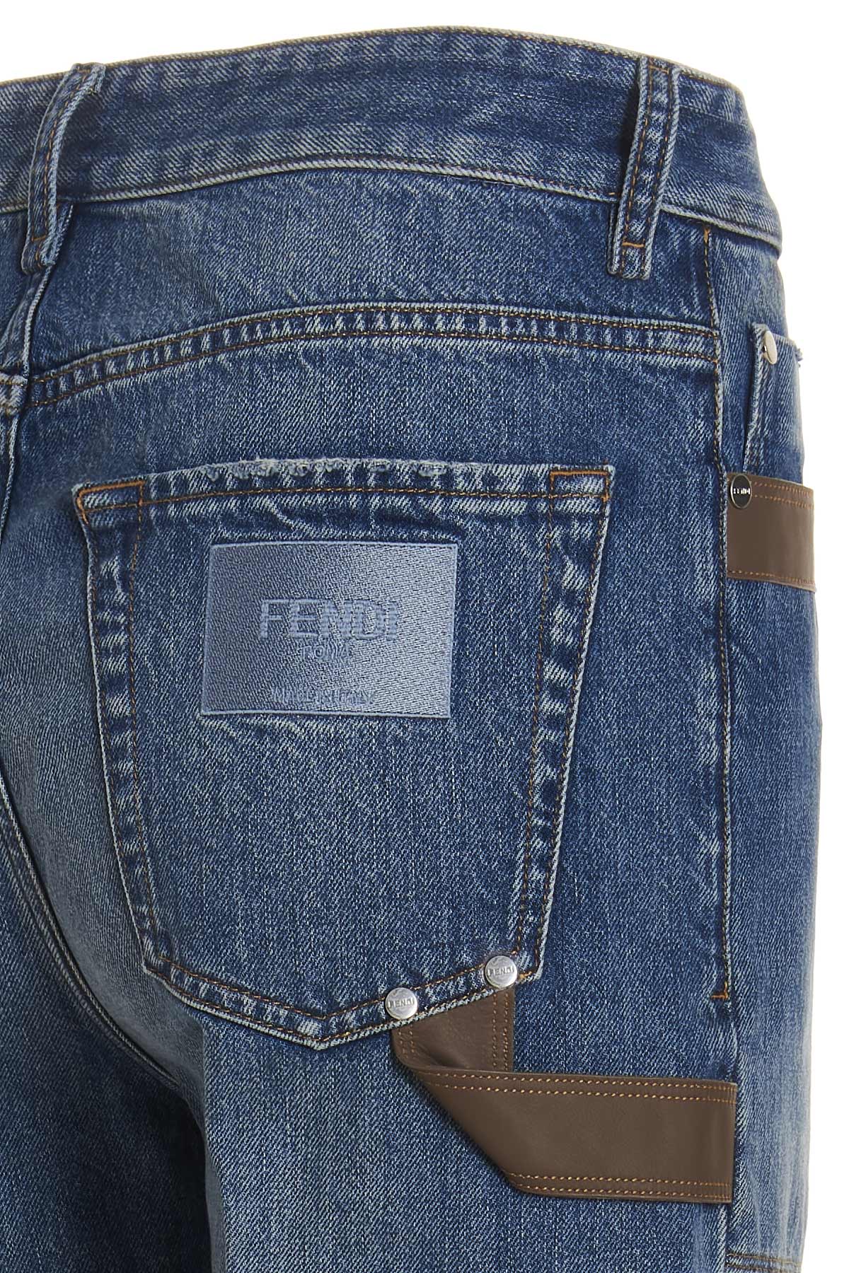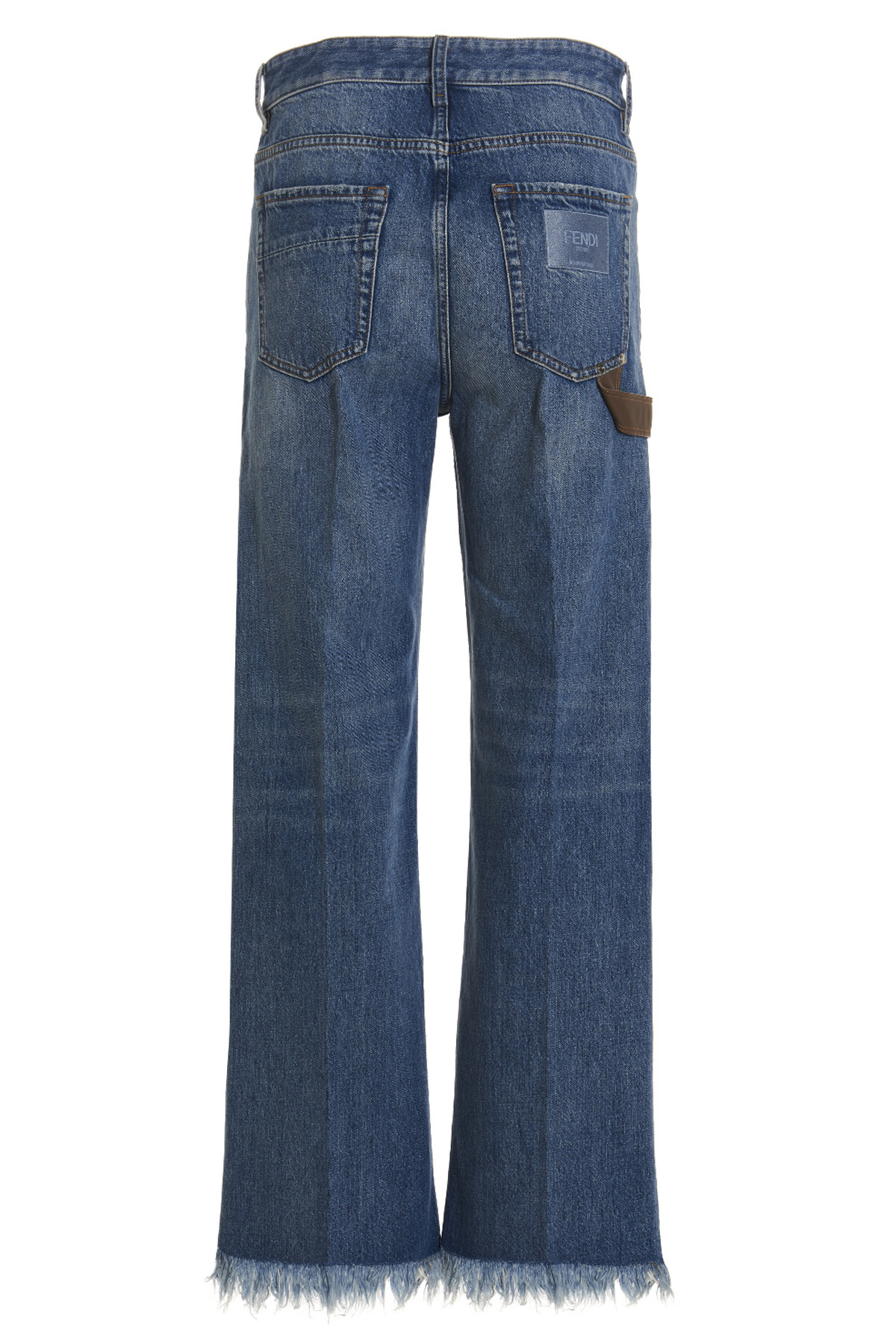 Denim jeans featuring contrast leather detailing, a straight leg, a frayed hem and a zip closure.
