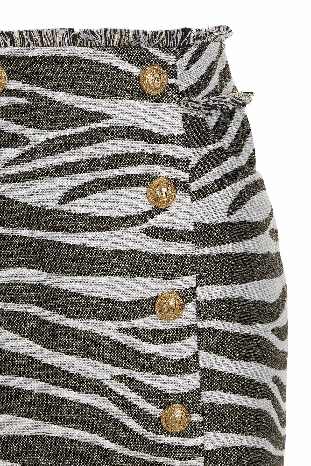 Fabric skirt with all over 'Lurex Zebra' pattern, front button applications, back zip closure, pockets and fringe detail.