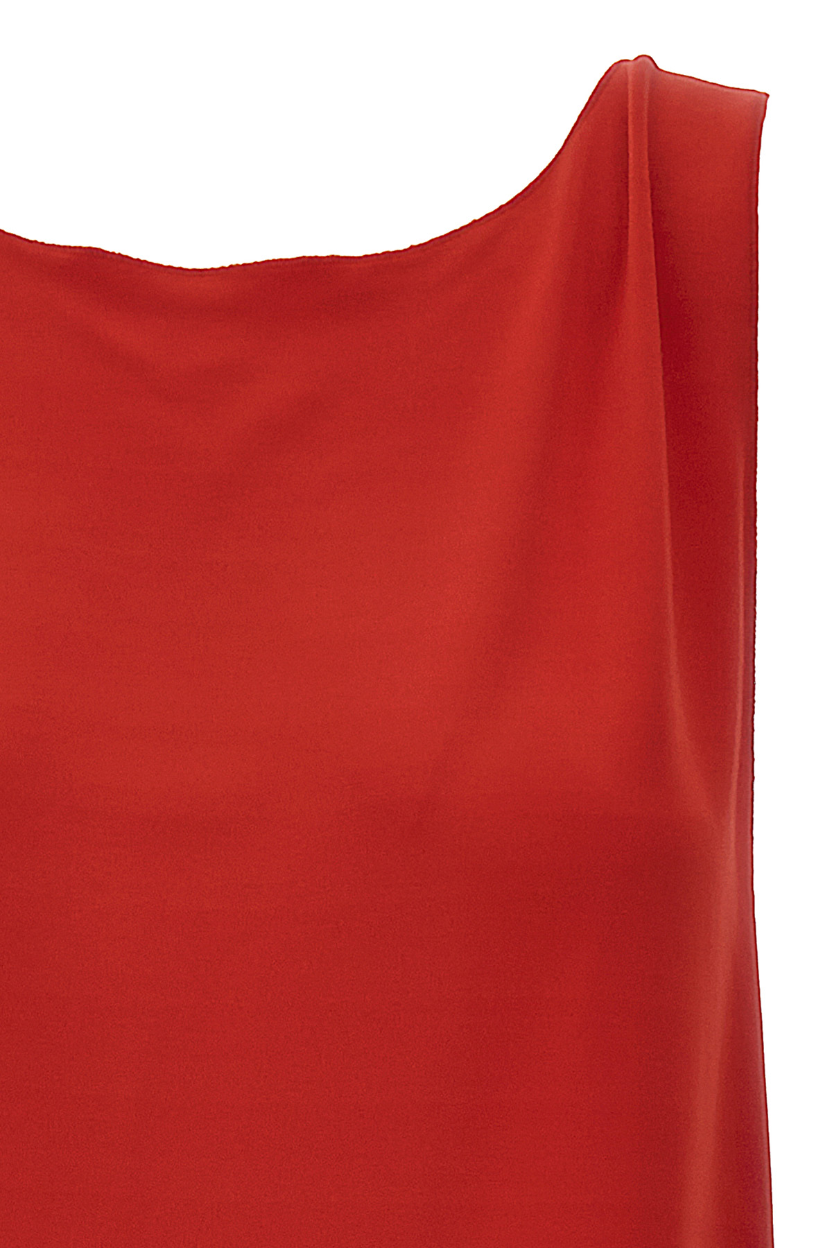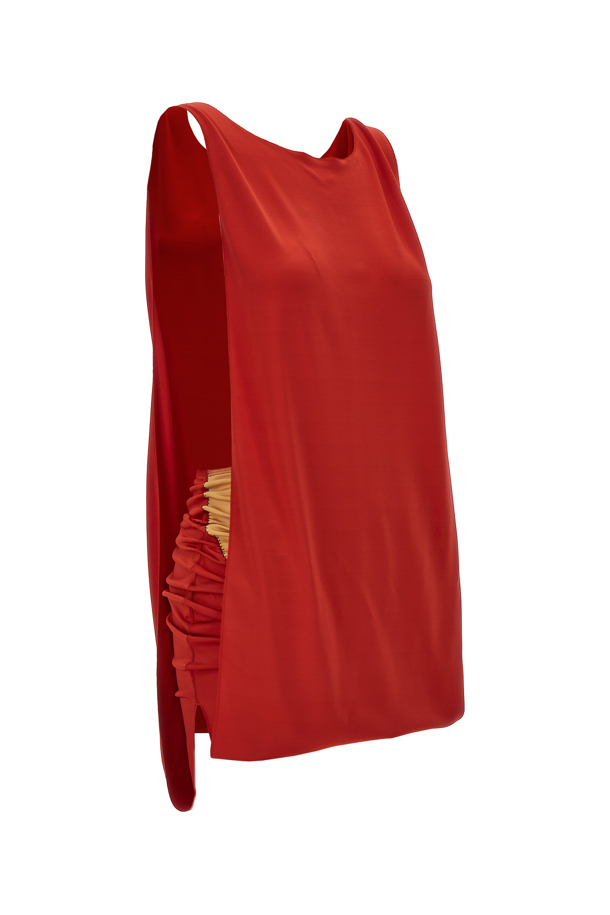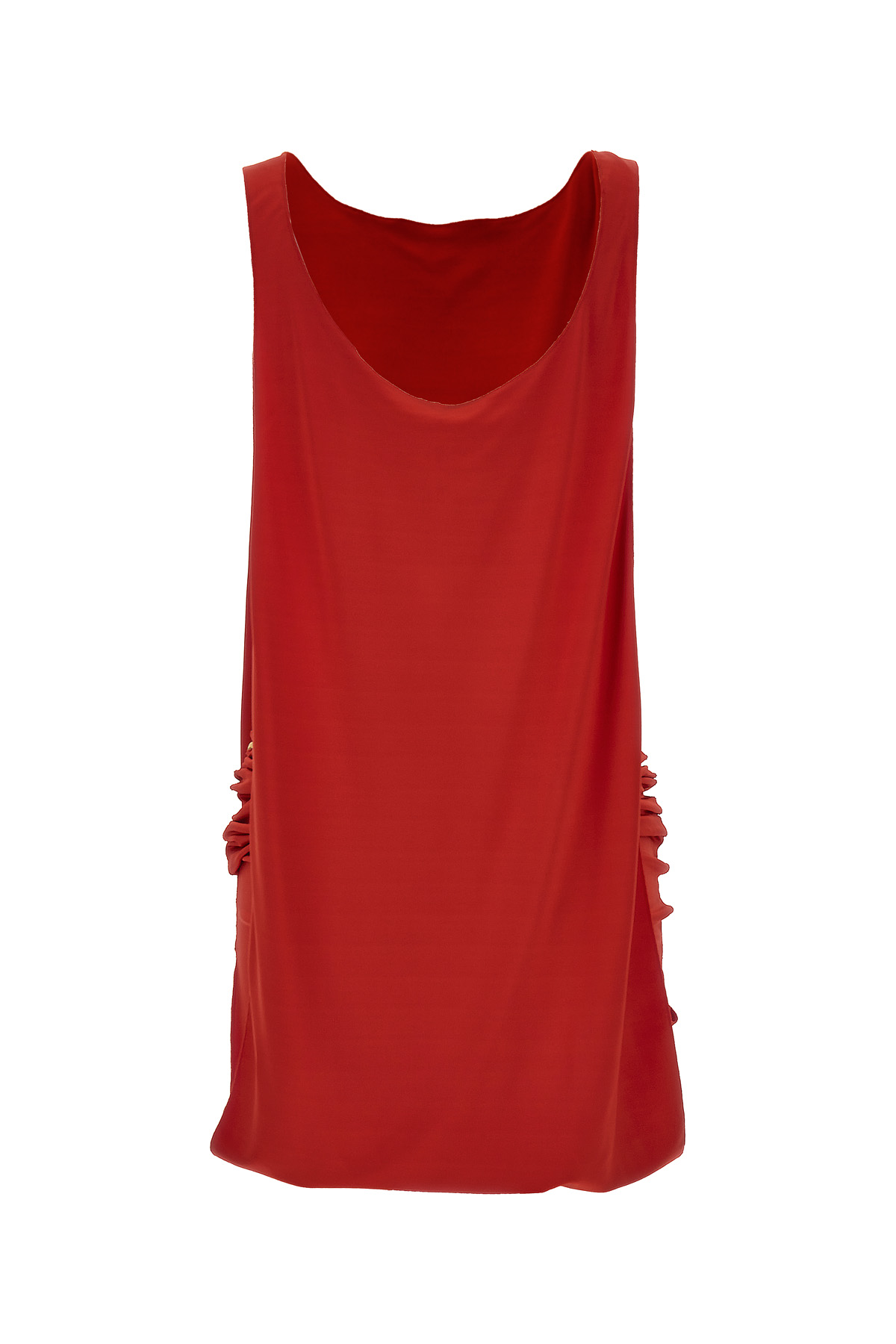 Stretch viscose dress with wide side splits, round neckline, thin straps, patch detail on the hem and gathers.