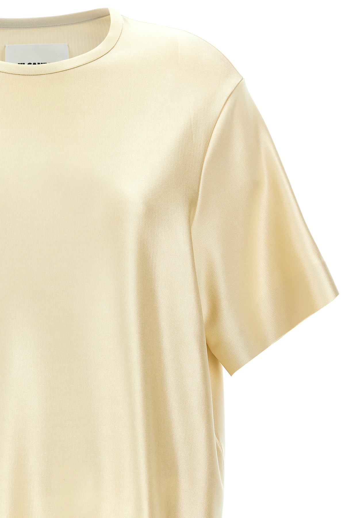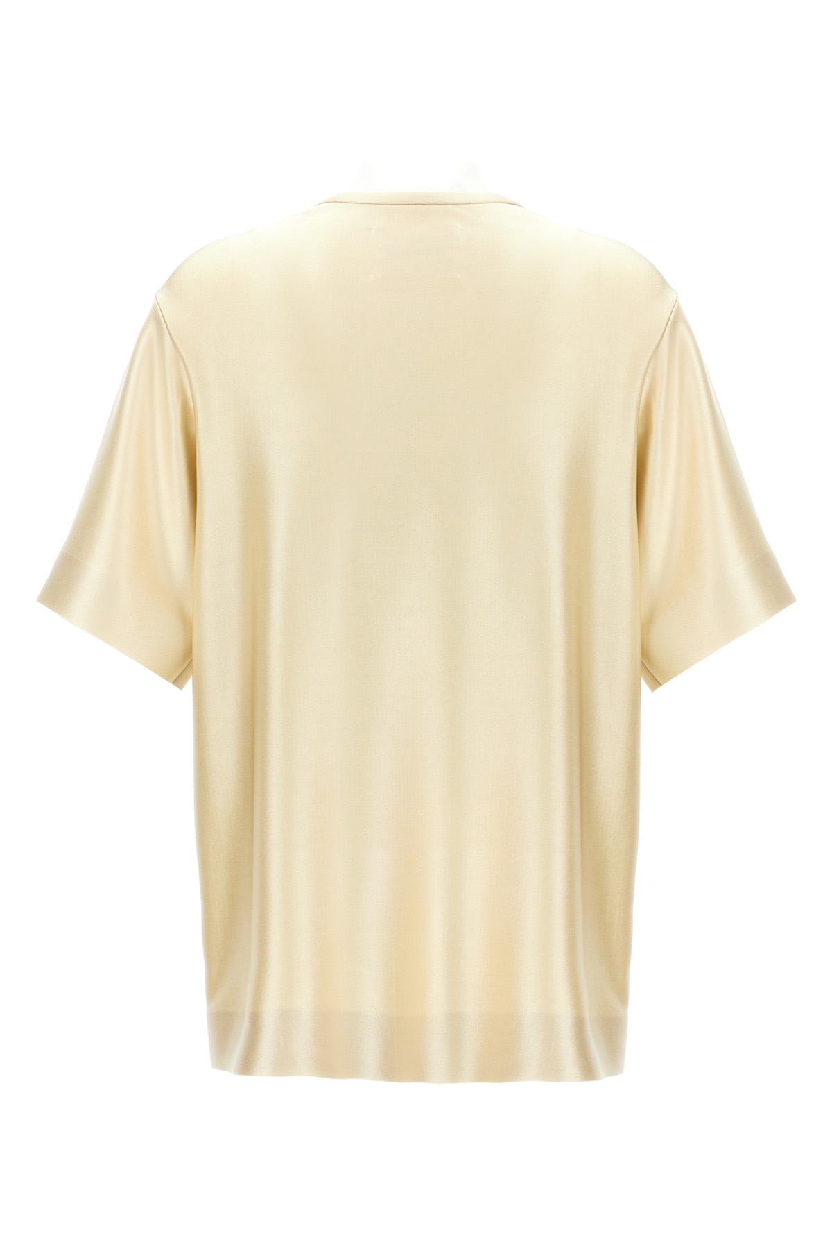 Laminated stretch viscose T-shirt with crewneck and short sleeves.
