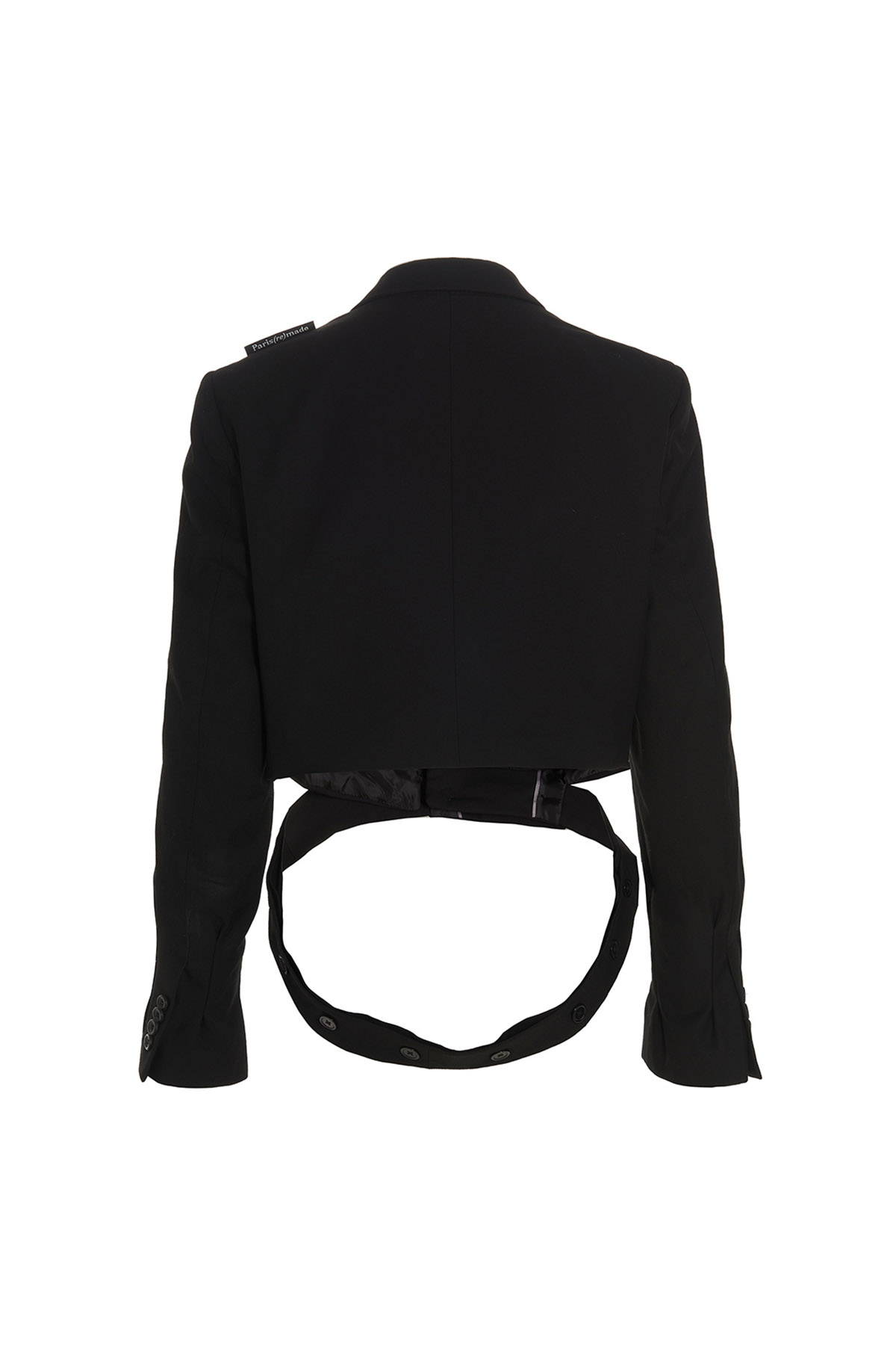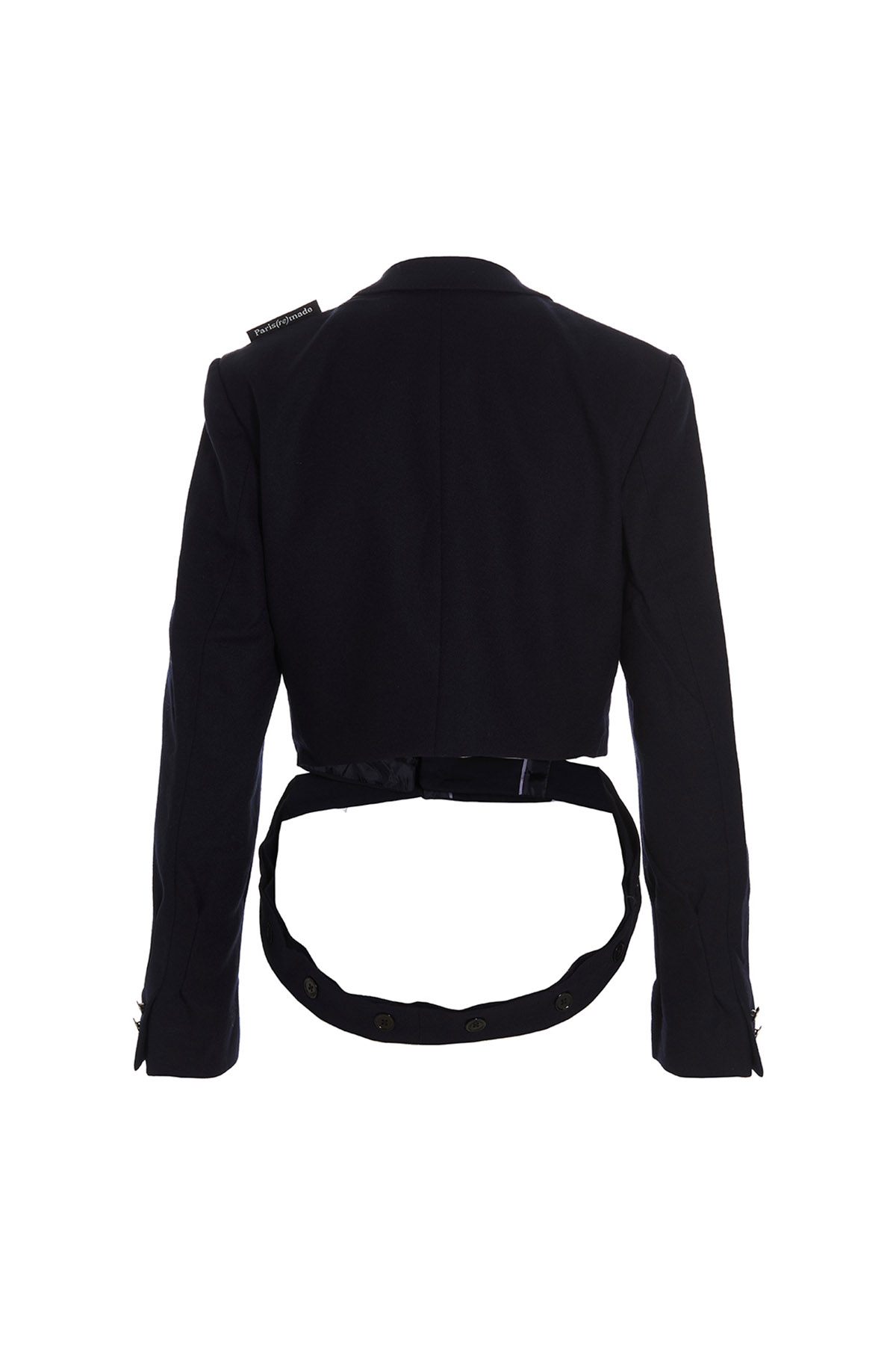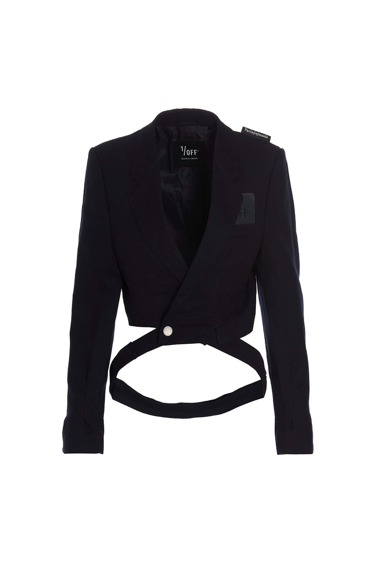 Cropped' single-breasted blazer jacket with button closure, cut-out detail on the hemline, front logo print, long sleeves and a pocket.