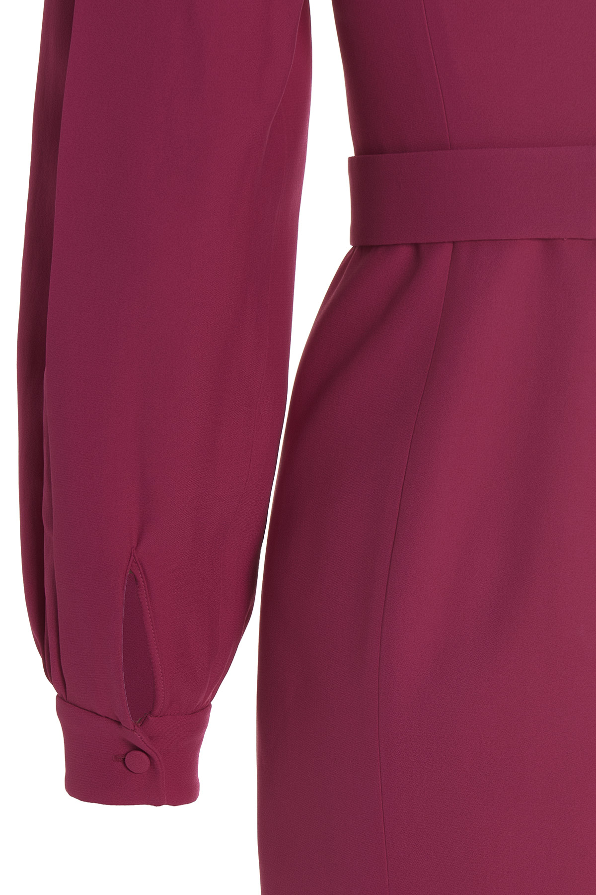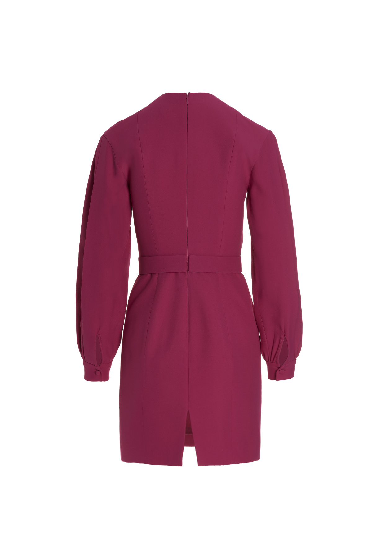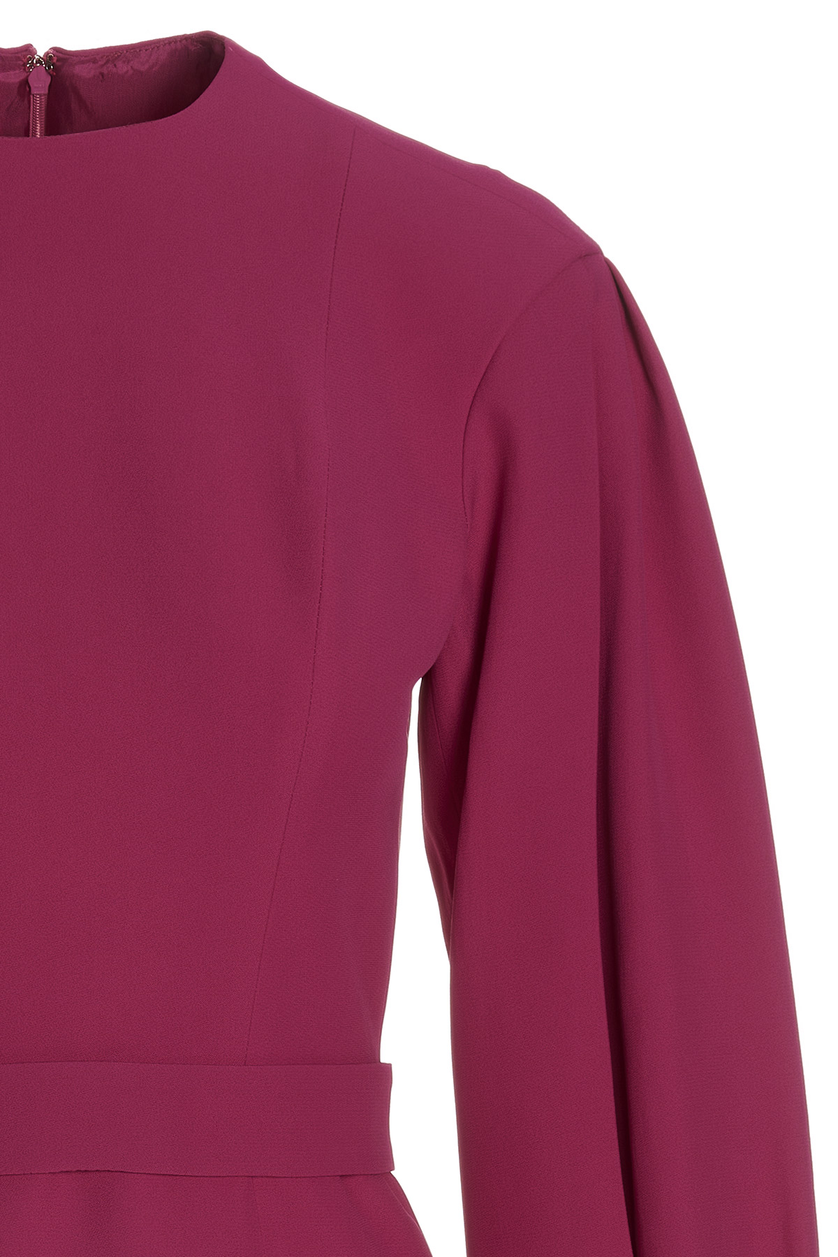 Cady dress with long puff sleeves, a crewneck, a back zip closure and band detail at the waist.