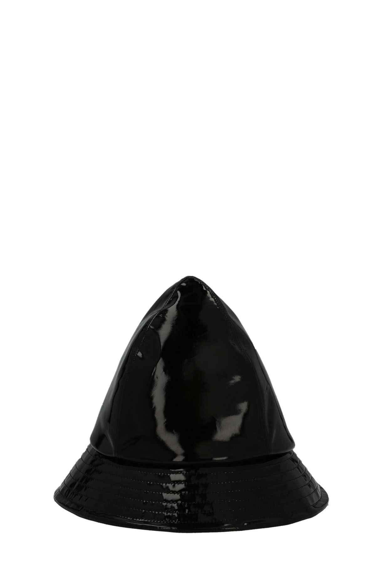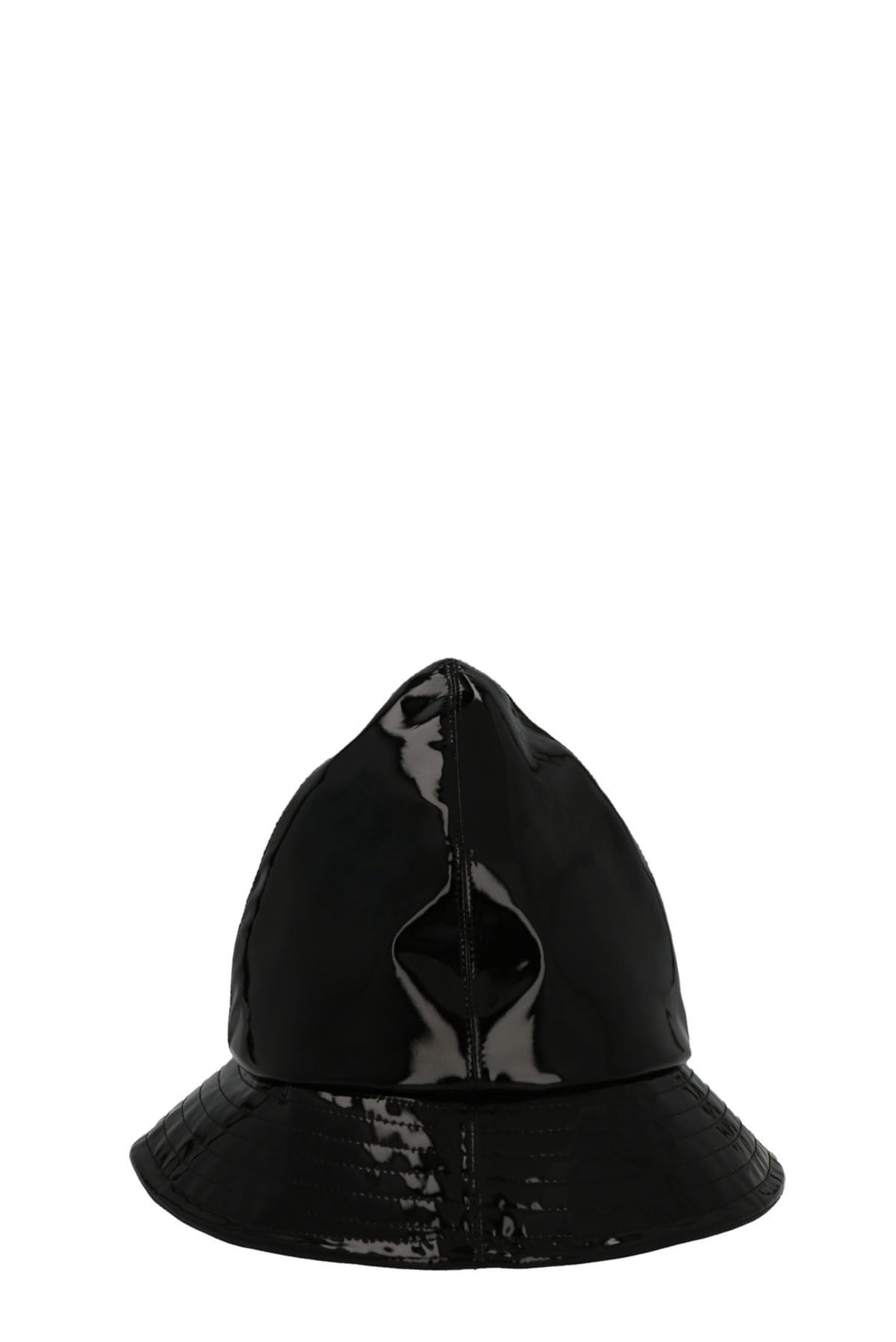 Glossy patent bucket hat with a slightly pointed style.