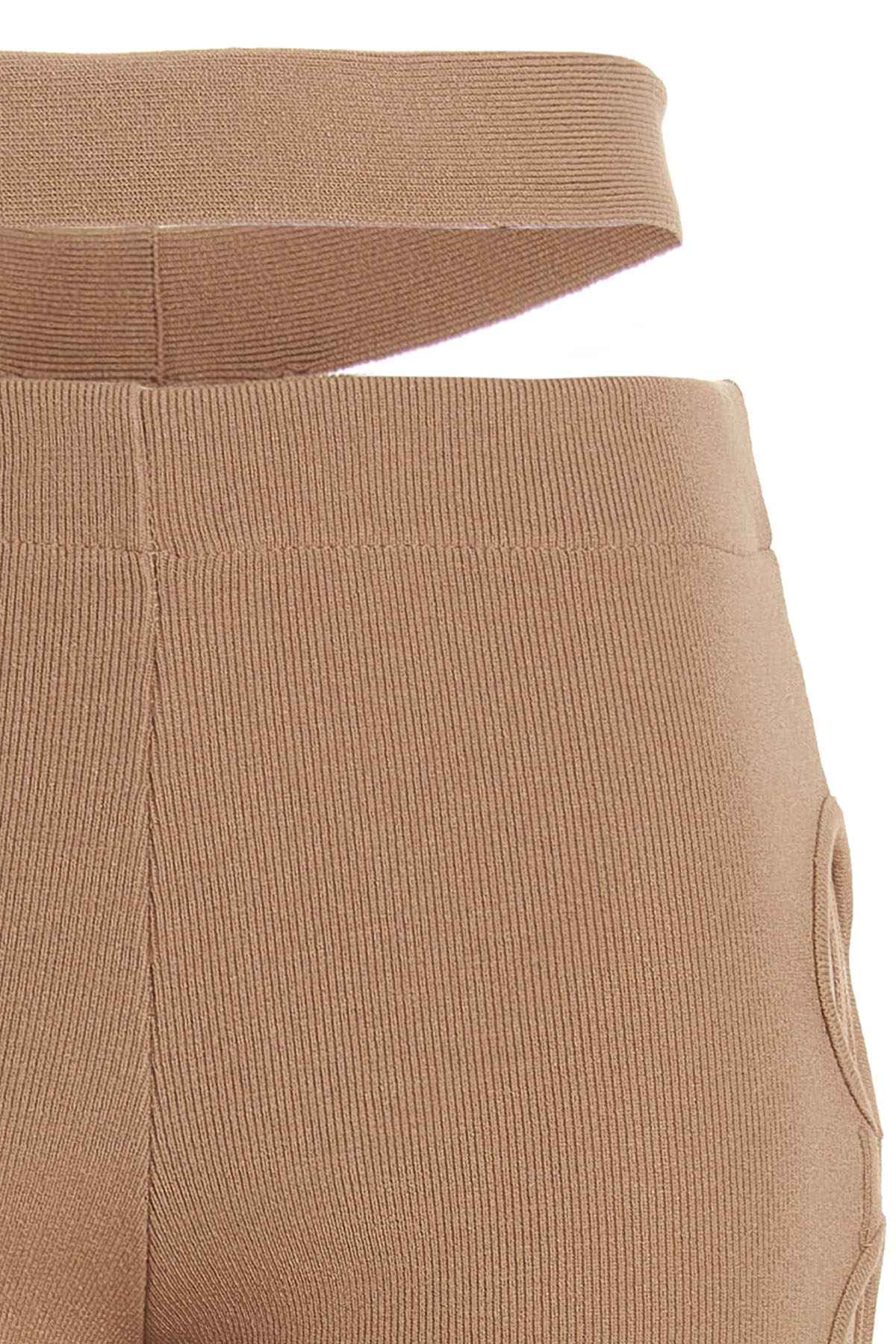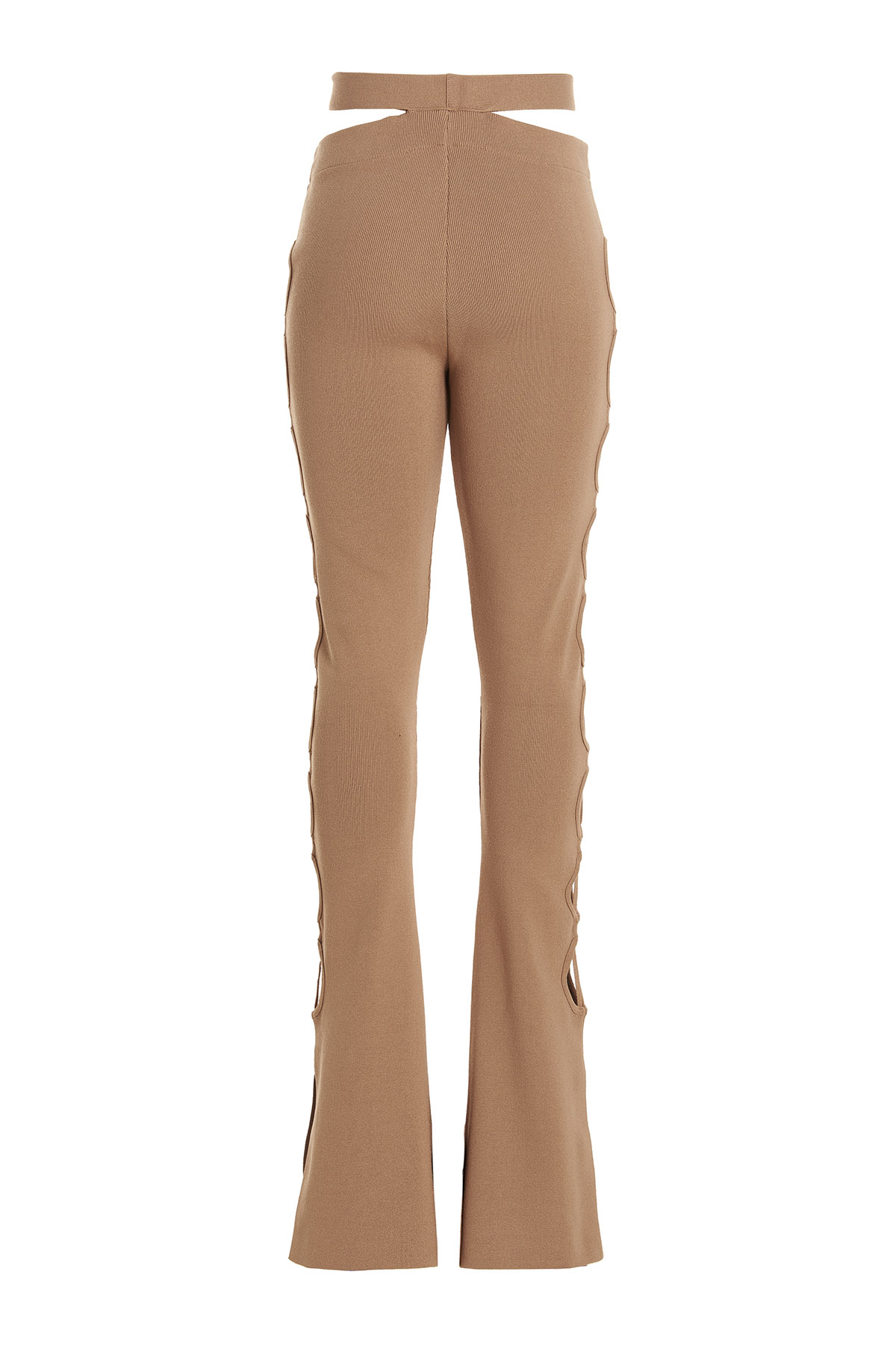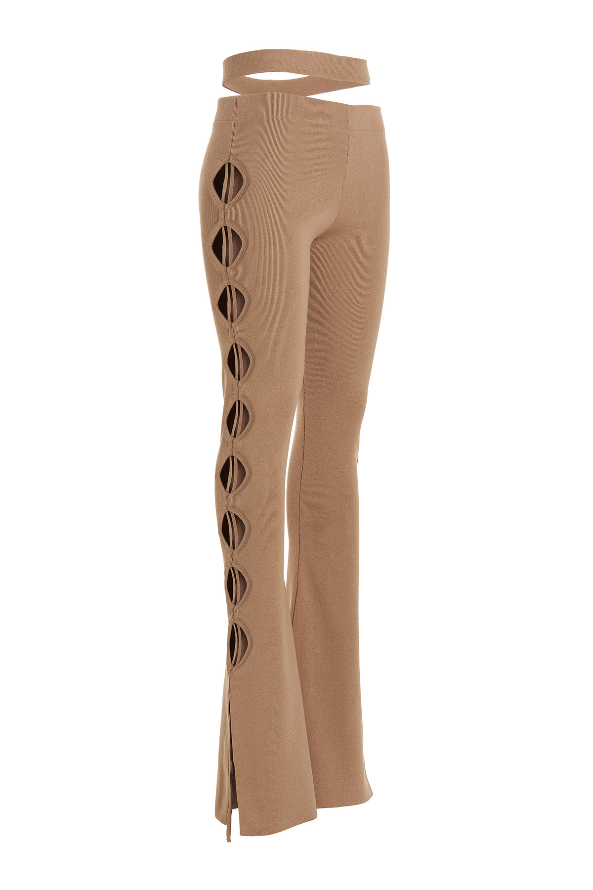 Stretch knit pants with cut out detailing, side ties on the legs, an elastic waistband, and a flared leg.