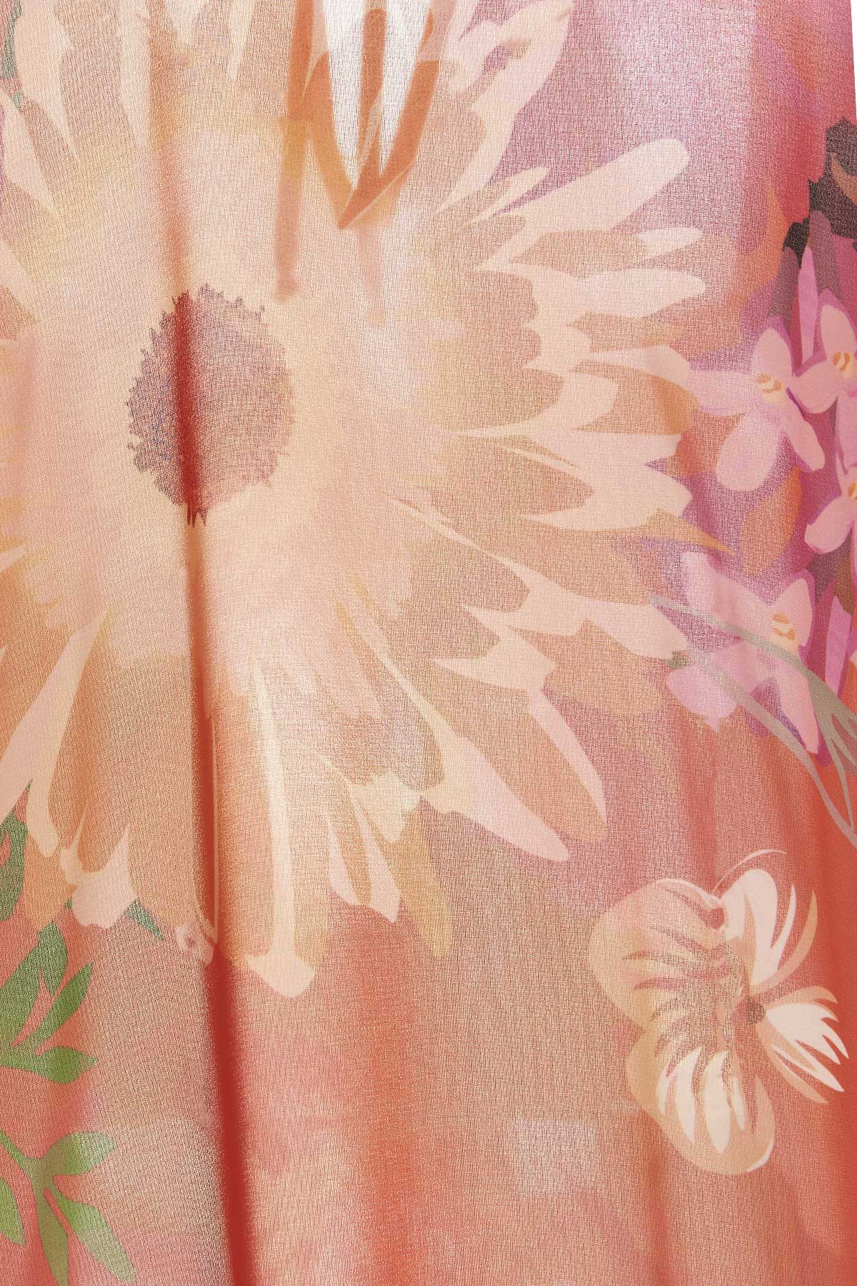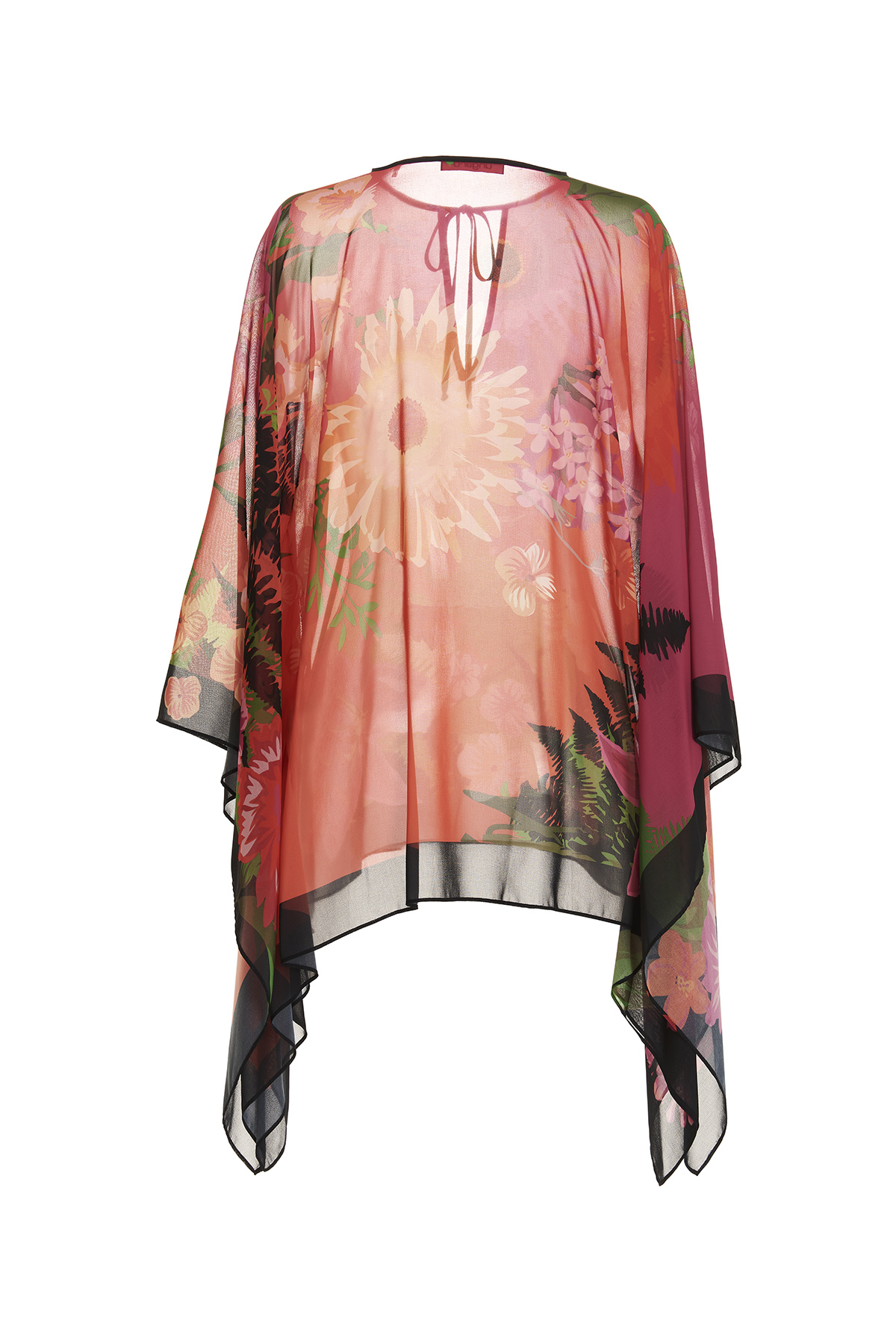 April' blous in a transparent all-over floral print fabric with V-neck with strap, long and wide sleeves and an asymmetric hem.