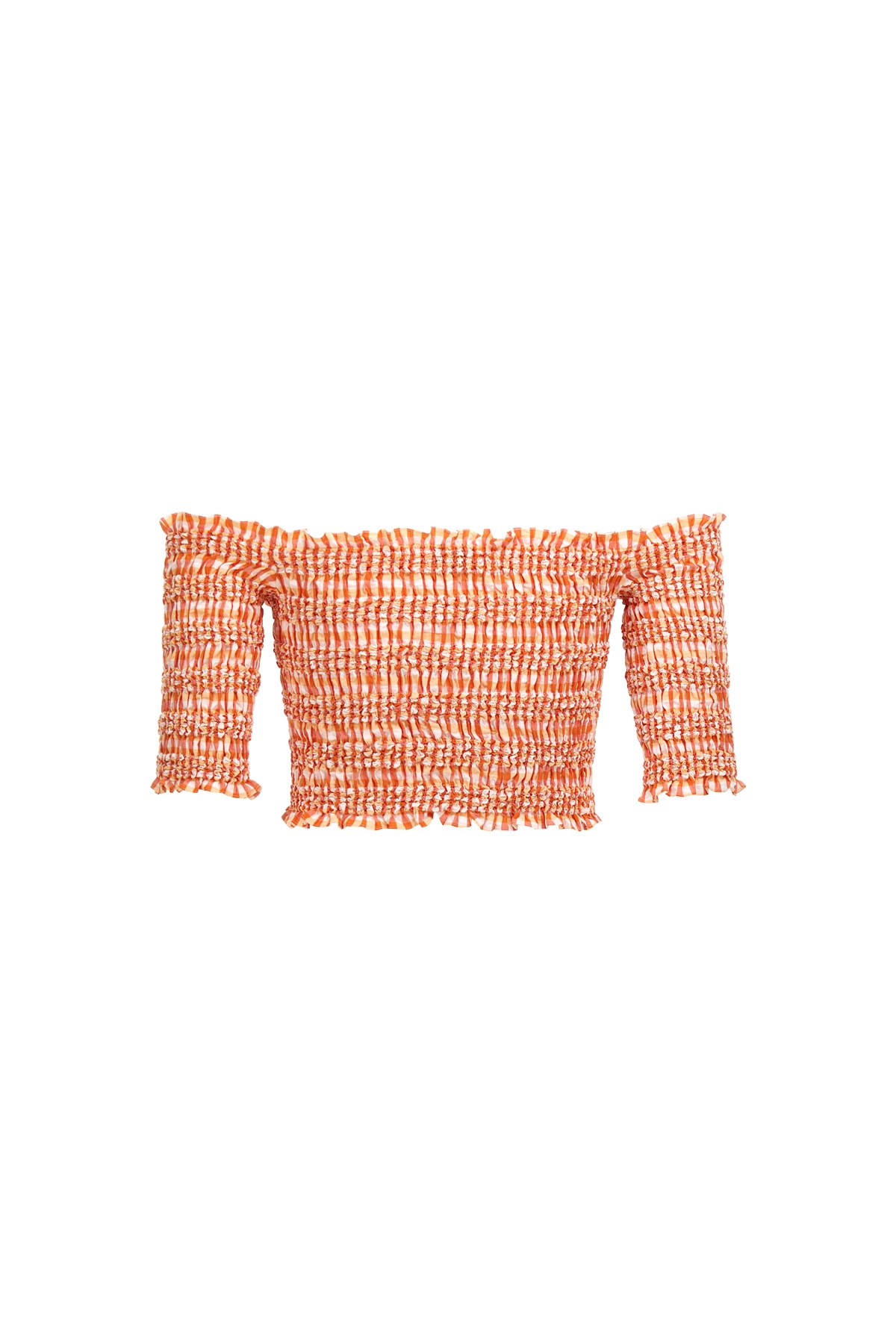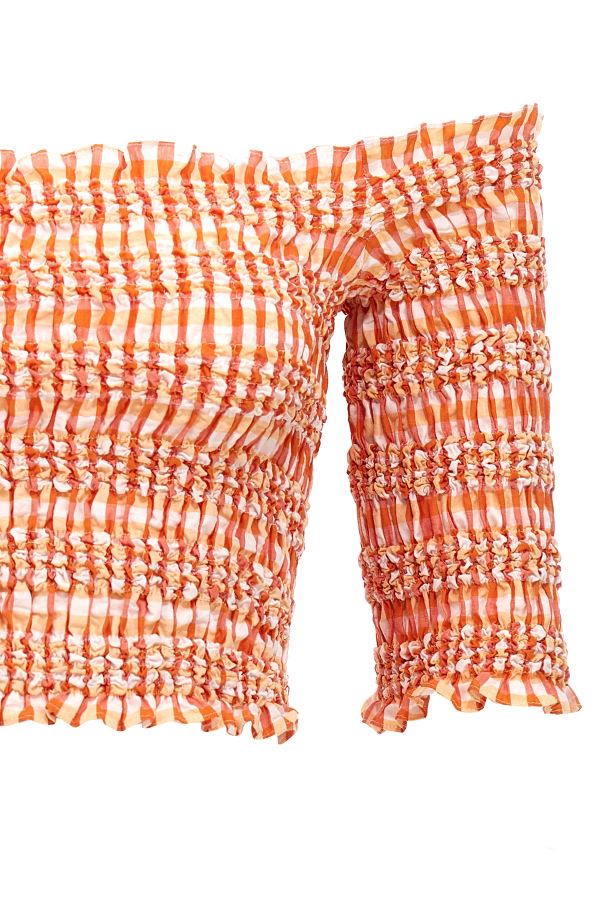 Checked smock stitch cotton cropped top, featuring an off-the-shoulder style with short sleeves.