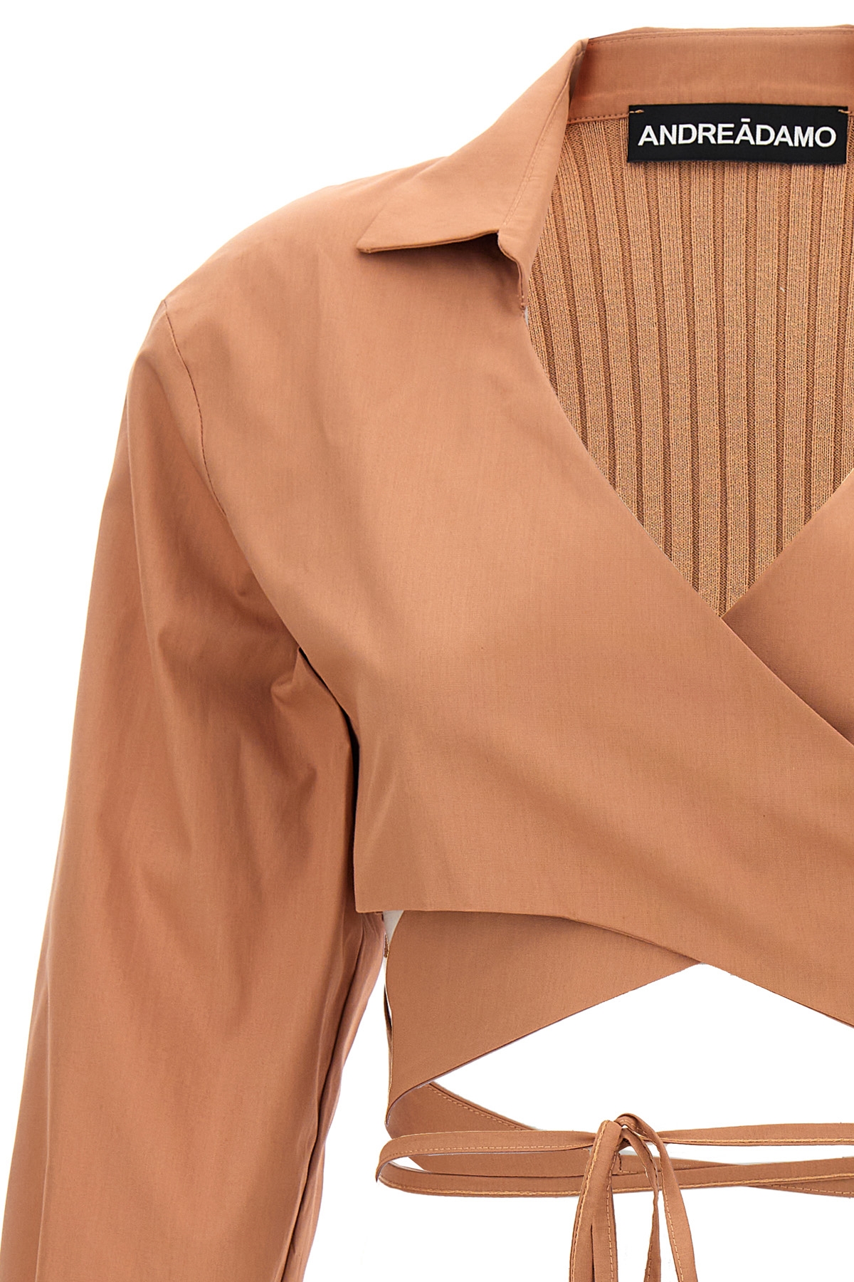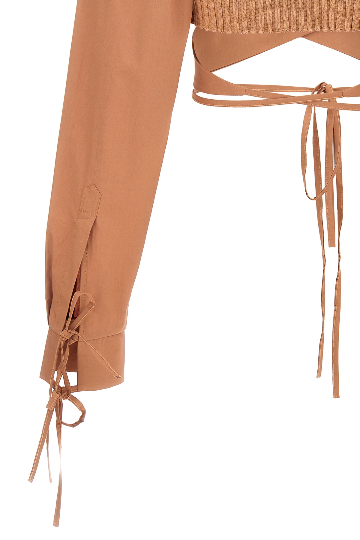 ‘Criss Cross' cotton blend cropped shirt featuring a ribbed knit insert at the back, a V-neck, a wrap closure fastened around the waist, long cuffed sleeves and lacing.