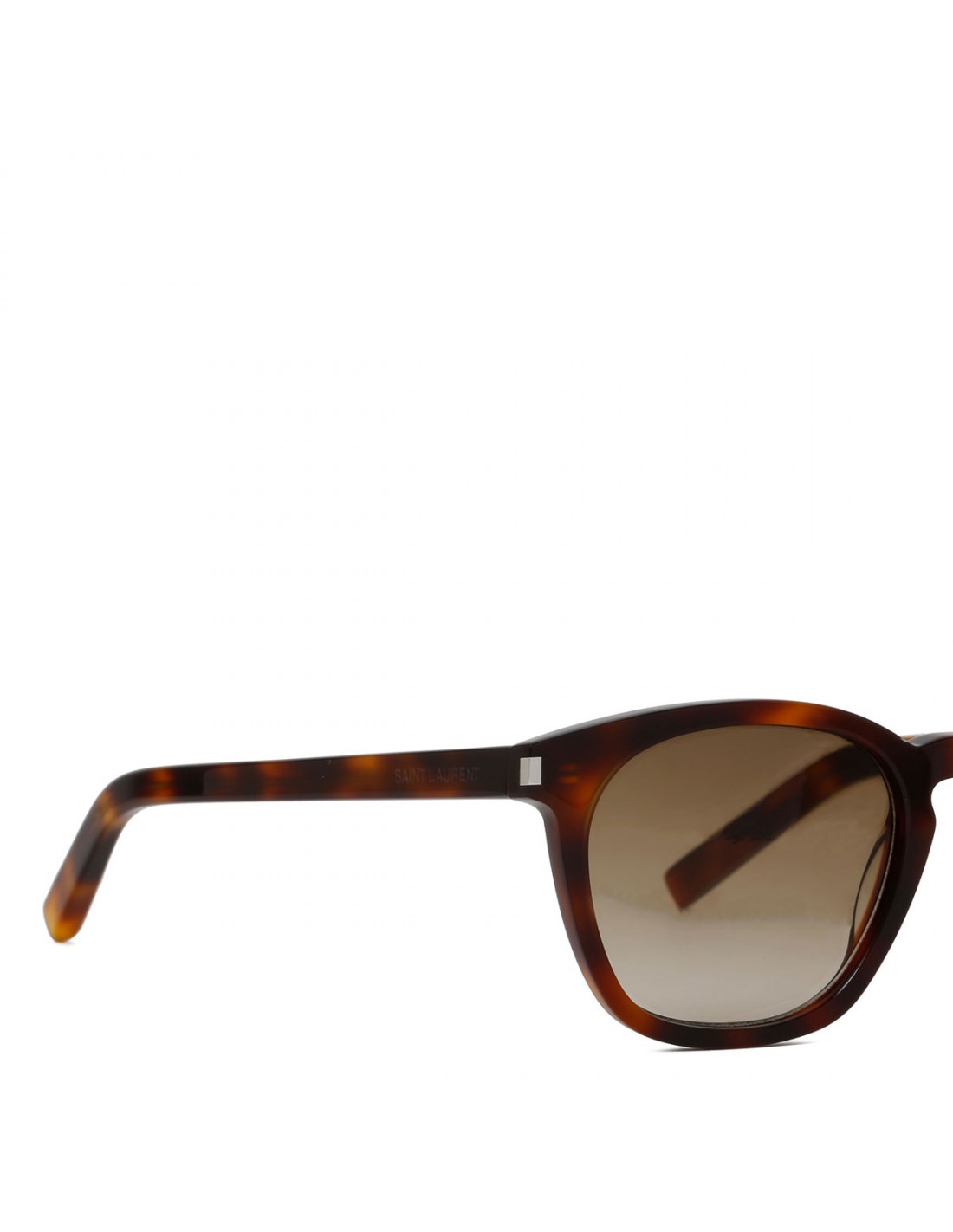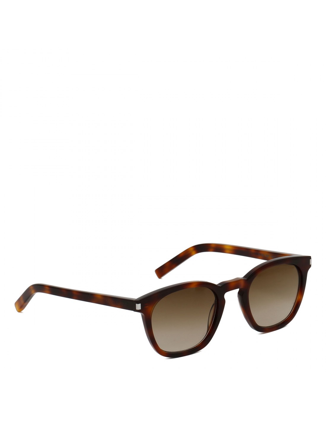 Havana brown tortoiseshell acetate SL 28 sunglasses from Saint Laurent featuring rounded frame, keyhole bridge, logo engraved temples and nylon lenses with 100% UVA/UVB protection.