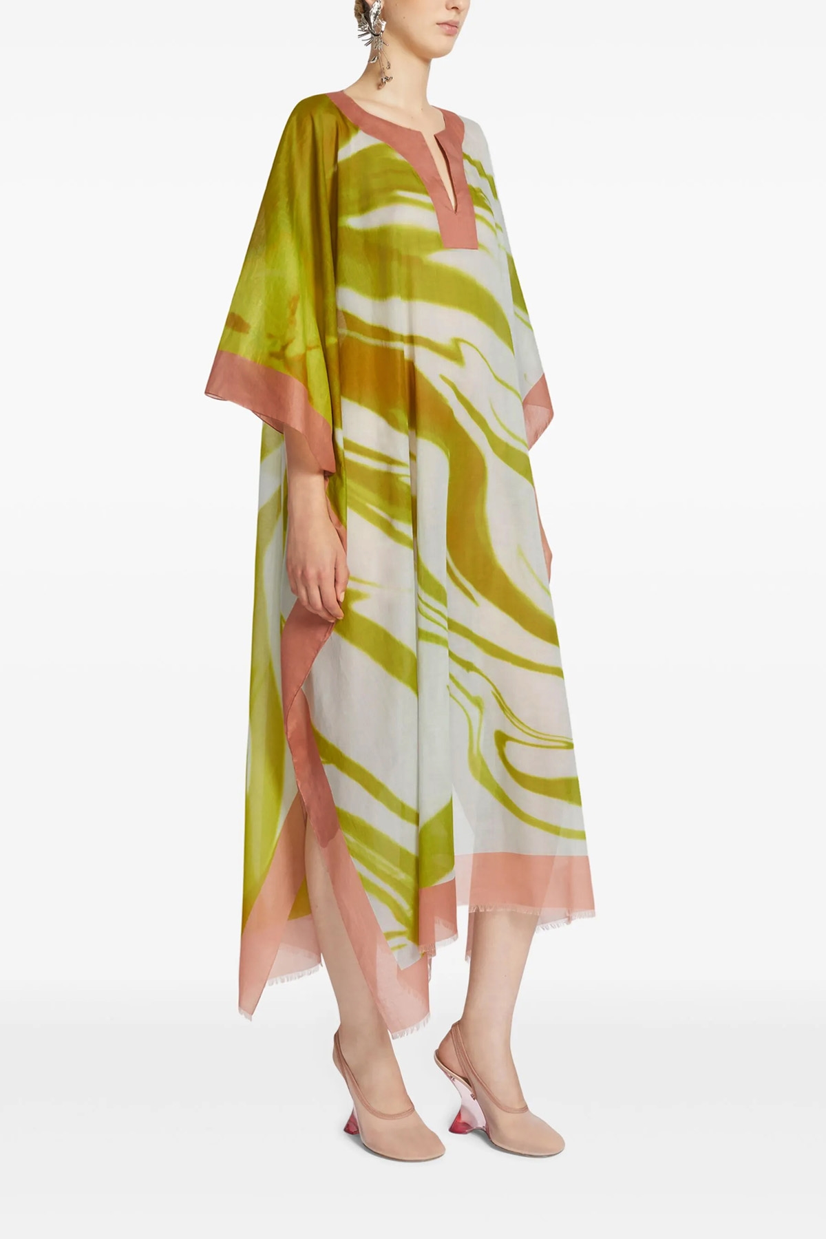 'Cartland' printed cotton kaftan with contrast piping, V-neck, side slits, 3/4 wide sleeves, fringes on the hem.