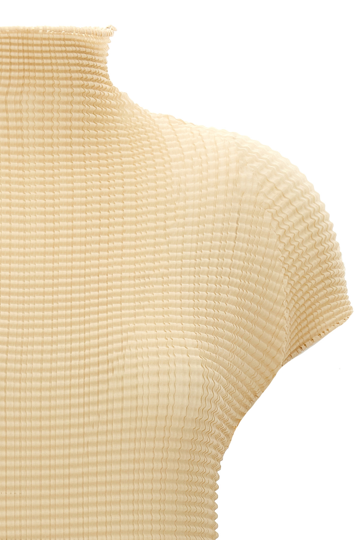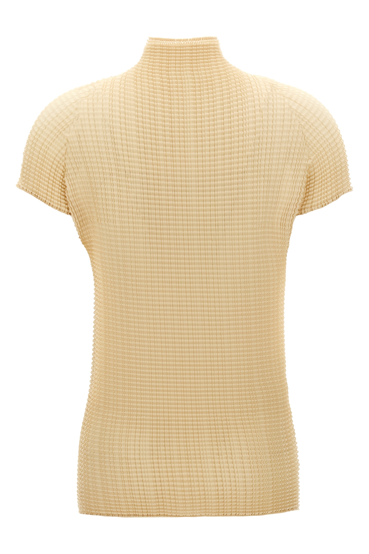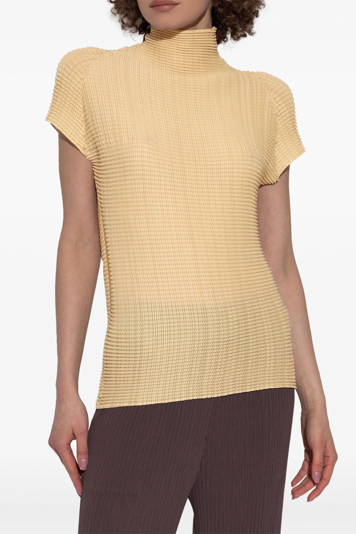 'Wooly Pleats-56' pleated fabric t-shirt with high neck, short sleeves. SUSTAINABLE: Product made from recycled polyester.